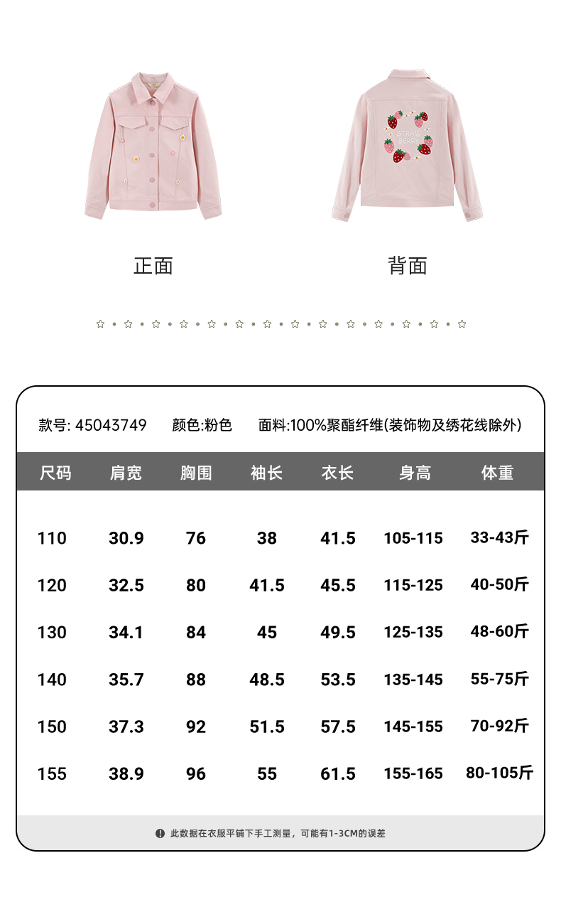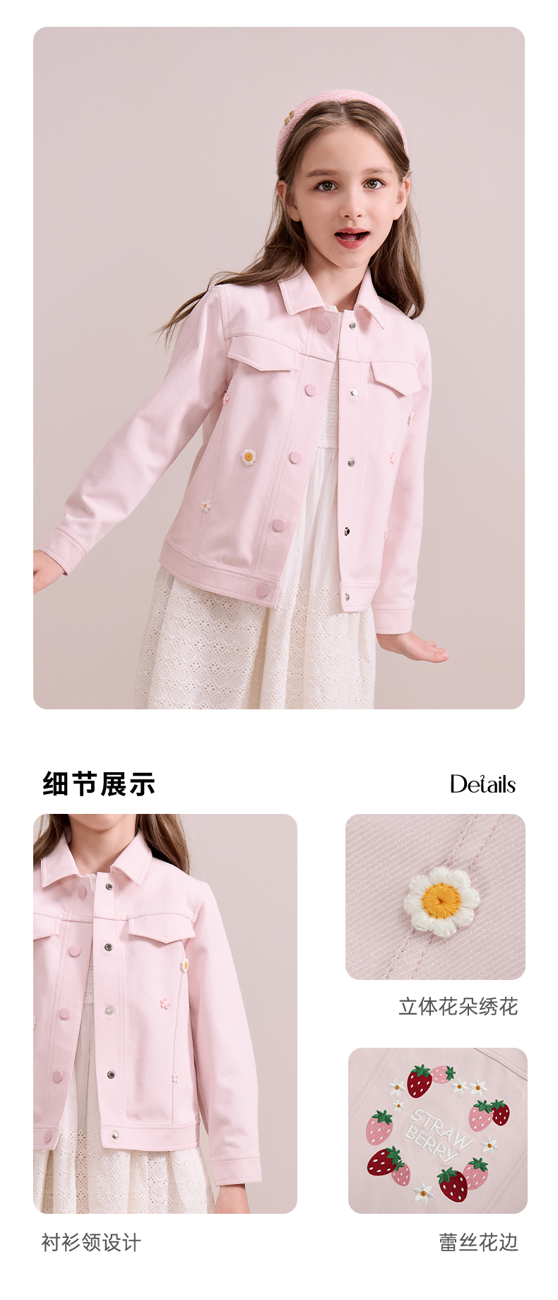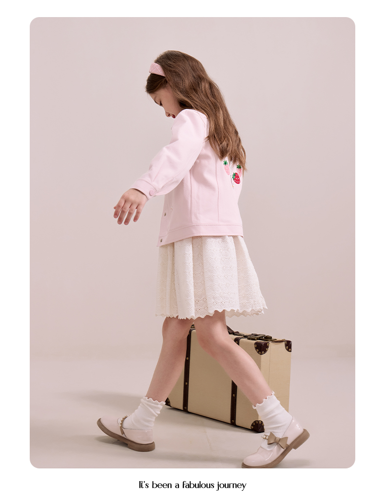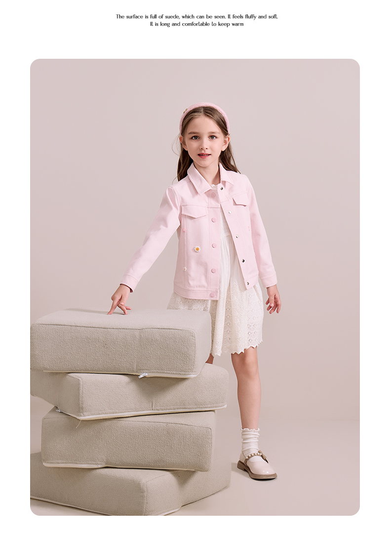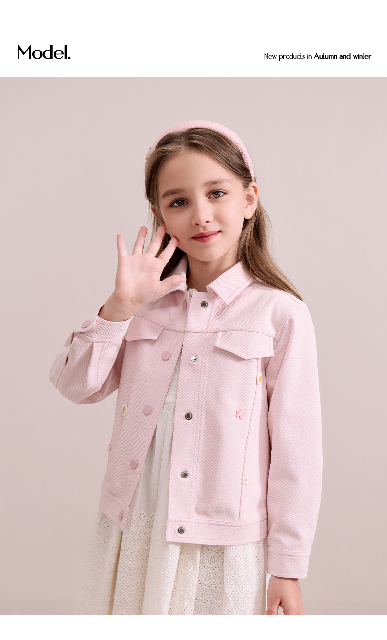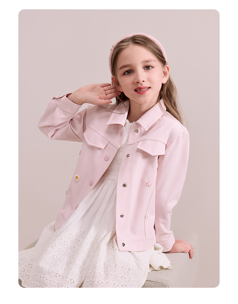 mettekids儿童粉色牛仔外套2024秋新款女童绣花正肩中空纱夹克