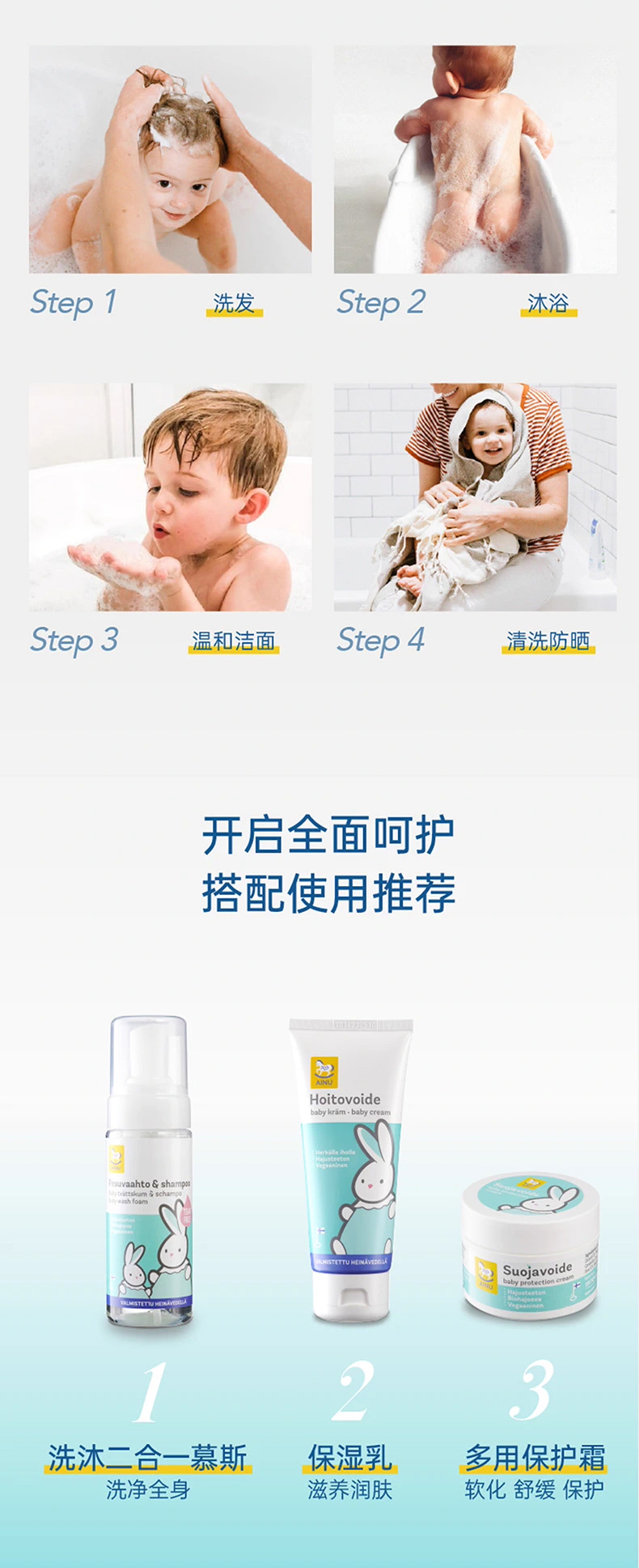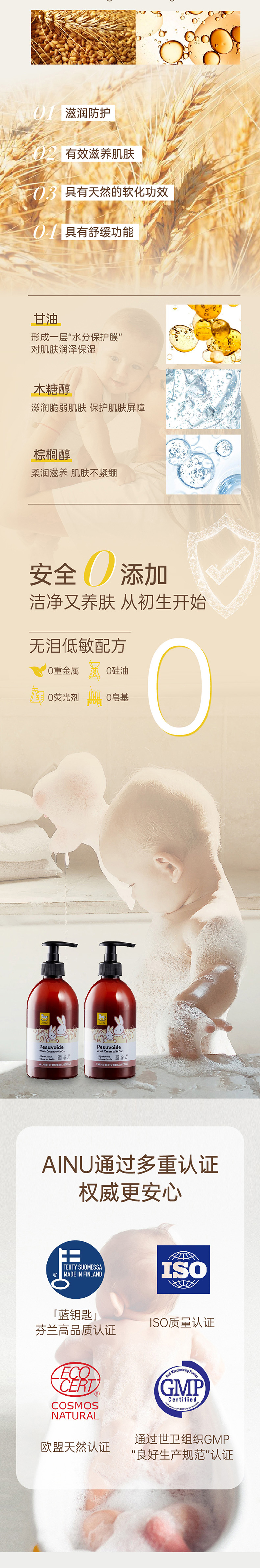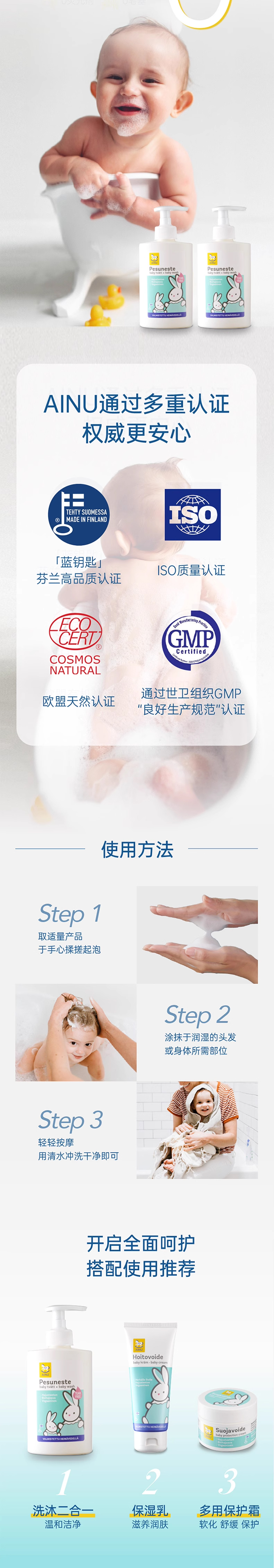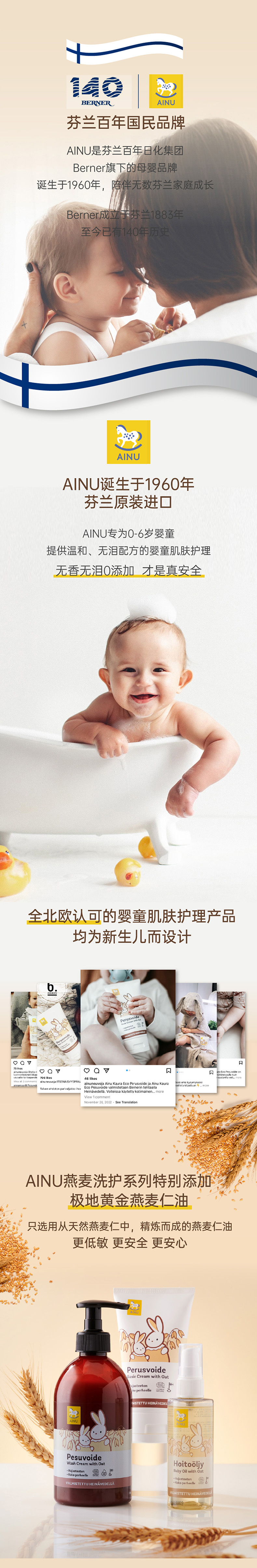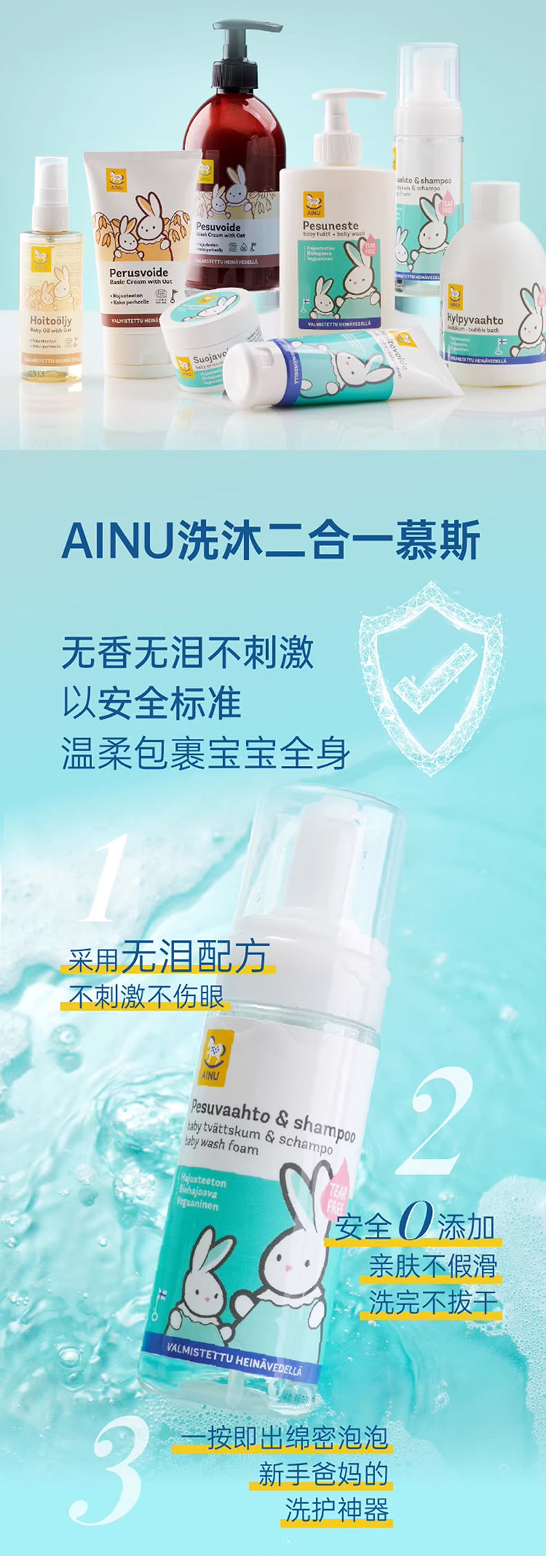 芬兰AINU国民儿童洗护 安心特护系列&燕麦特润系列 低敏温和 无香无泪配方 0有害添加 亲肤不刺激