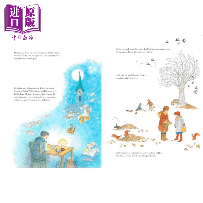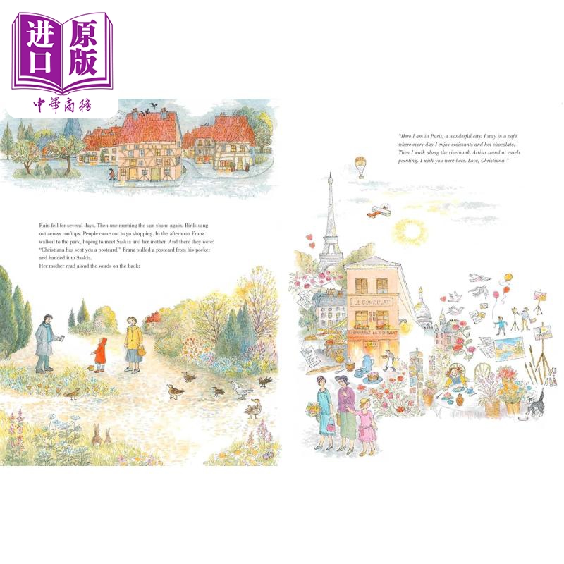 While strolling through the park, Franz Kafka hears the cry of a young girl named Saskia sitting with her mother. When Franz learns that the child has lost her beloved doll, Christiana, Franz reassures her that her doll is traveling the world. Upon their next fortuitous meetings, Franz presents Saskia and her mother with postcards from the lost doll--one from Paris, another from Venice, and finally one from Egypt. When Saskia insists that her doll Christiana come home from her travels, Franz is distraught until he finds a vintage doll in a secondhand shop. Saskia is skeptical--the doll looks old. But when Franz reminds her that we all age from our amazing journeys through life, her heart bursts with joy at their being reunited.