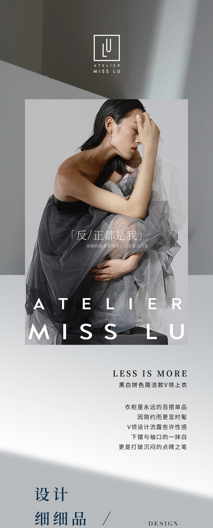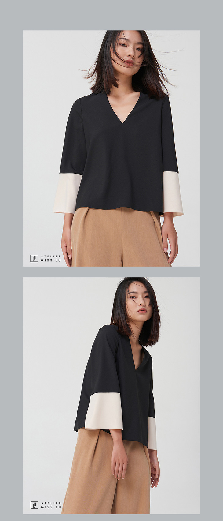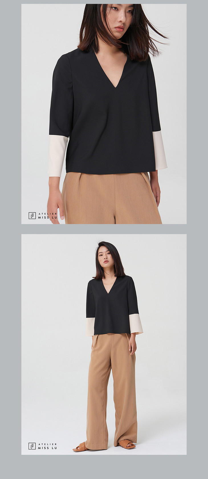 AtelierMissLu-【LESS IS MORE】 黑白拼色简洁款V领上衣