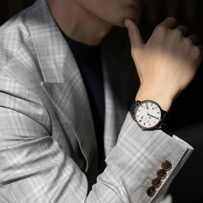 镜面 材质 | 蓝宝石水晶玻璃 | 表盘 | 精钢表壳 电镀灰色颗粒纹表盘,配5N纯金压嵌罗马数字时标,带蓝色涂层;时针/分针:蓝钢;秒针:蓝色涂层;闰年指示:蓝钢 透底 星期 月份 大日历 万年历 月相 |