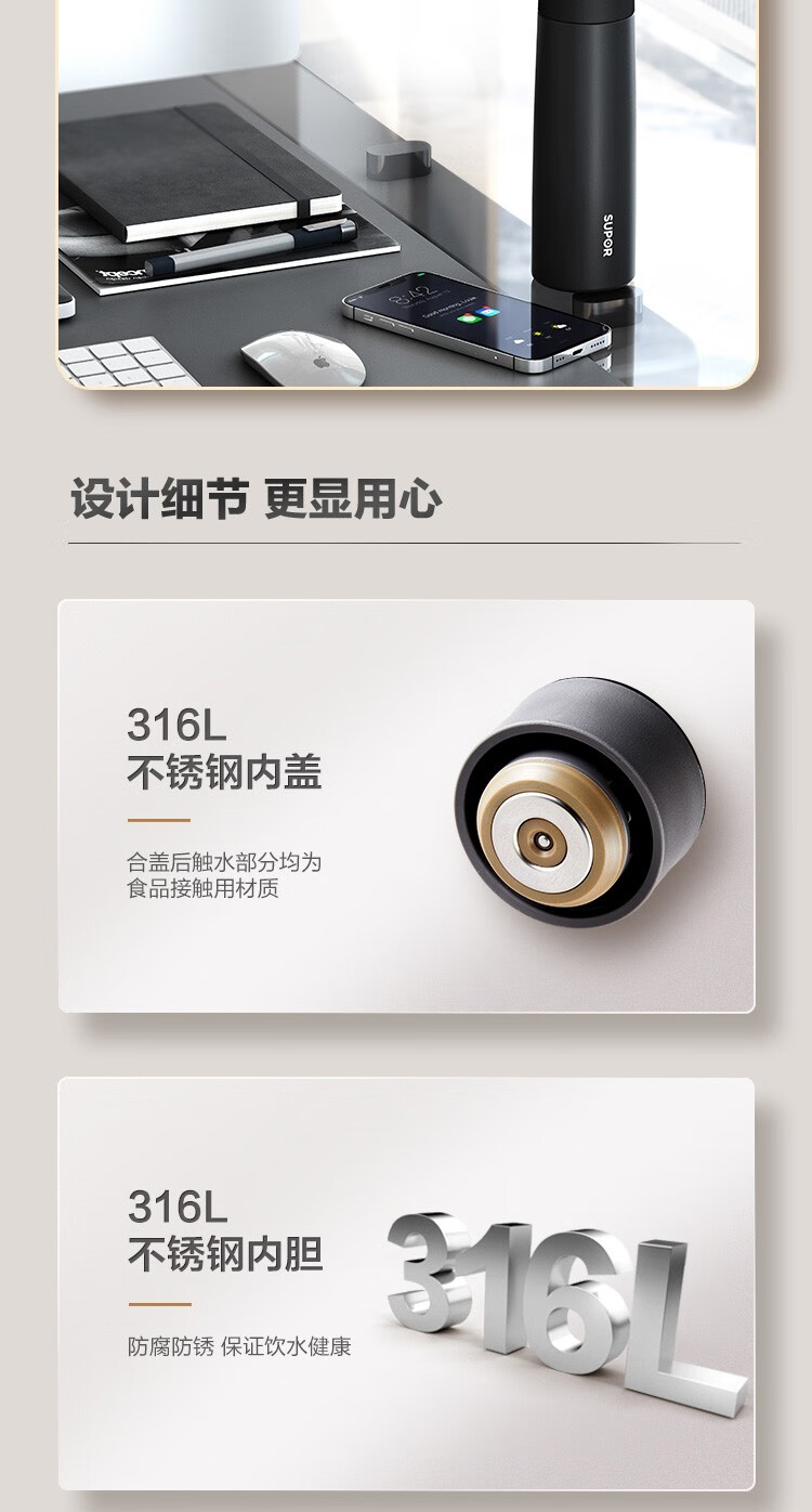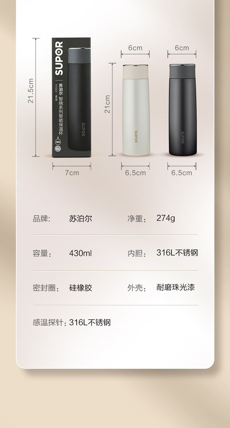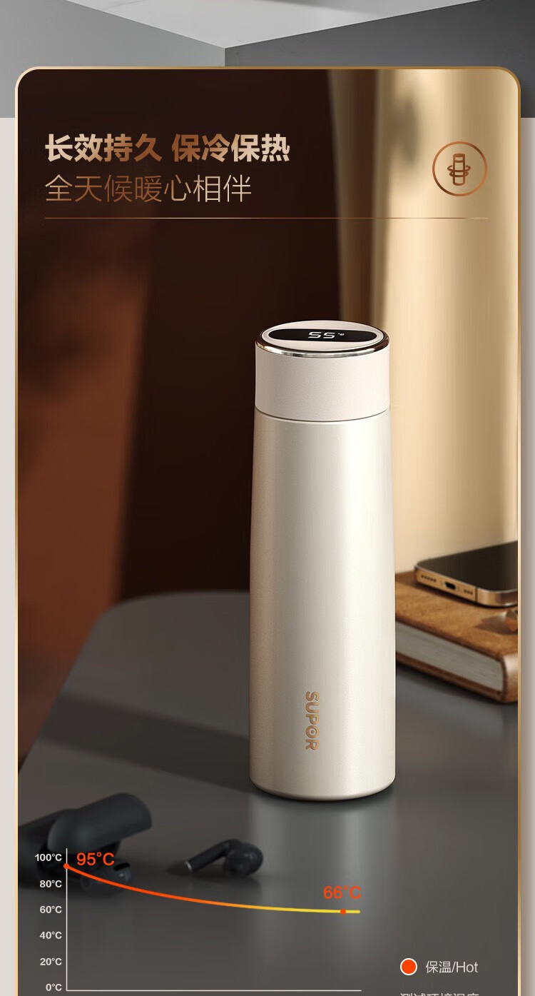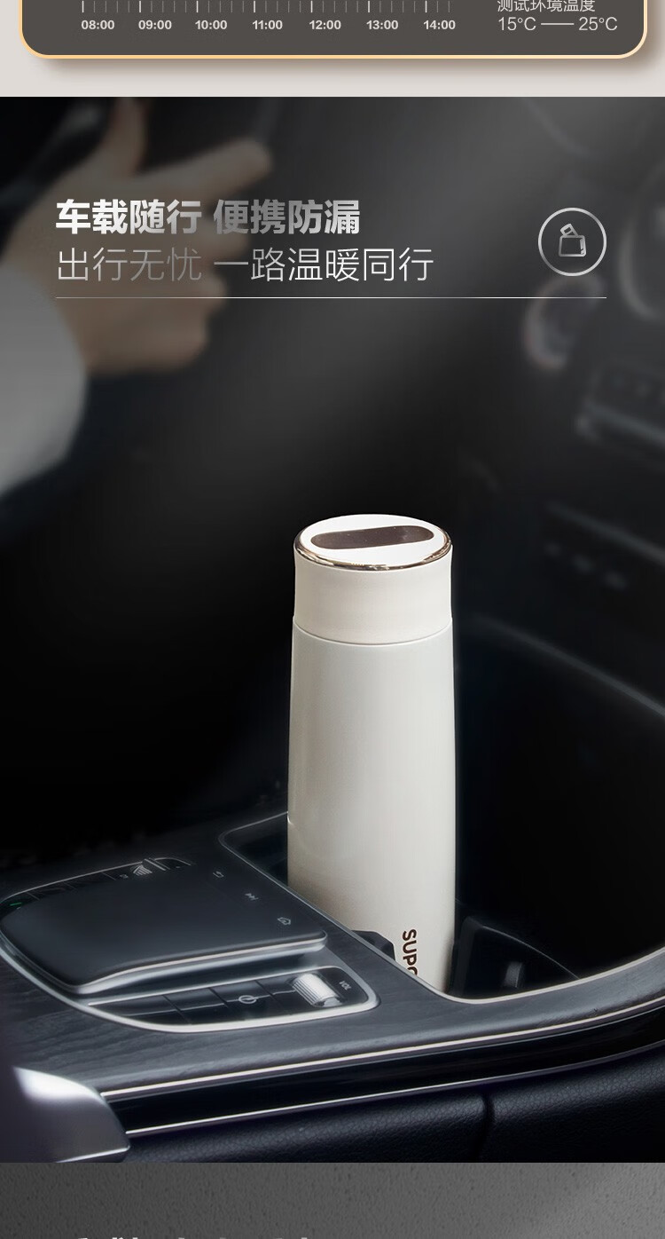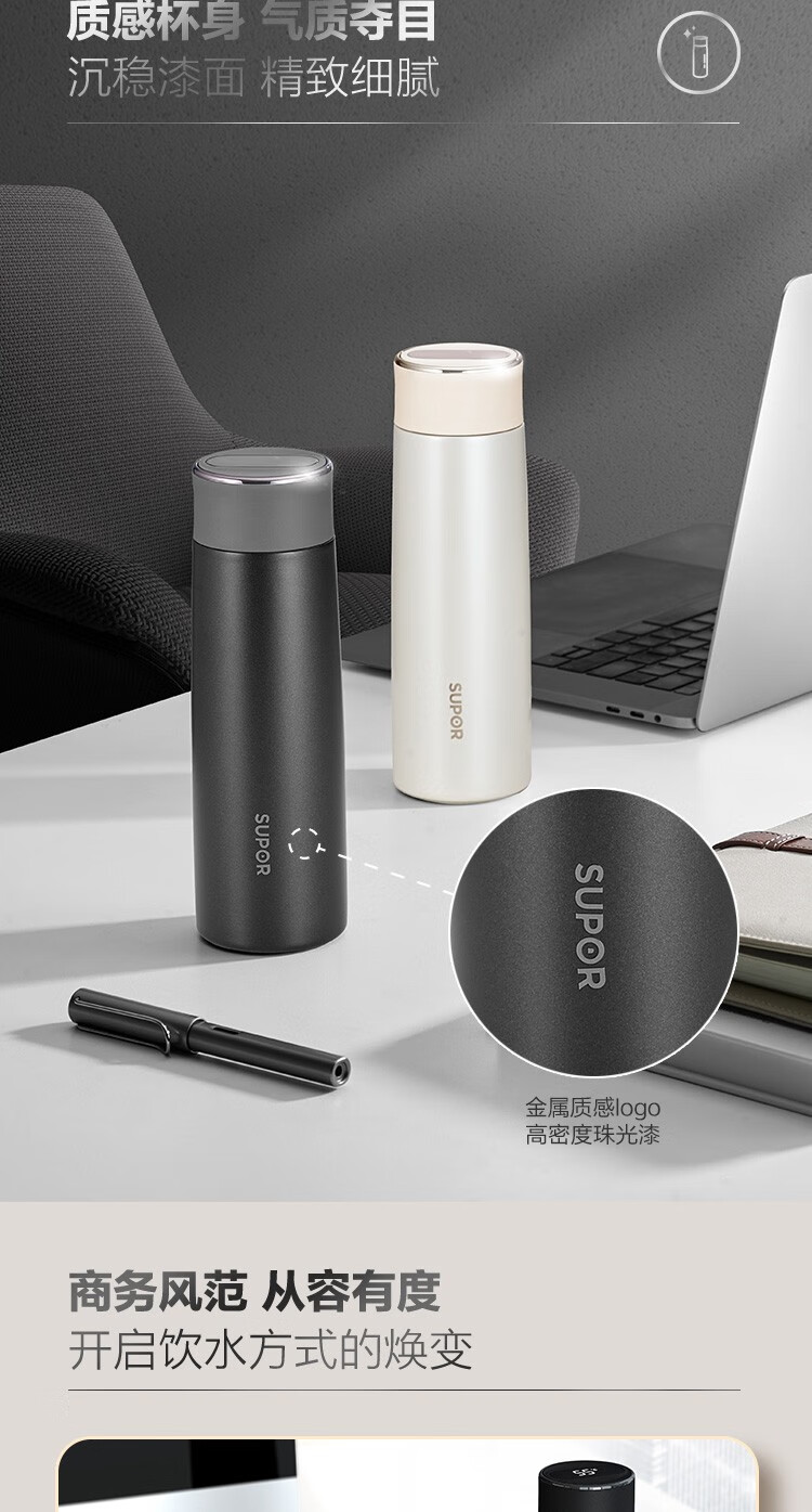 苏泊尔(SUPOR)智晓保温杯高真空铜芯保温保冷316L不锈钢LED屏显杯身钢琴烤漆工艺 KC43HW10晶石黑430ML