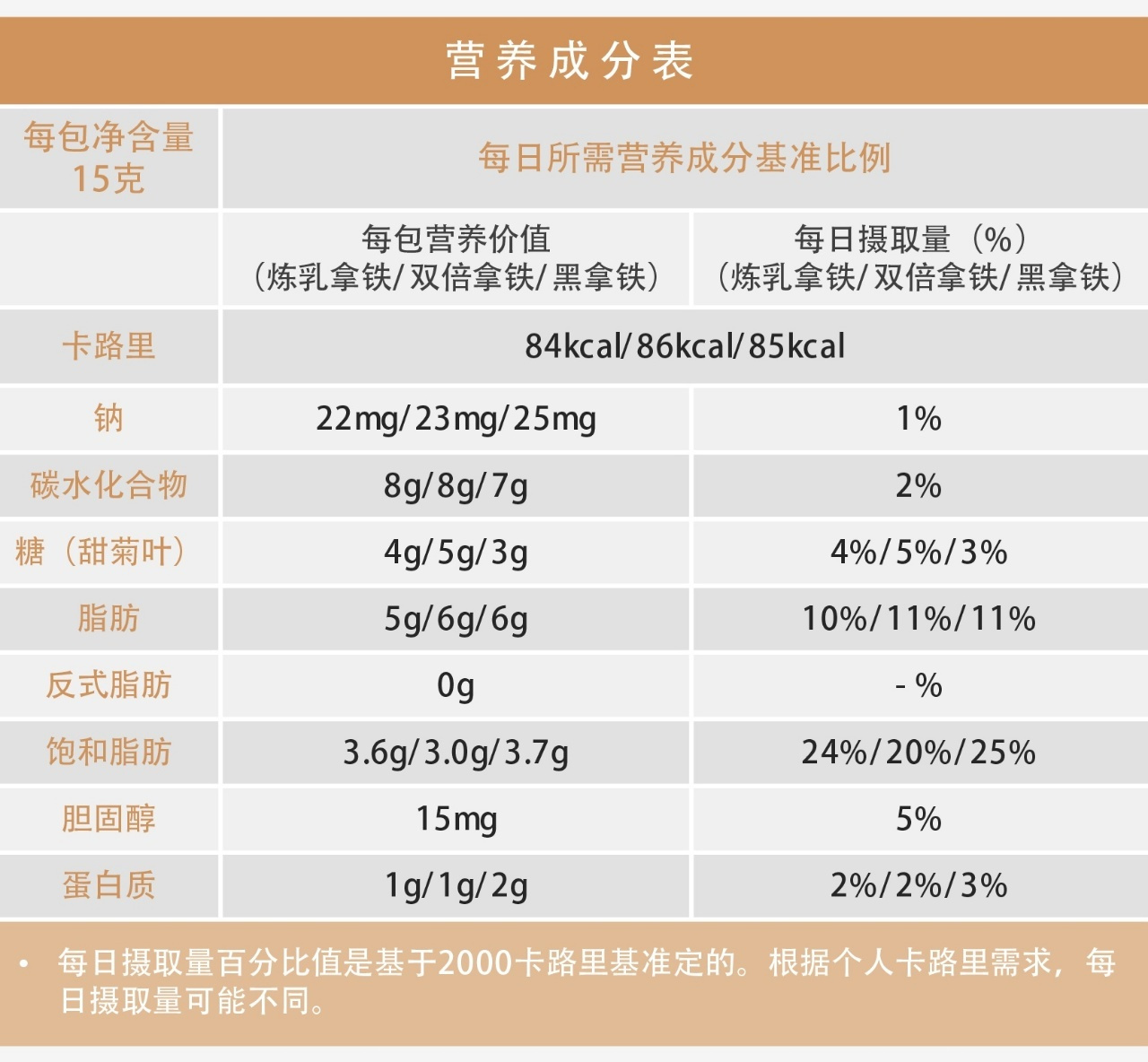 ☕双倍拿铁——浓郁的咖啡烘焙风味,咖啡和牛奶的完美融合,味道极佳(15g,86kcal)