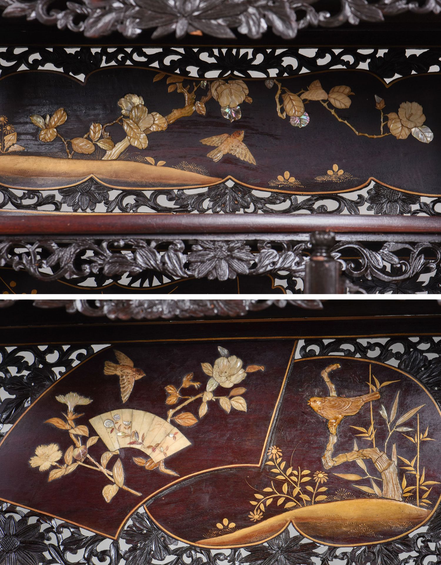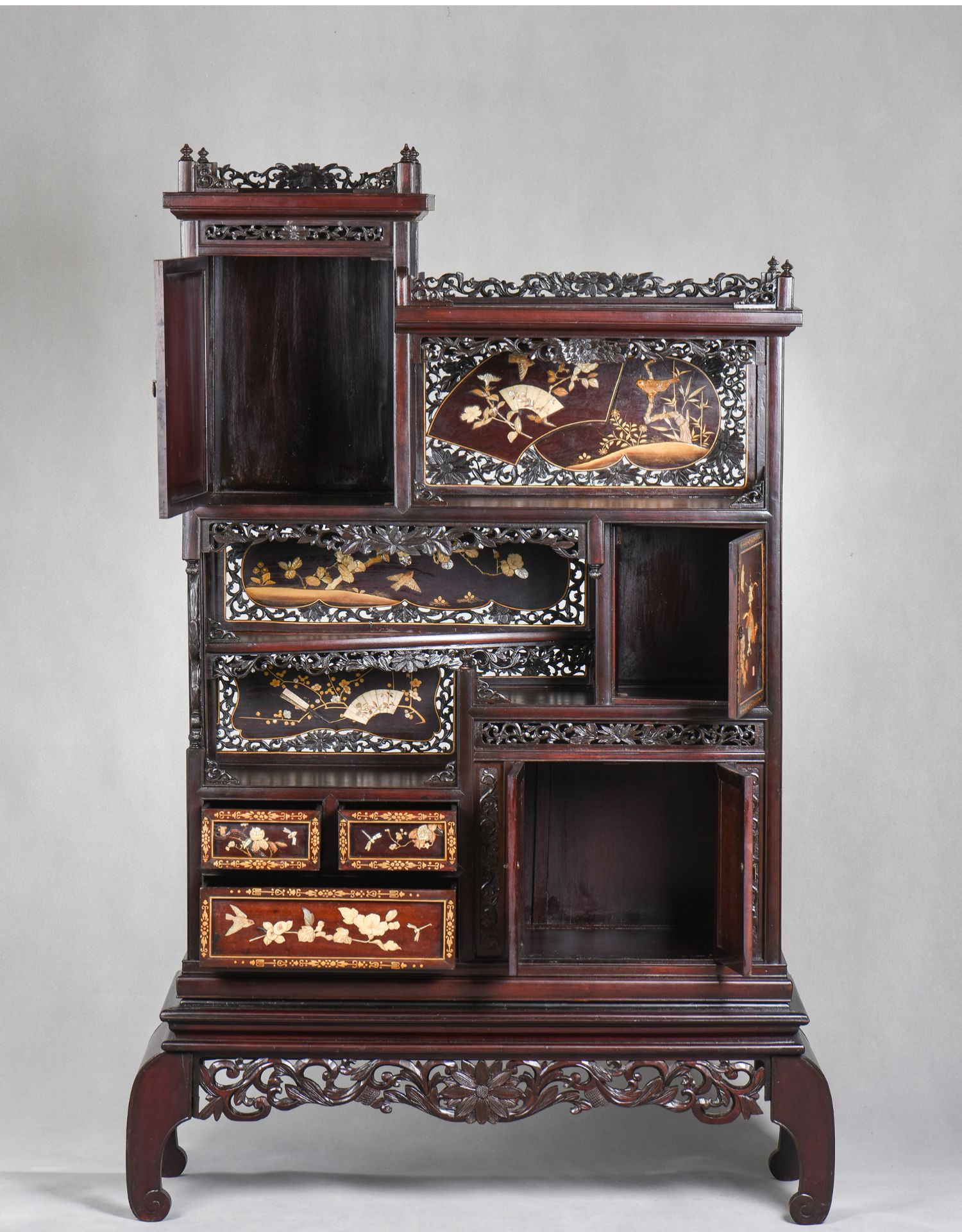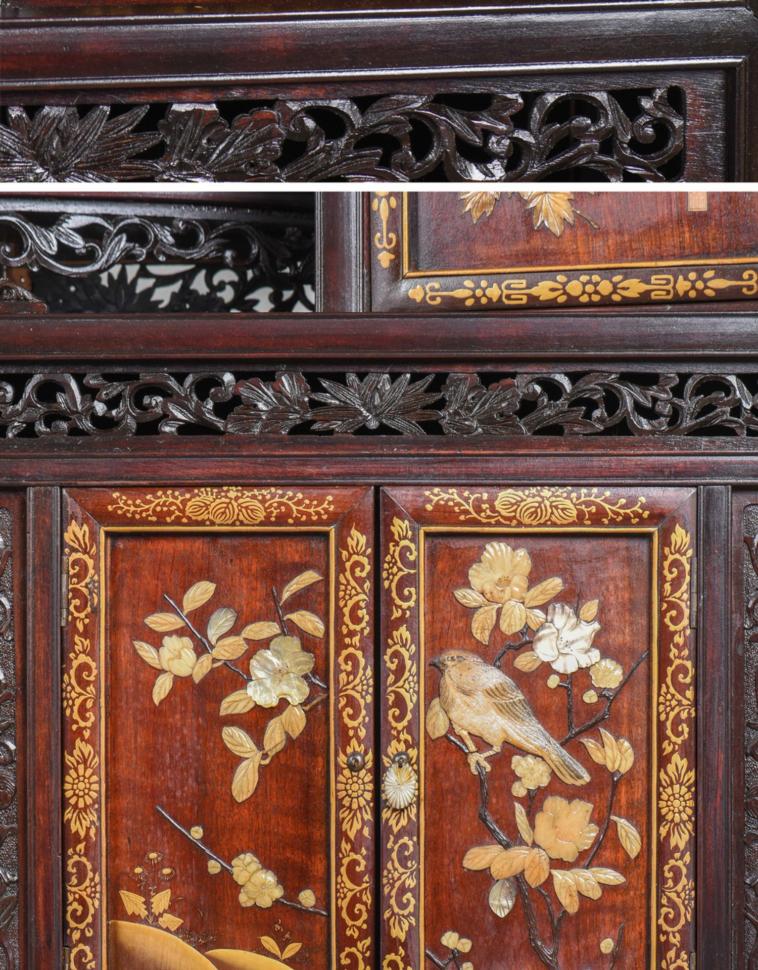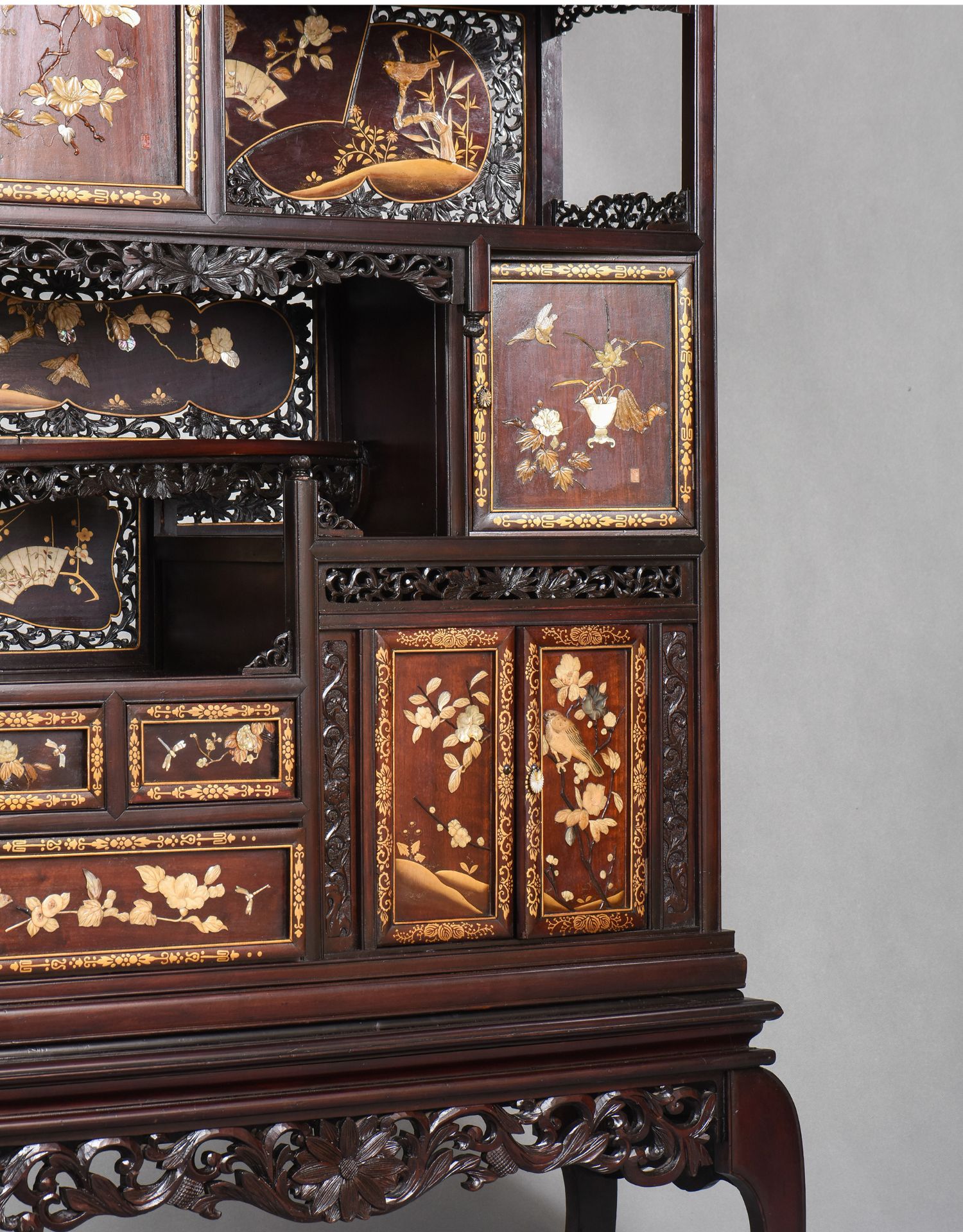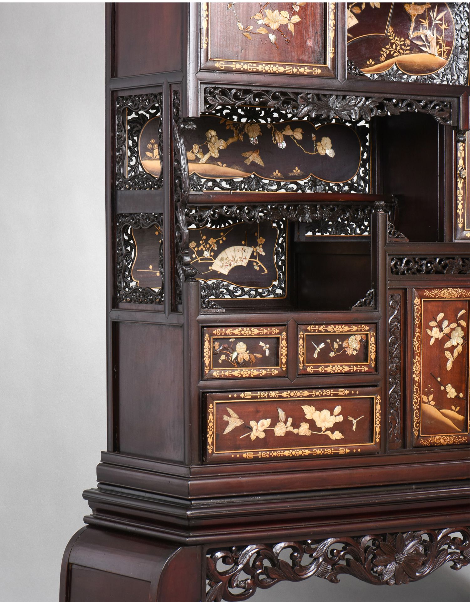 独角鹿西洋古董家具日本明治时期传统花鸟芝山镶嵌多宝阁立柜