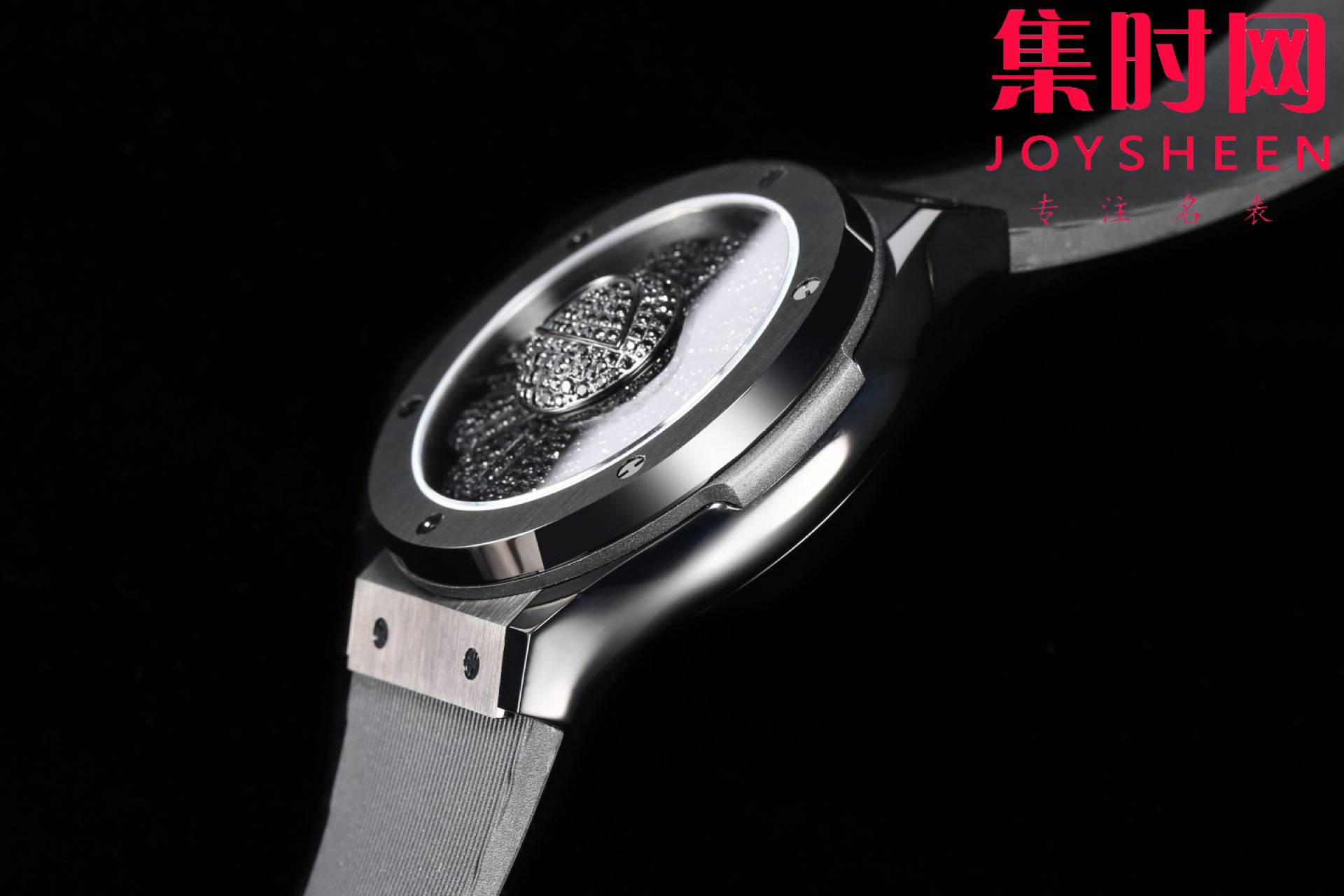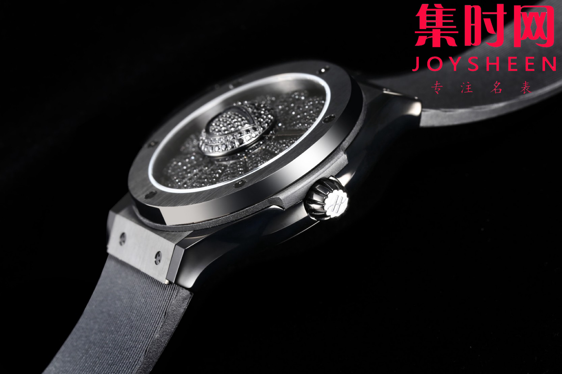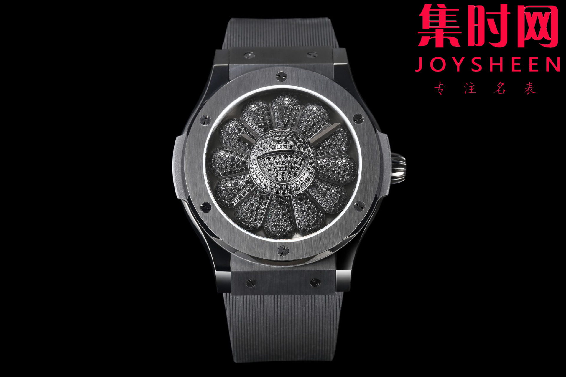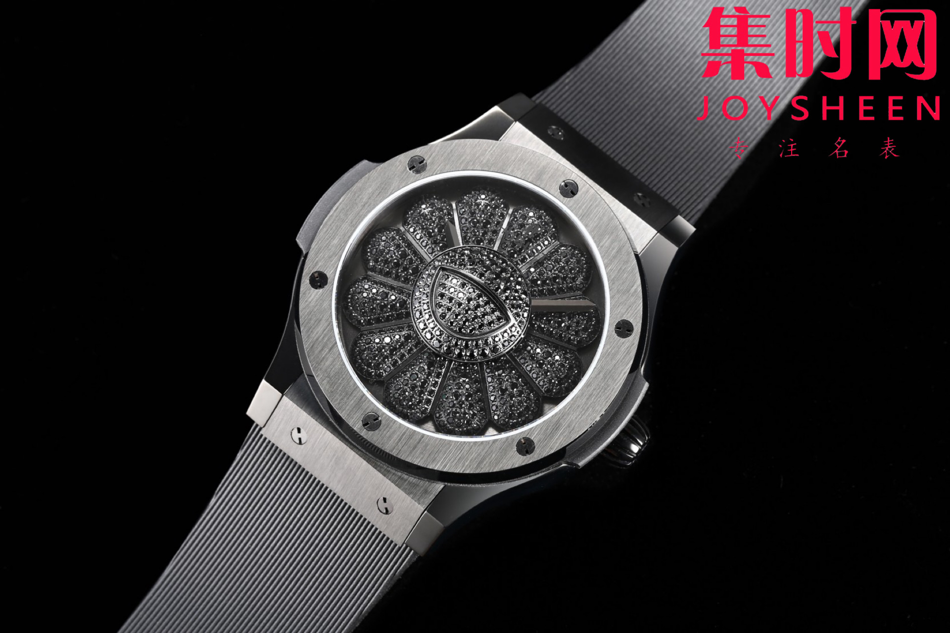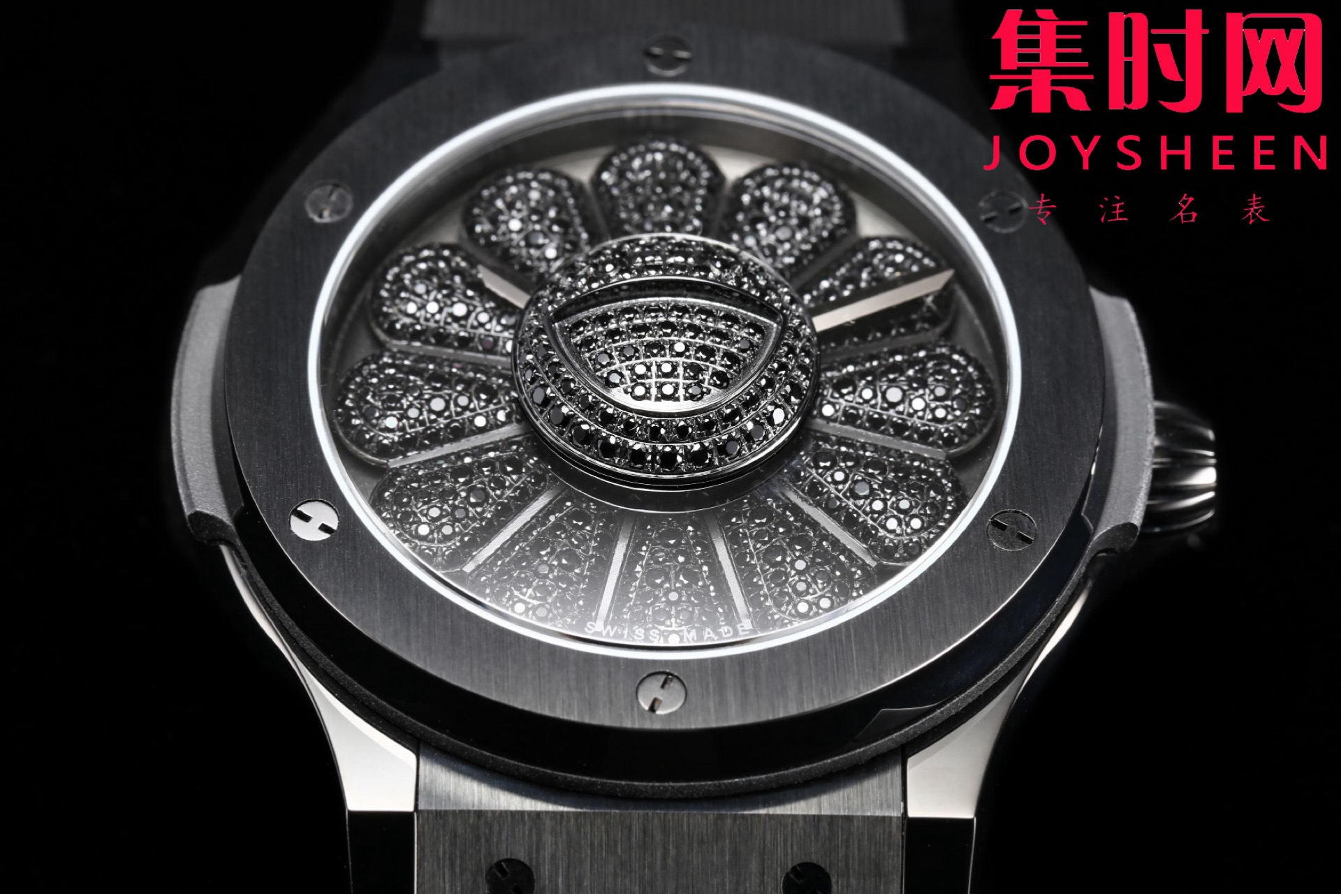 表盘:黑色漆面表盘 旋转装饰 12片镀黑花瓣 镶嵌456颗黑色钻石