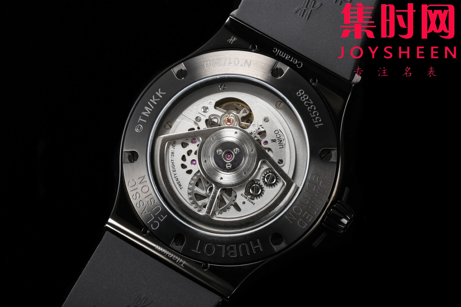 机芯:MHUB1214 UNICO 复杂功能自动上链机械机芯,烟灰色钌金属夹板和表桥,烟灰色涂层摆轮,钨金属摆轮,表面润饰微珠喷砂和缎面工艺,擒纵机构瑞士硅质杠杆式,擒纵机构,组件数量256,宝石数量30,振频4赫兹(每小时28,800次),动力储存 72小时