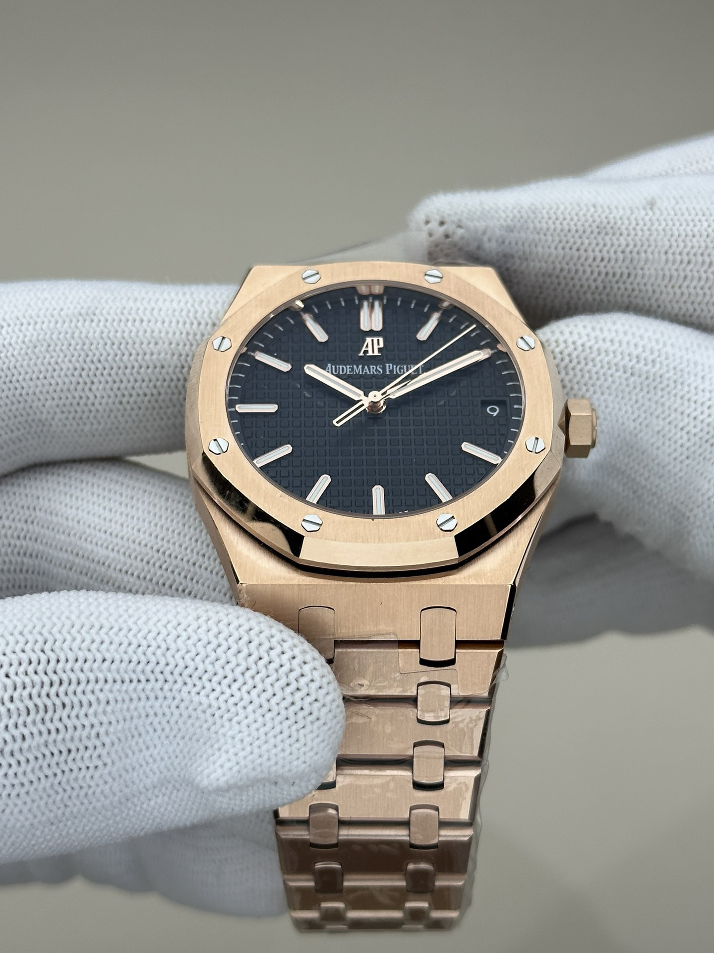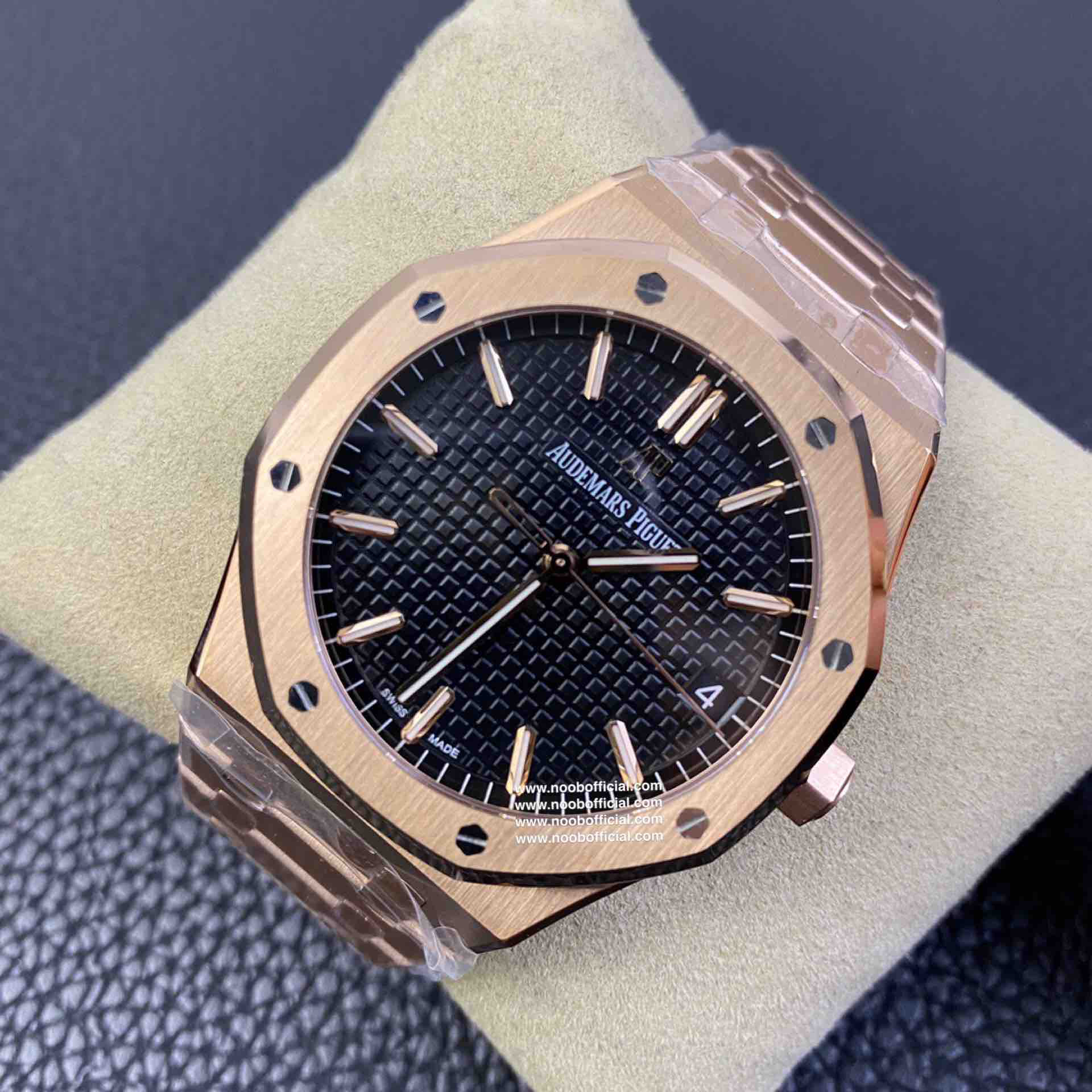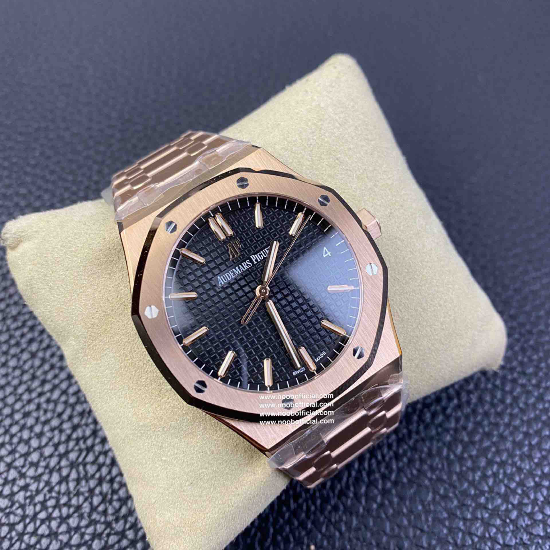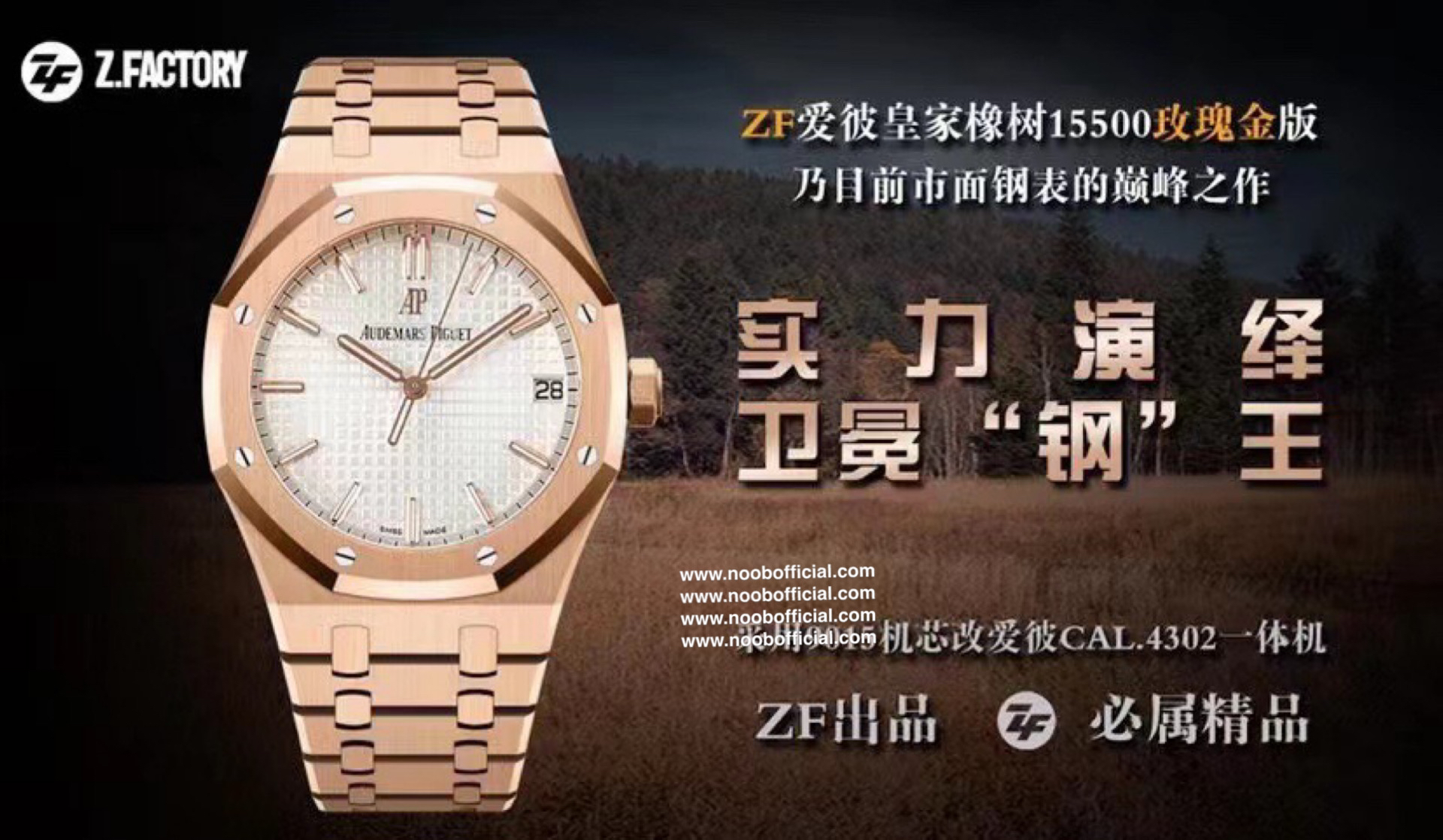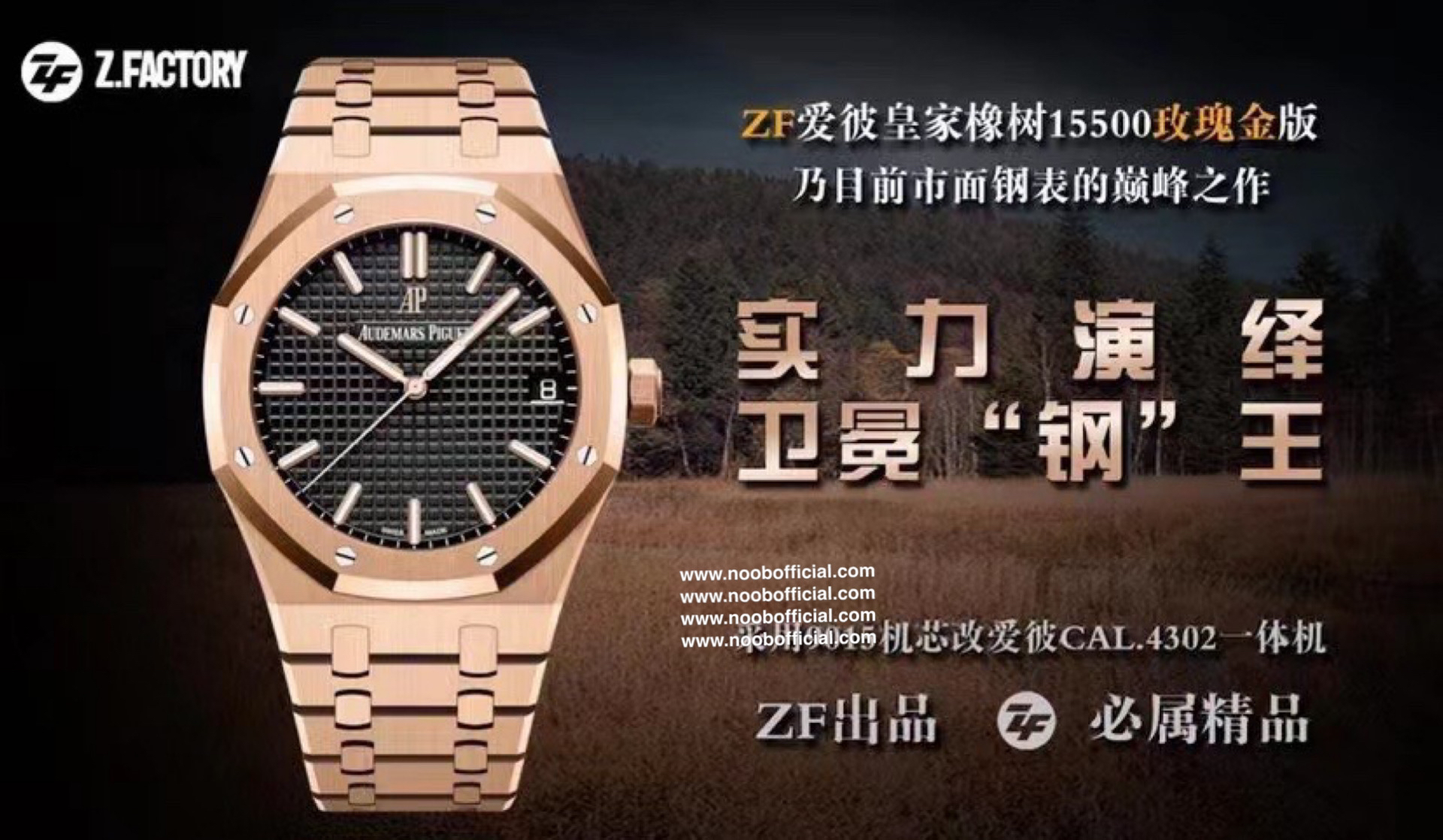 ZF皇家橡树15500玫瑰金黑盘 乃目前市面钢表的巅峰之作,—— 实力演绎 卫冕"钢"王!【6大精妙之处】1.正品拆解开模,尺寸为41X10.4毫米与正品一致!2.完全还原正品表壳的每一处细节,尽显正品"棱角分明 坚毅果敢"的阳刚气质。3.钢带的做工无可挑剔,比市面上任何钢带表做工均要更上一层楼,钢带头粒和表头衔接的"缓冲带"的松紧程度与正品一模一样。4.自动陀的与原装致敬,是市面唯一做到颜色于原装一致的版本(市面一般版本均偏红)其上的ap族徽雕刻独一无二。5.打破夹板概念,采用原装进口9015机芯改爱彼CAL.4302一体机!更稳定,更优秀,更真实。6.表盘的"饼干纹理"立体饱满,精神抖擞!绝非普通小厂一般失魂落魄。体验精妙 感受不同!
