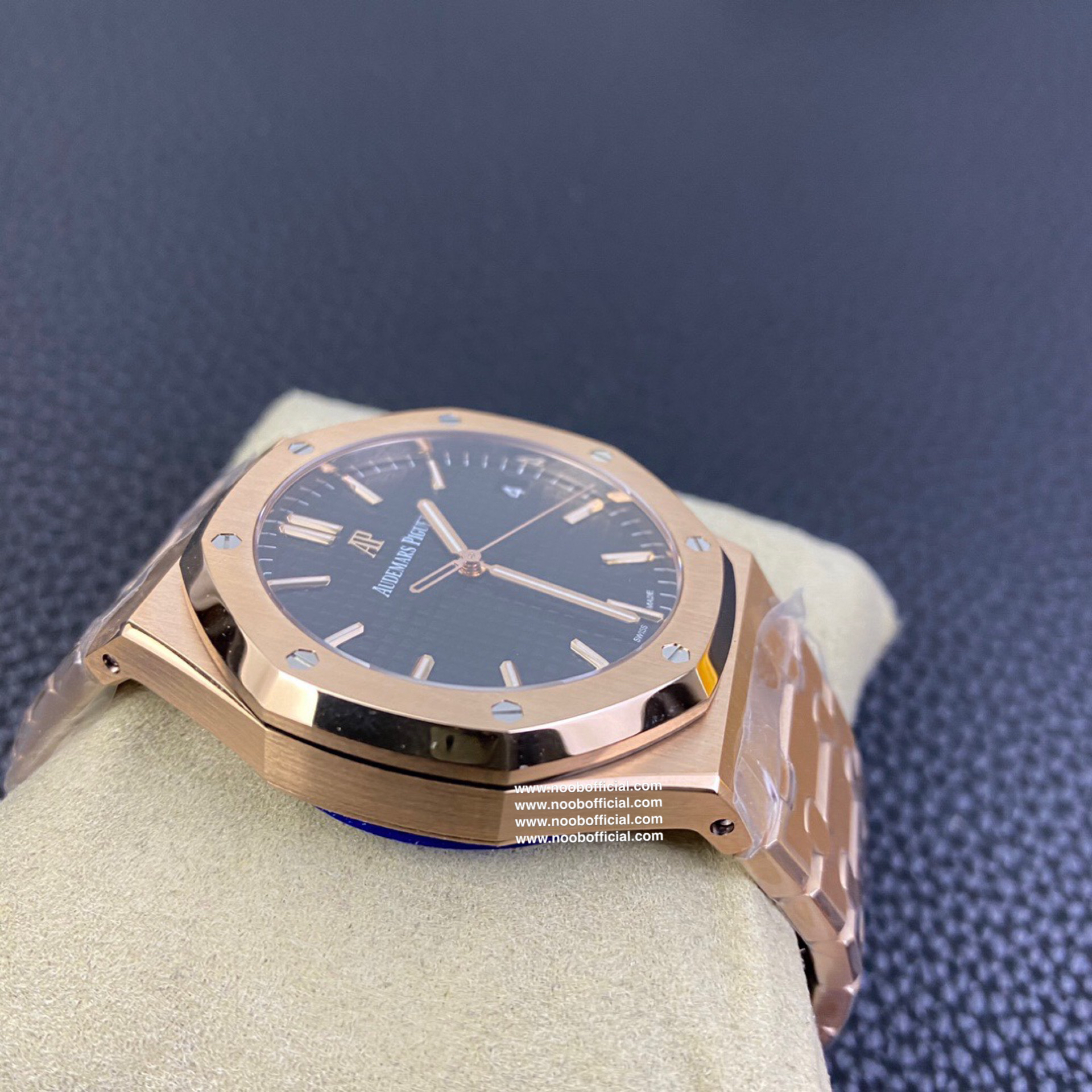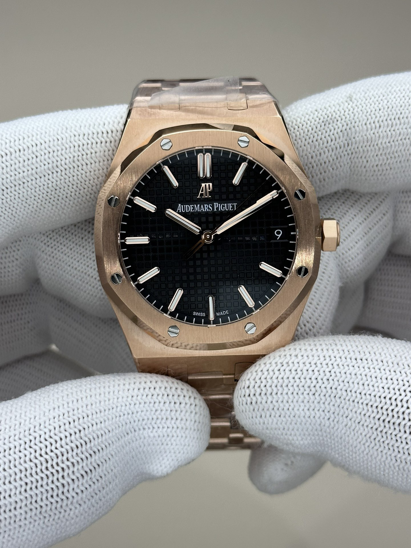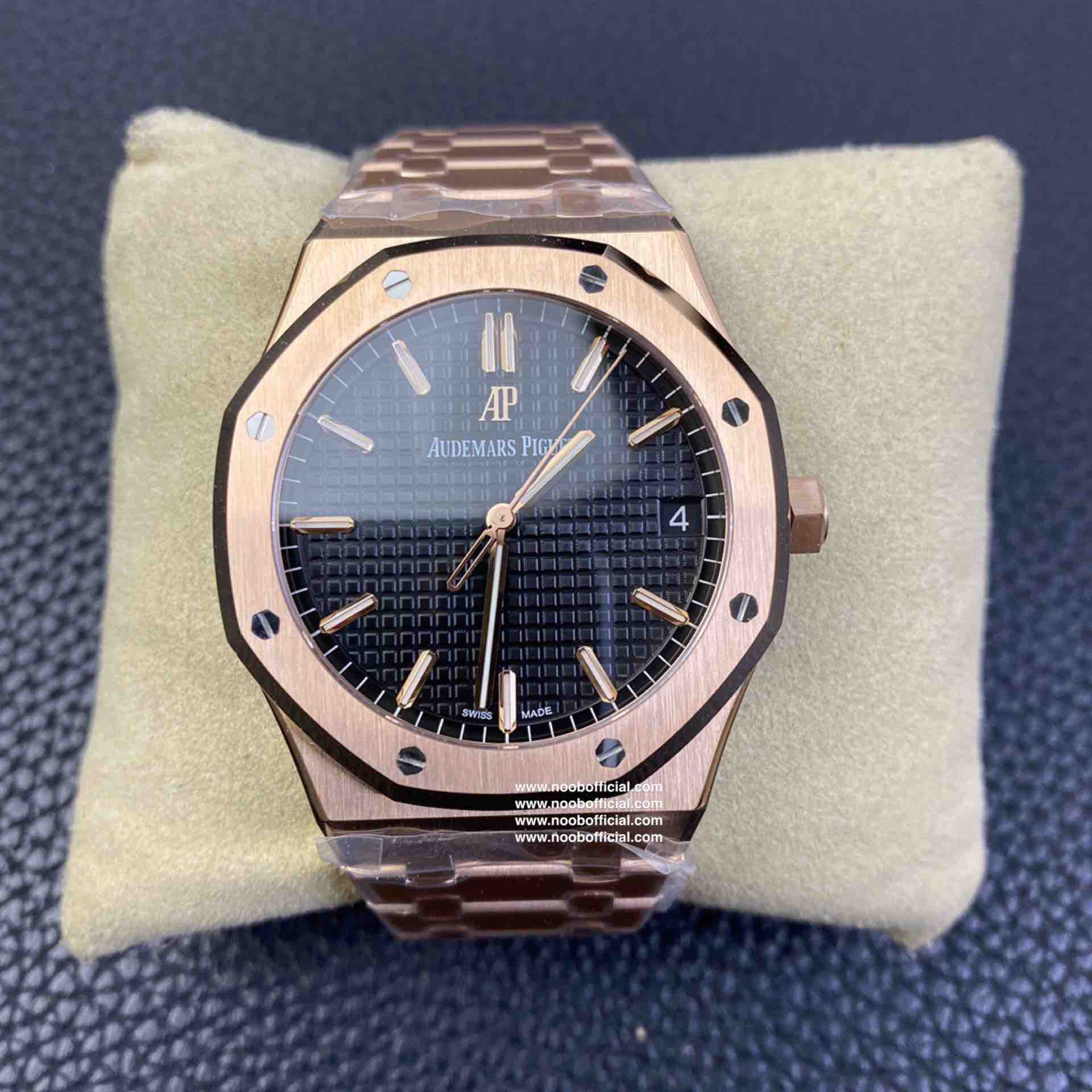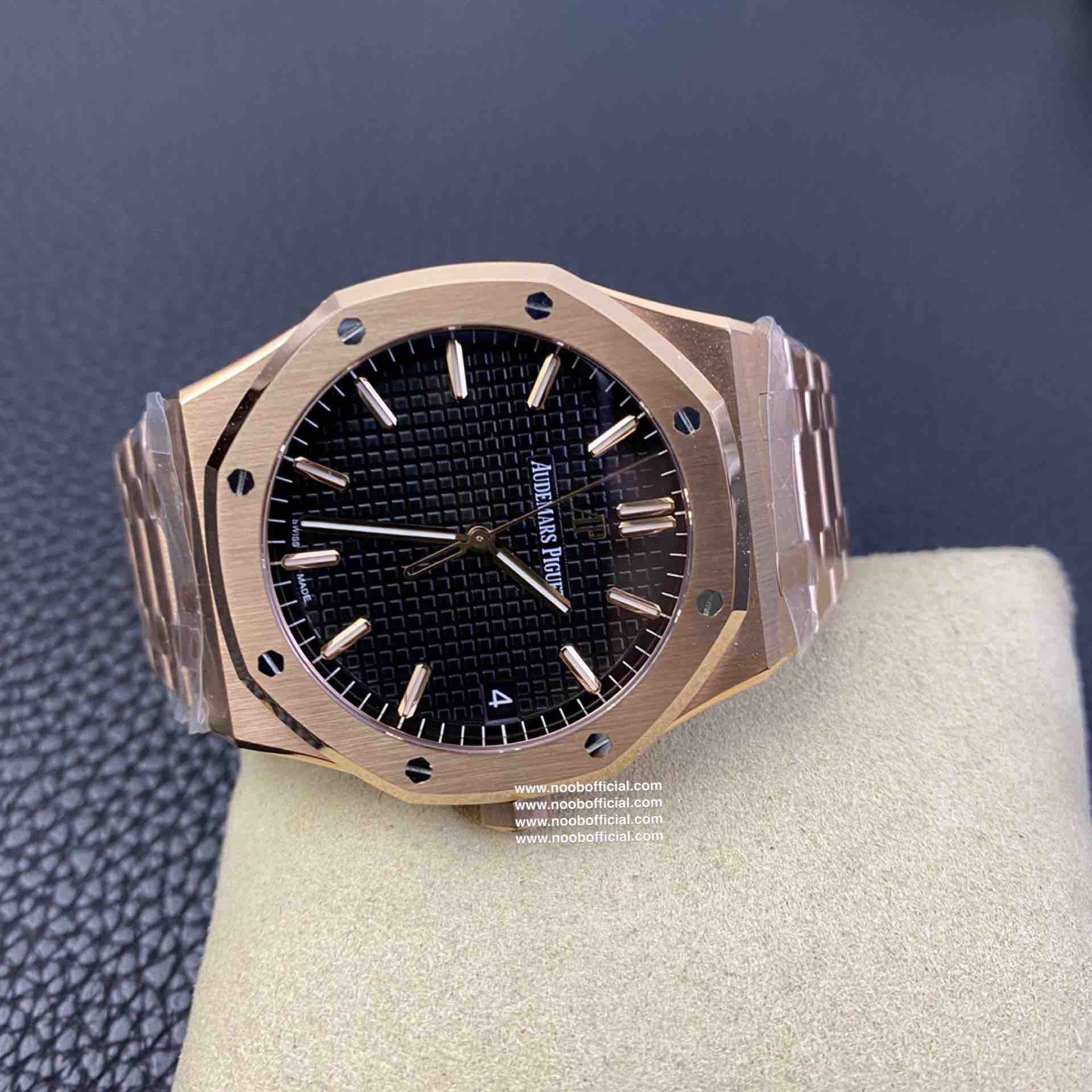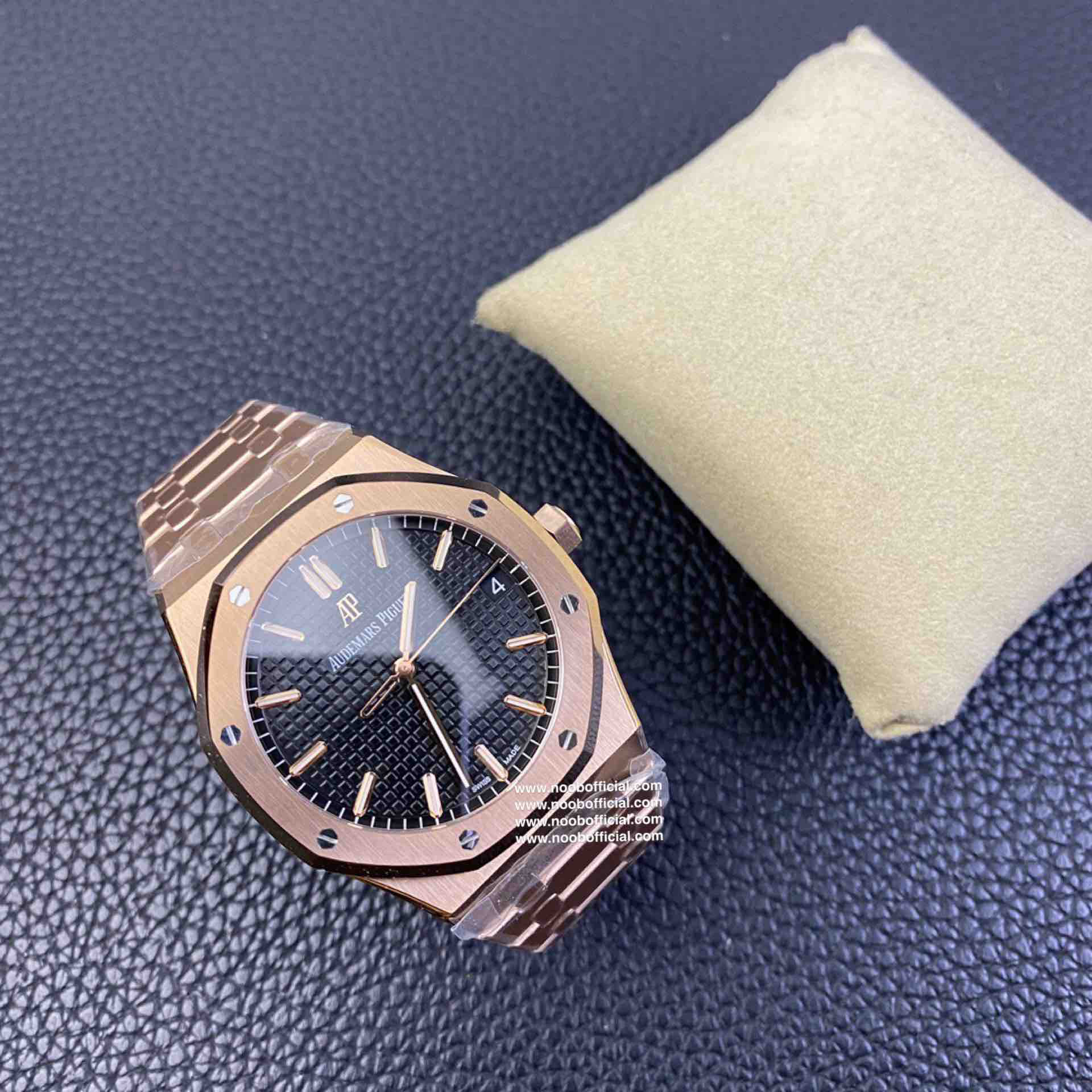 ZF皇家橡树15500玫瑰金黑盘 乃目前市面钢表的巅峰之作,—— 实力演绎 卫冕"钢"王!【6大精妙之处】1.正品拆解开模,尺寸为41X10.4毫米与正品一致!2.完全还原正品表壳的每一处细节,尽显正品"棱角分明 坚毅果敢"的阳刚气质。3.钢带的做工无可挑剔,比市面上任何钢带表做工均要更上一层楼,钢带头粒和表头衔接的"缓冲带"的松紧程度与正品一模一样。4.自动陀的与原装致敬,是市面唯一做到颜色于原装一致的版本(市面一般版本均偏红)其上的ap族徽雕刻独一无二。5.打破夹板概念,采用原装进口9015机芯改爱彼CAL.4302一体机!更稳定,更优秀,更真实。6.表盘的"饼干纹理"立体饱满,精神抖擞!绝非普通小厂一般失魂落魄。体验精妙 感受不同!