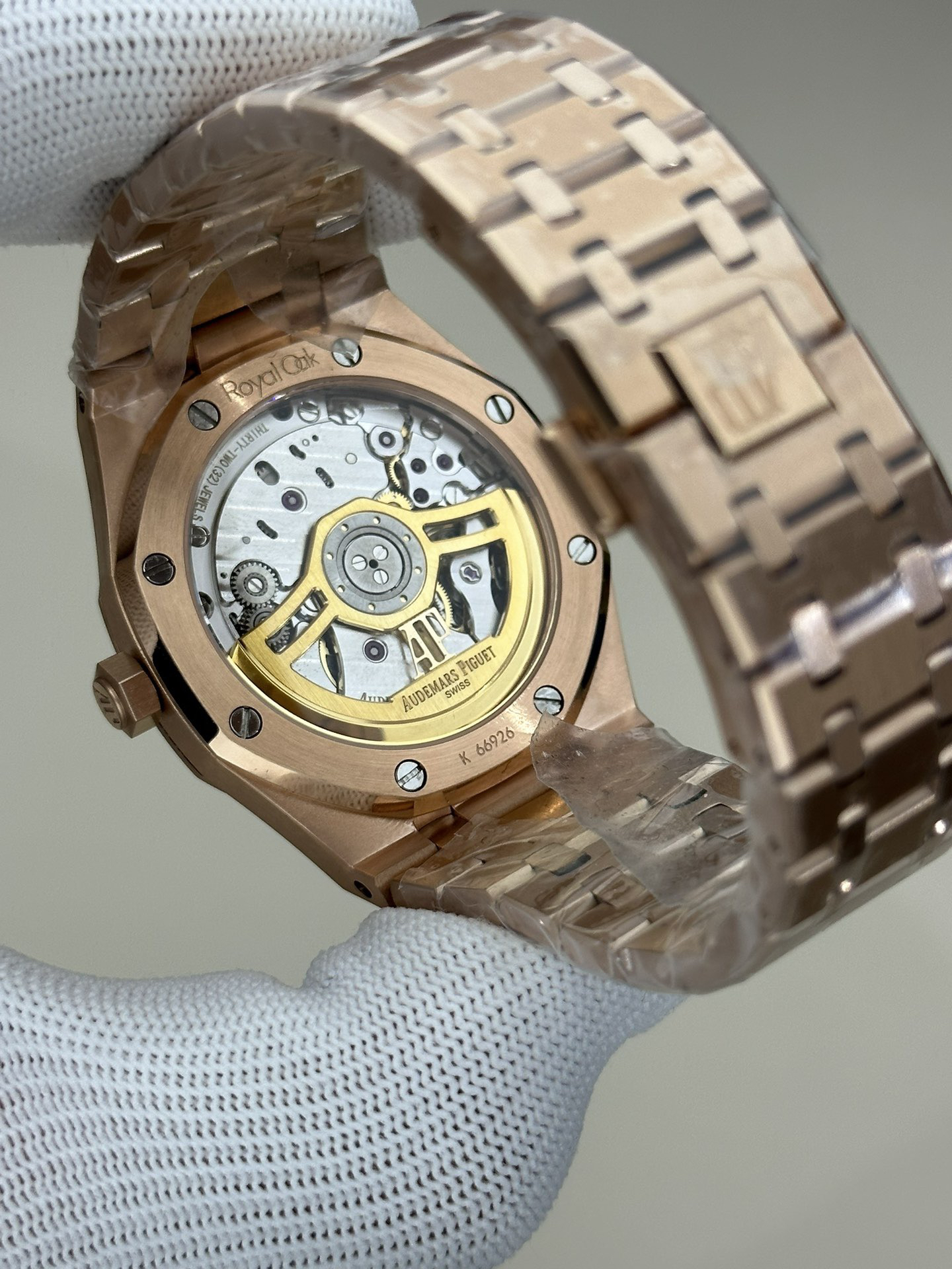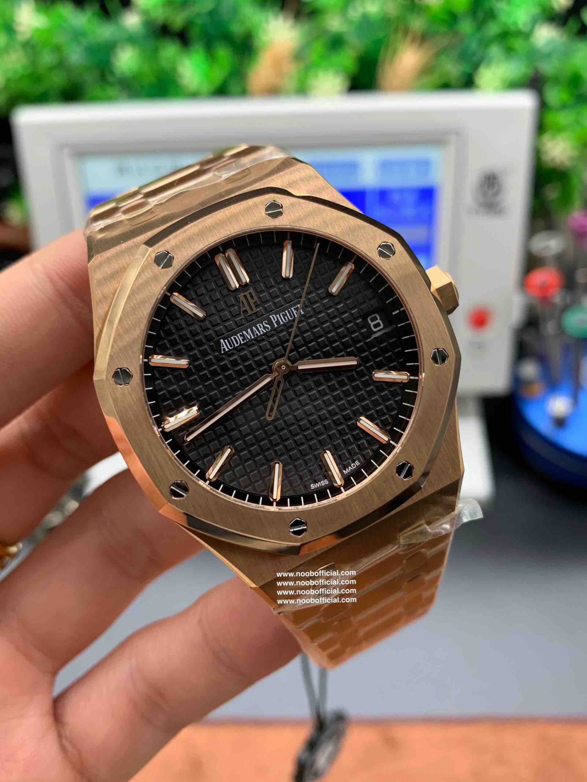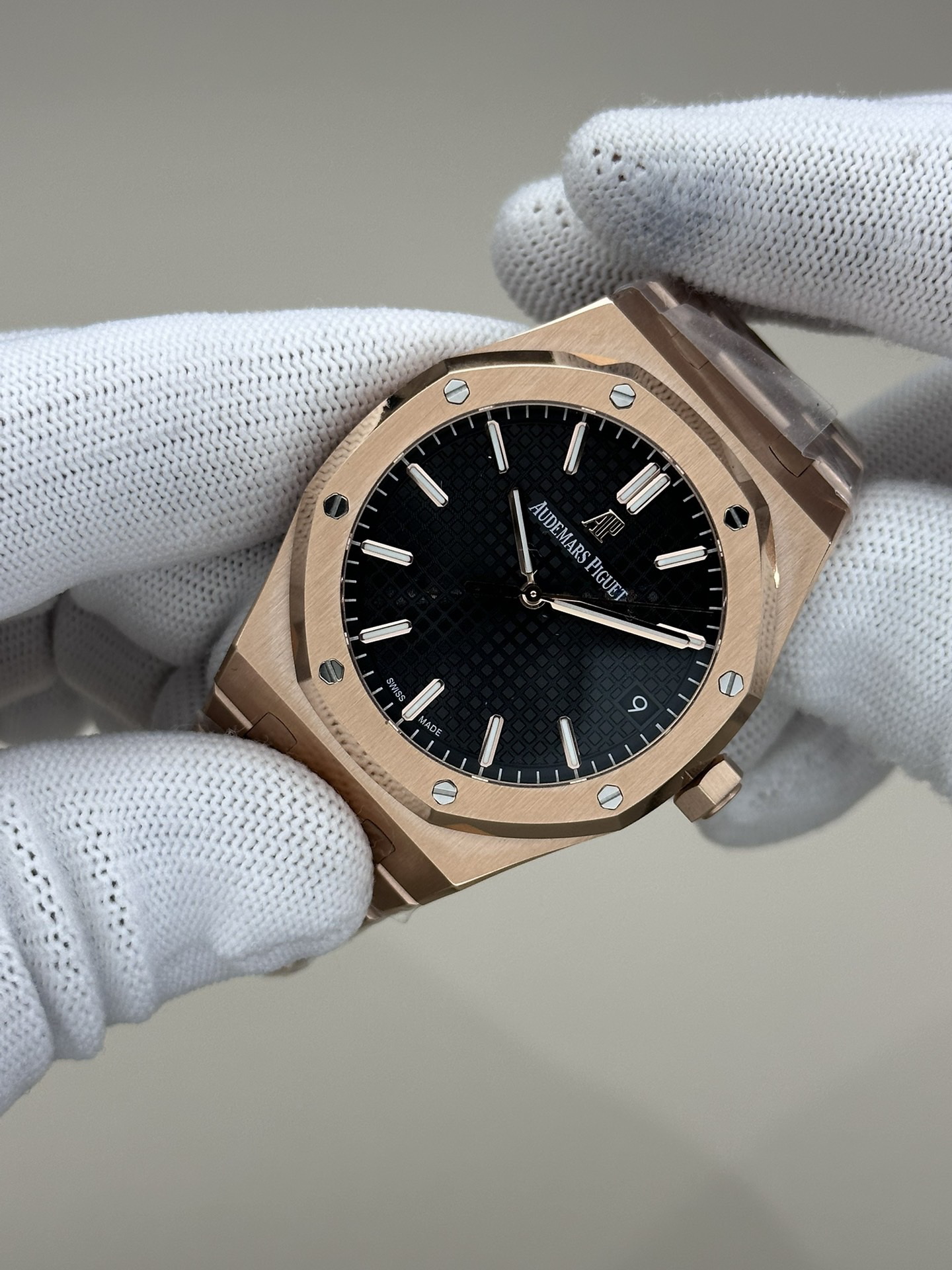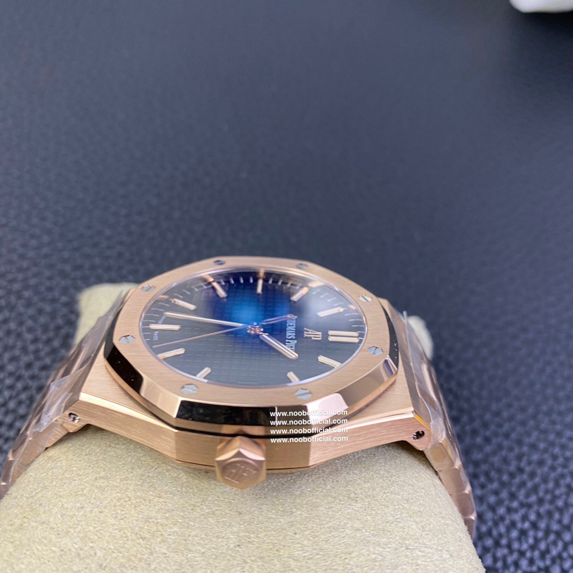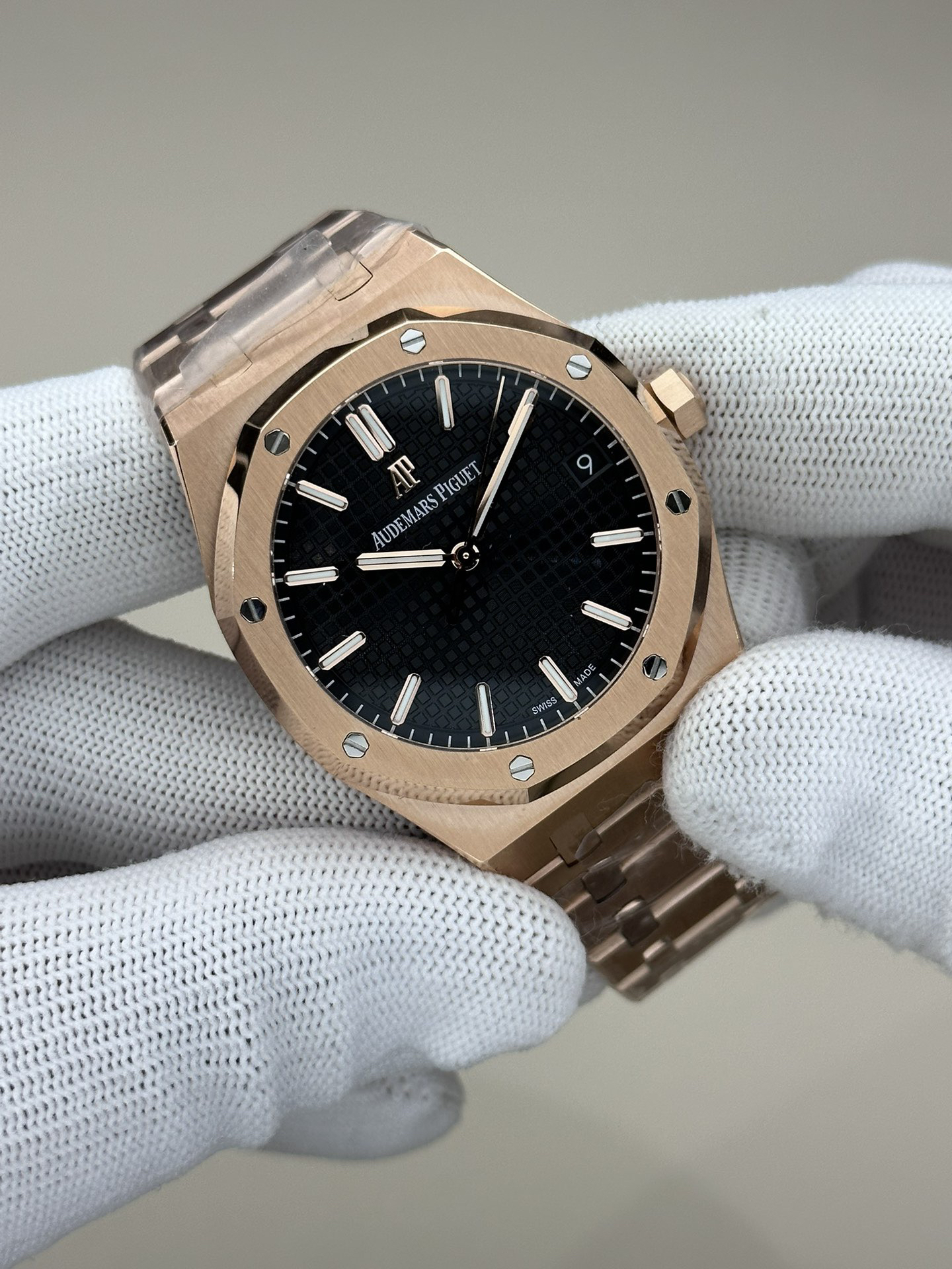 ZF皇家橡树15500玫瑰金黑盘 乃目前市面钢表的巅峰之作,—— 实力演绎 卫冕"钢"王!【6大精妙之处】1.正品拆解开模,尺寸为41X10.4毫米与正品一致!2.完全还原正品表壳的每一处细节,尽显正品"棱角分明 坚毅果敢"的阳刚气质。3.钢带的做工无可挑剔,比市面上任何钢带表做工均要更上一层楼,钢带头粒和表头衔接的"缓冲带"的松紧程度与正品一模一样。4.自动陀的与原装致敬,是市面唯一做到颜色于原装一致的版本(市面一般版本均偏红)其上的ap族徽雕刻独一无二。5.打破夹板概念,采用原装进口9015机芯改爱彼CAL.4302一体机!更稳定,更优秀,更真实。6.表盘的"饼干纹理"立体饱满,精神抖擞!绝非普通小厂一般失魂落魄。体验精妙 感受不同!