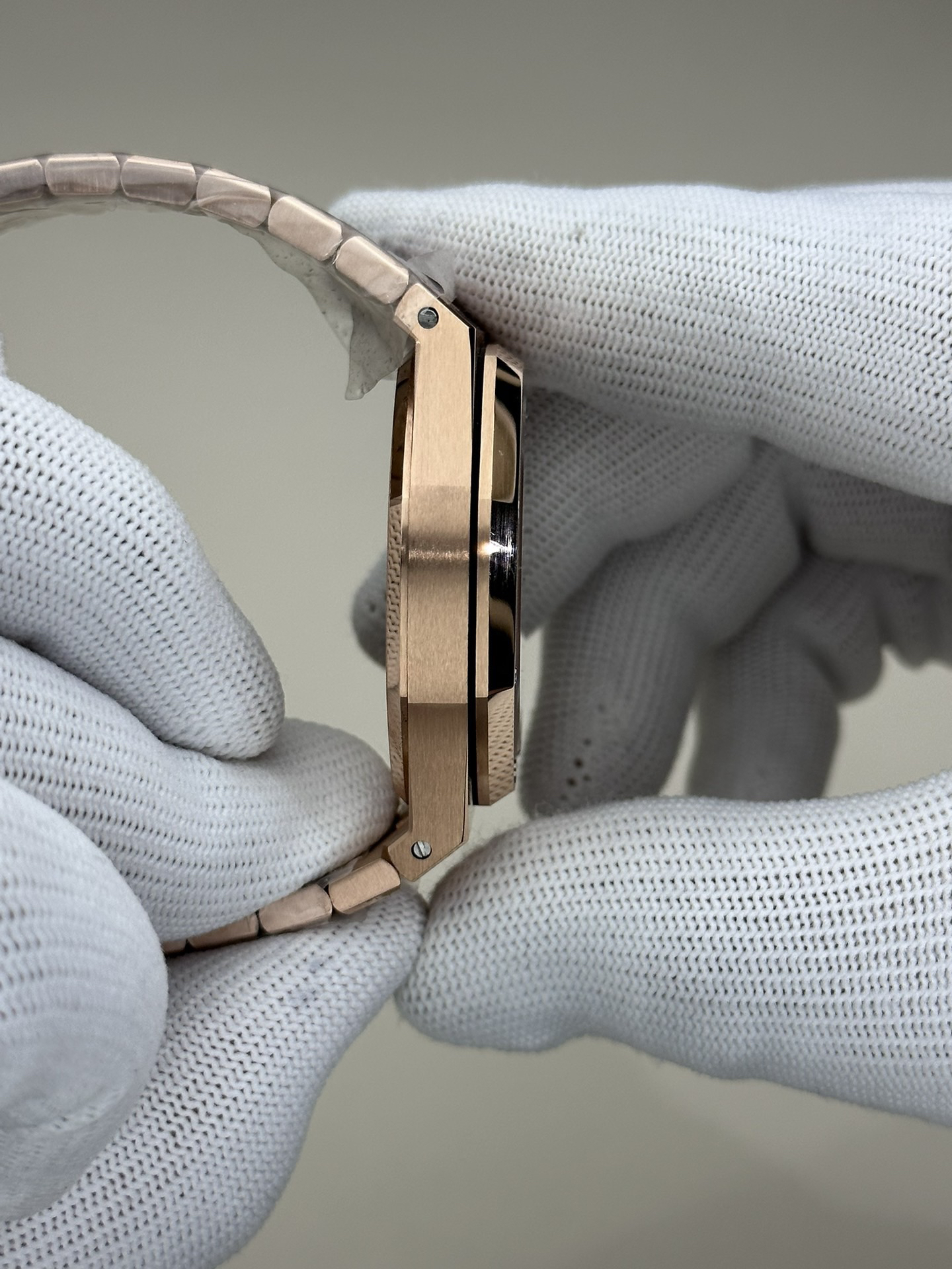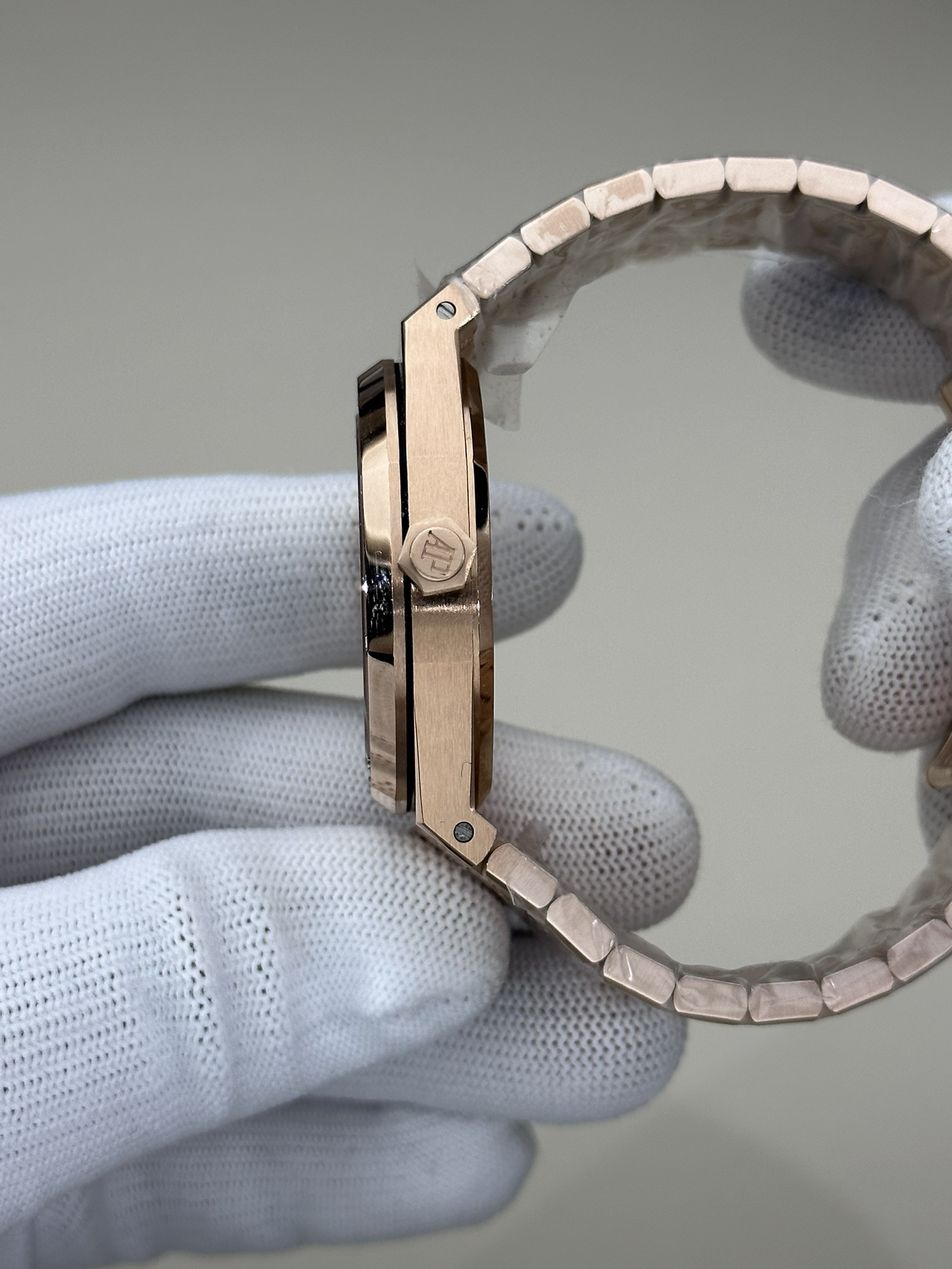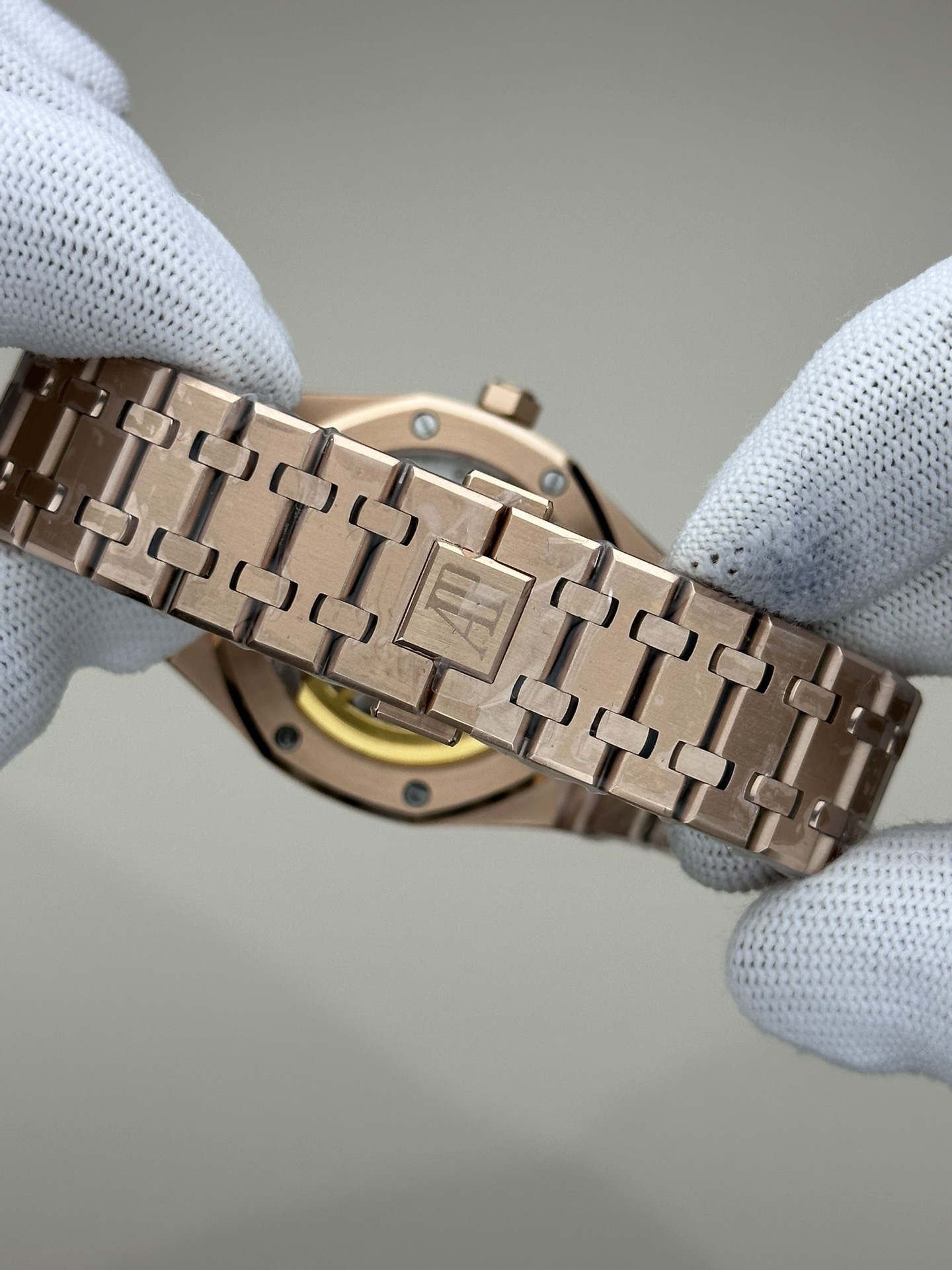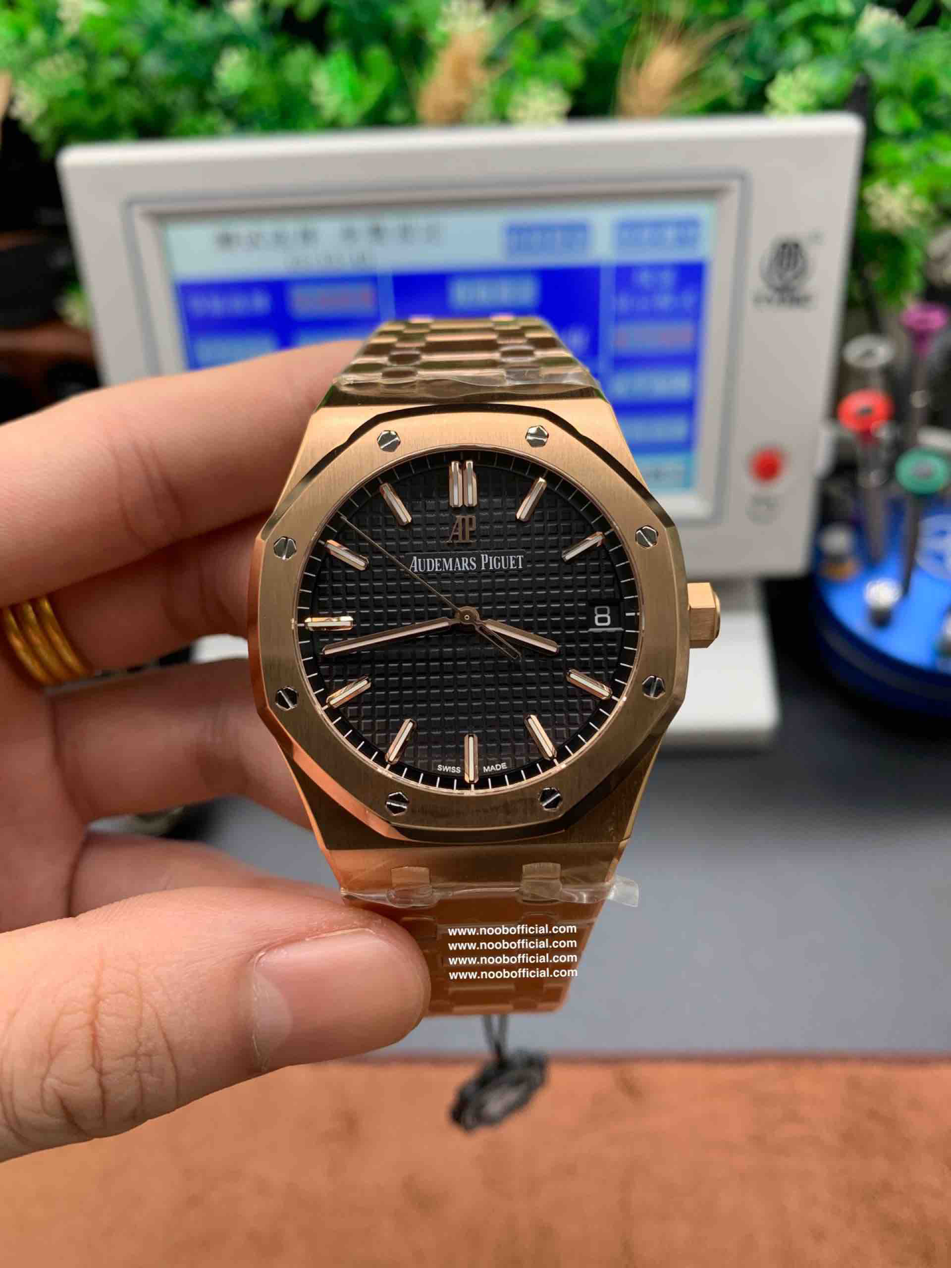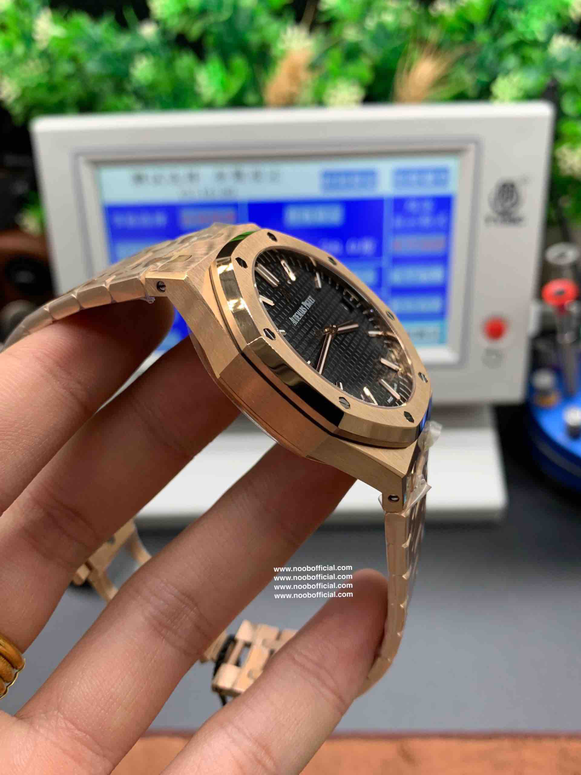 ZF皇家橡树15500玫瑰金黑盘 乃目前市面钢表的巅峰之作,—— 实力演绎 卫冕"钢"王!【6大精妙之处】1.正品拆解开模,尺寸为41X10.4毫米与正品一致!2.完全还原正品表壳的每一处细节,尽显正品"棱角分明 坚毅果敢"的阳刚气质。3.钢带的做工无可挑剔,比市面上任何钢带表做工均要更上一层楼,钢带头粒和表头衔接的"缓冲带"的松紧程度与正品一模一样。4.自动陀的与原装致敬,是市面唯一做到颜色于原装一致的版本(市面一般版本均偏红)其上的ap族徽雕刻独一无二。5.打破夹板概念,采用原装进口9015机芯改爱彼CAL.4302一体机!更稳定,更优秀,更真实。6.表盘的"饼干纹理"立体饱满,精神抖擞!绝非普通小厂一般失魂落魄。体验精妙 感受不同!
