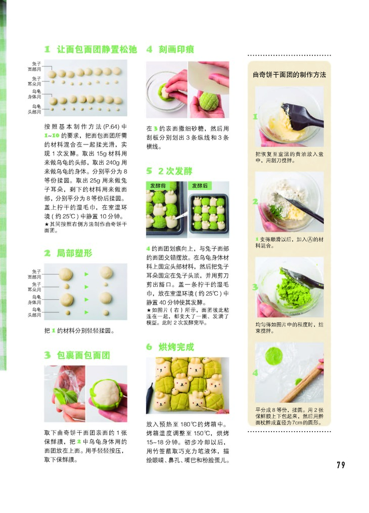 如果您已经感受到用松饼粉制作小面包的乐趣,那么也请尝试着使用酵母做出质地蓬松的小面包吧!本章节中介绍使用圆形、环形等模型制作的进阶版卡通3D立体小面包。每一款均配有详细的制作流程和图片,简明易懂,欢迎尝试。
