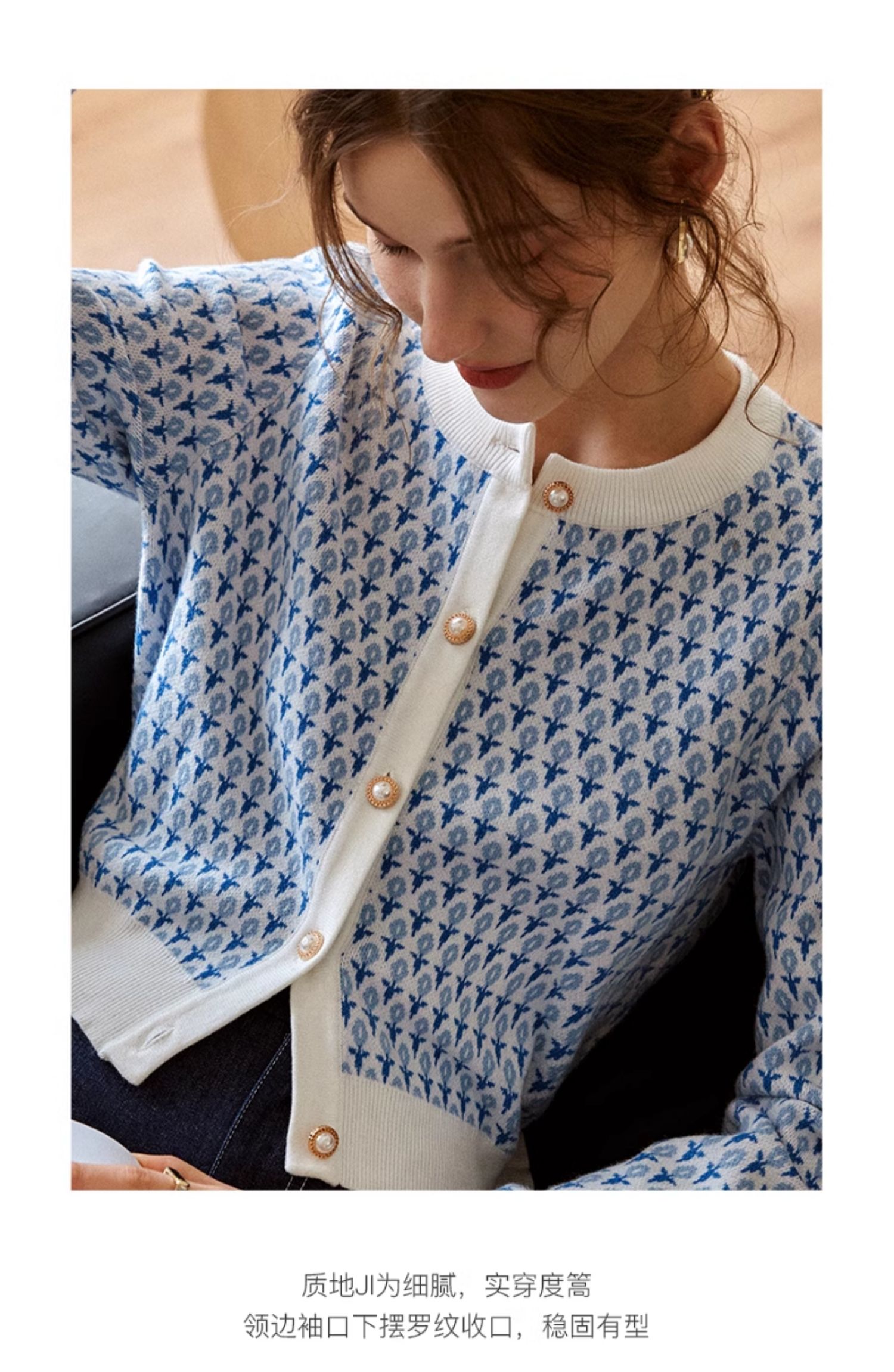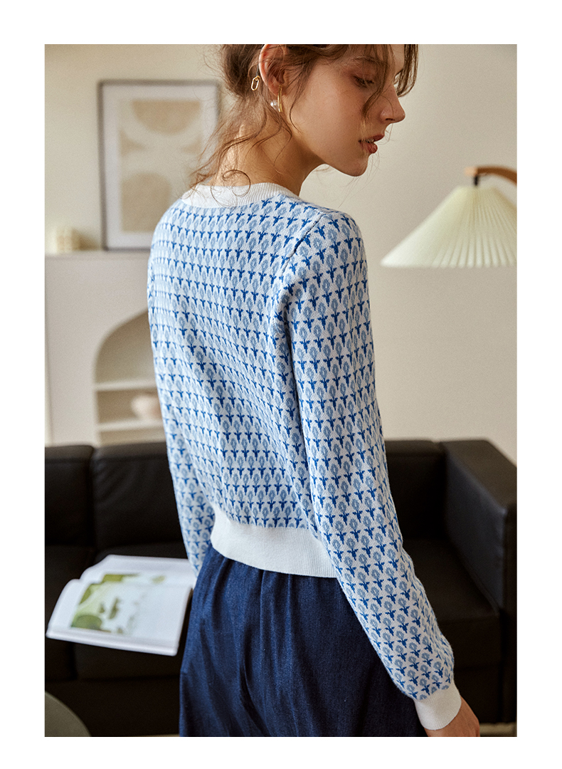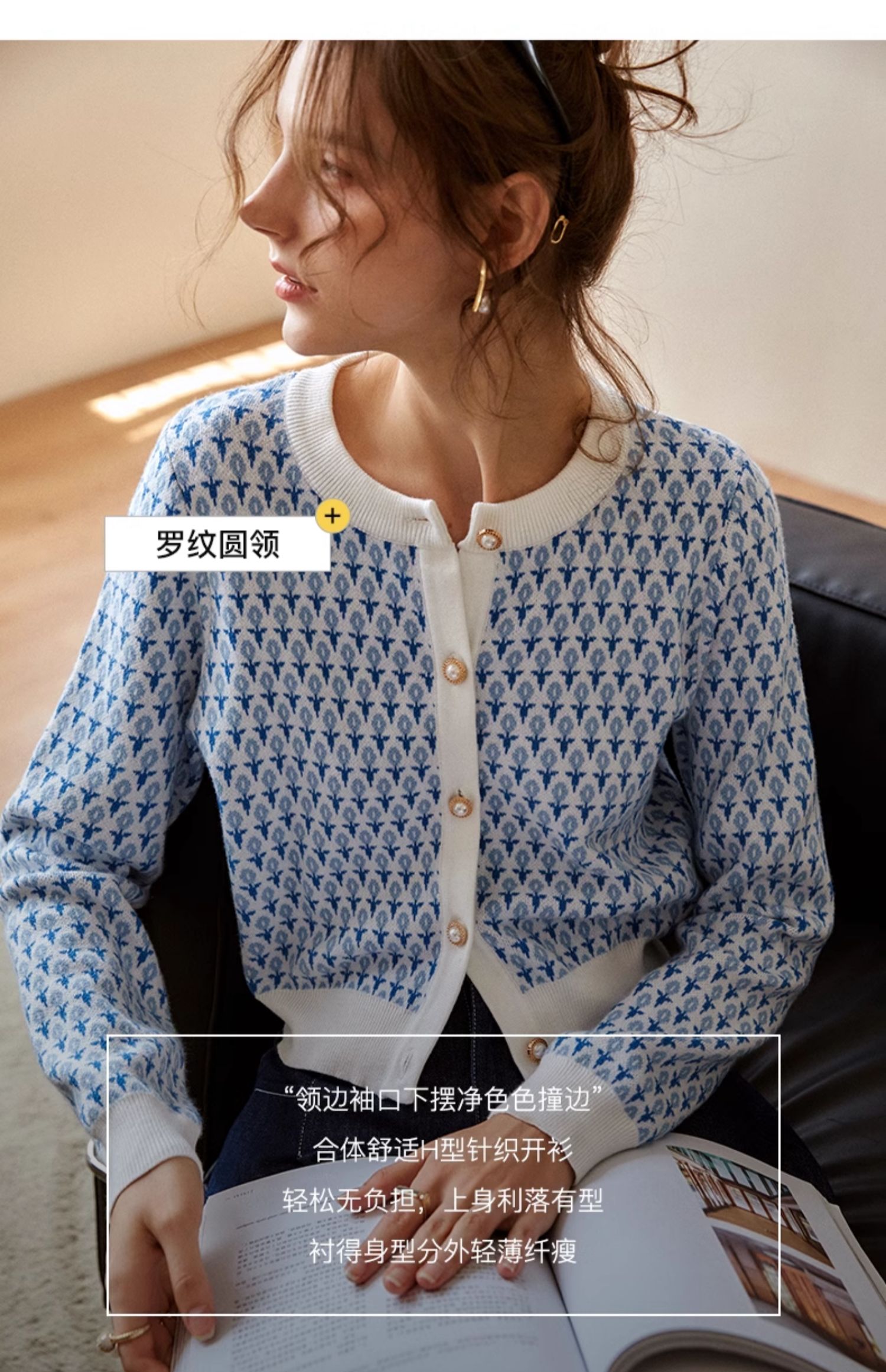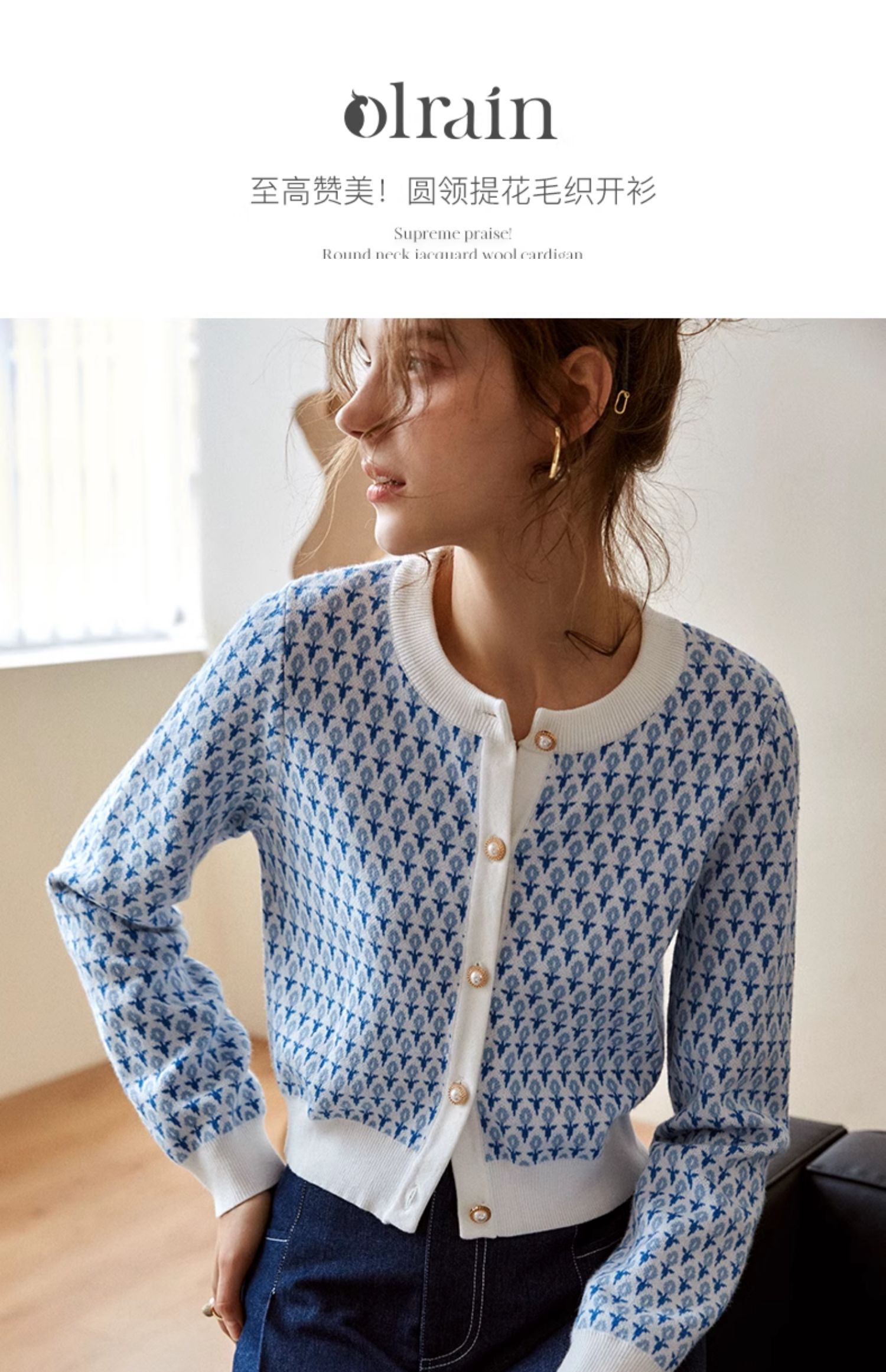欧芮儿法式浅蓝色针织开衫女早春2025新款圆领长袖短款毛衣外套