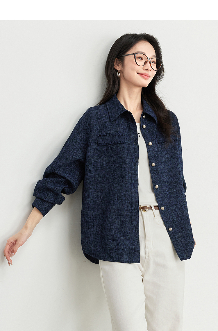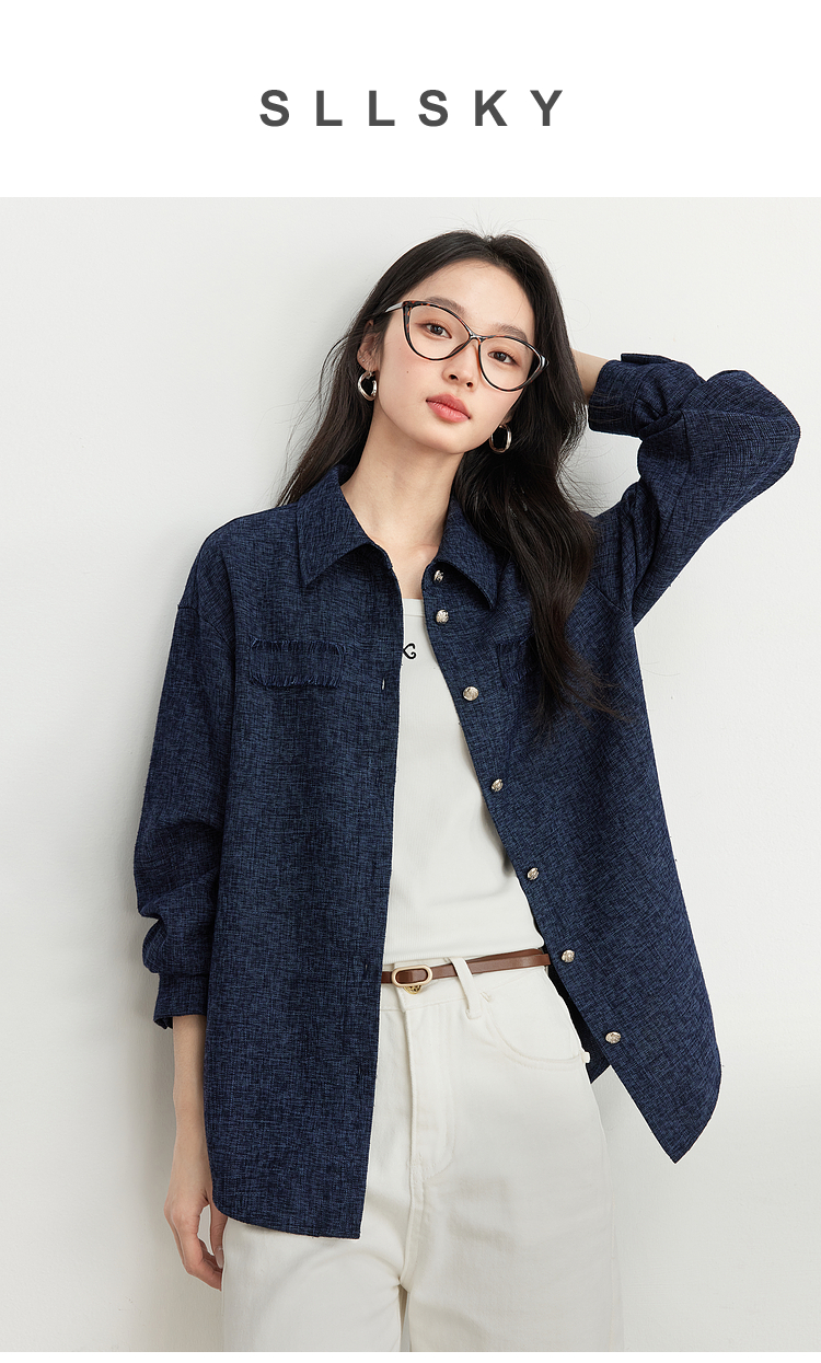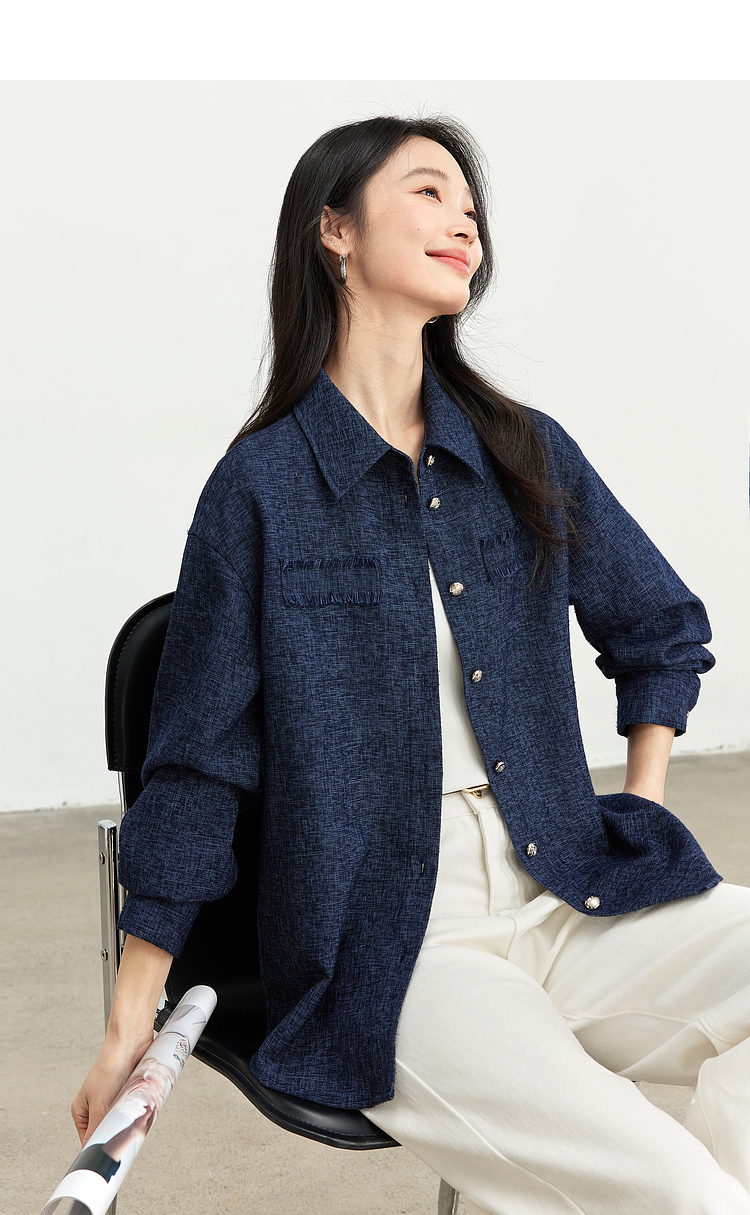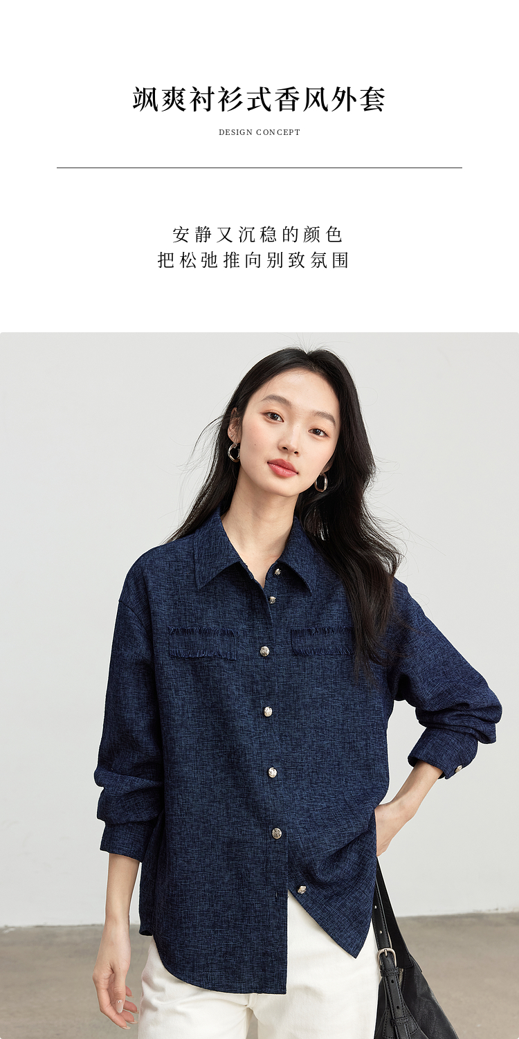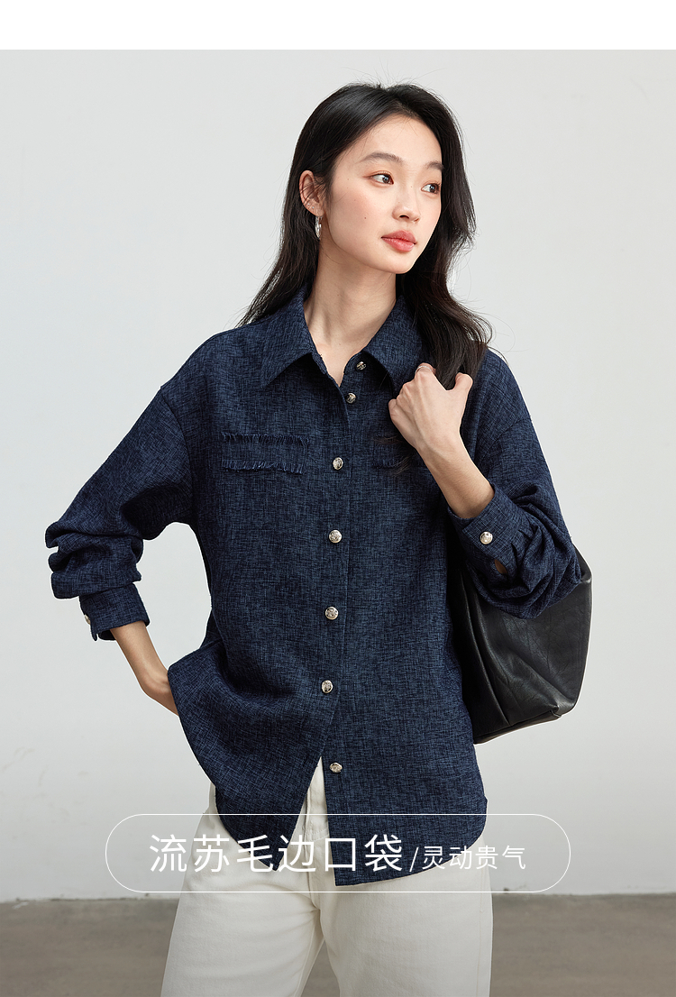 【年货节】熙世界藏青色小香风衬衫外套女2025春新款宽松设计感流苏长袖衬衣