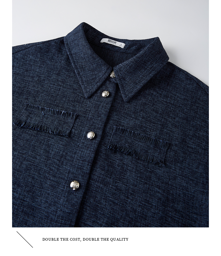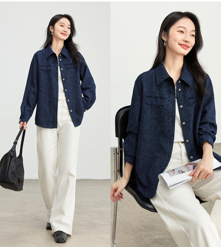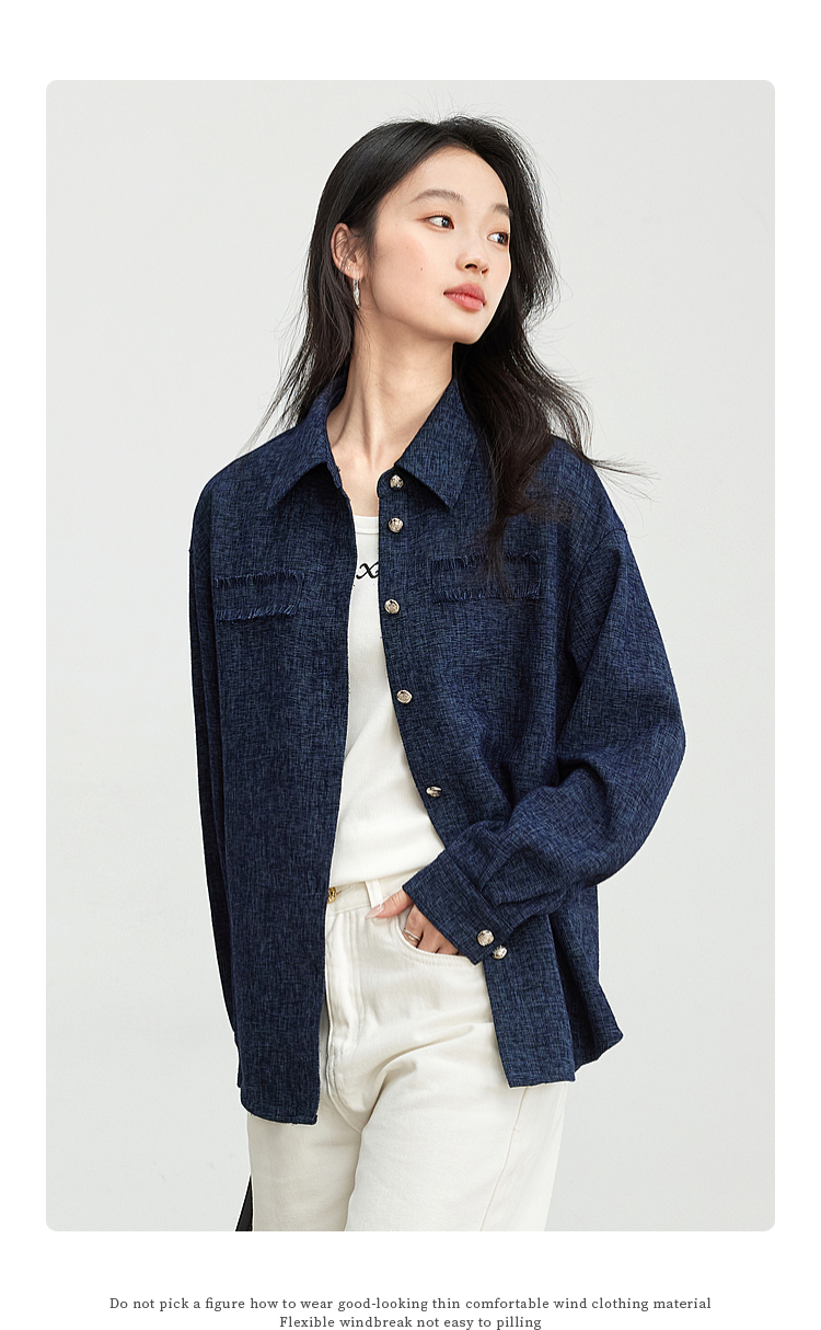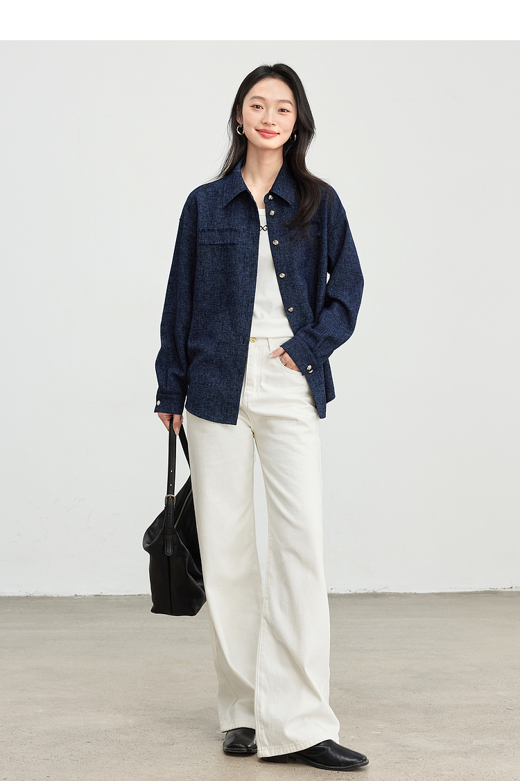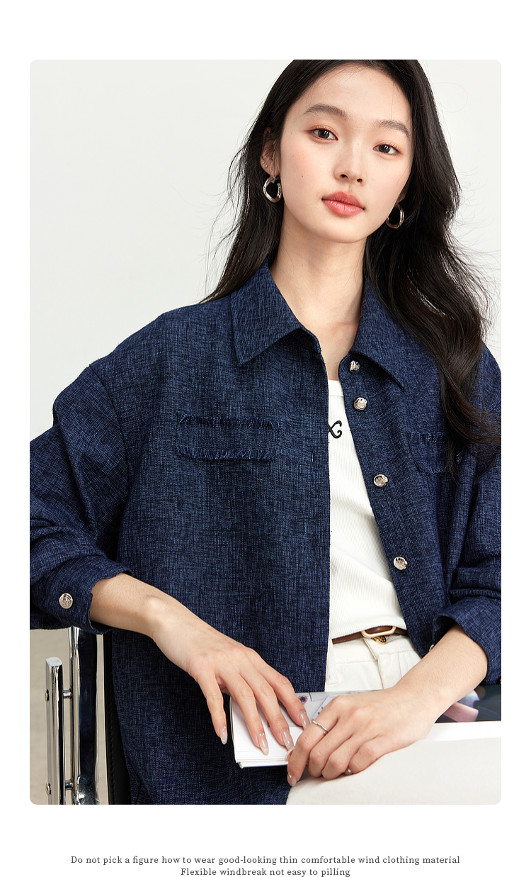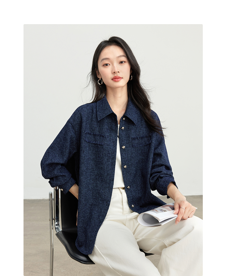 【年货节】熙世界藏青色小香风衬衫外套女2025春新款宽松设计感流苏长袖衬衣