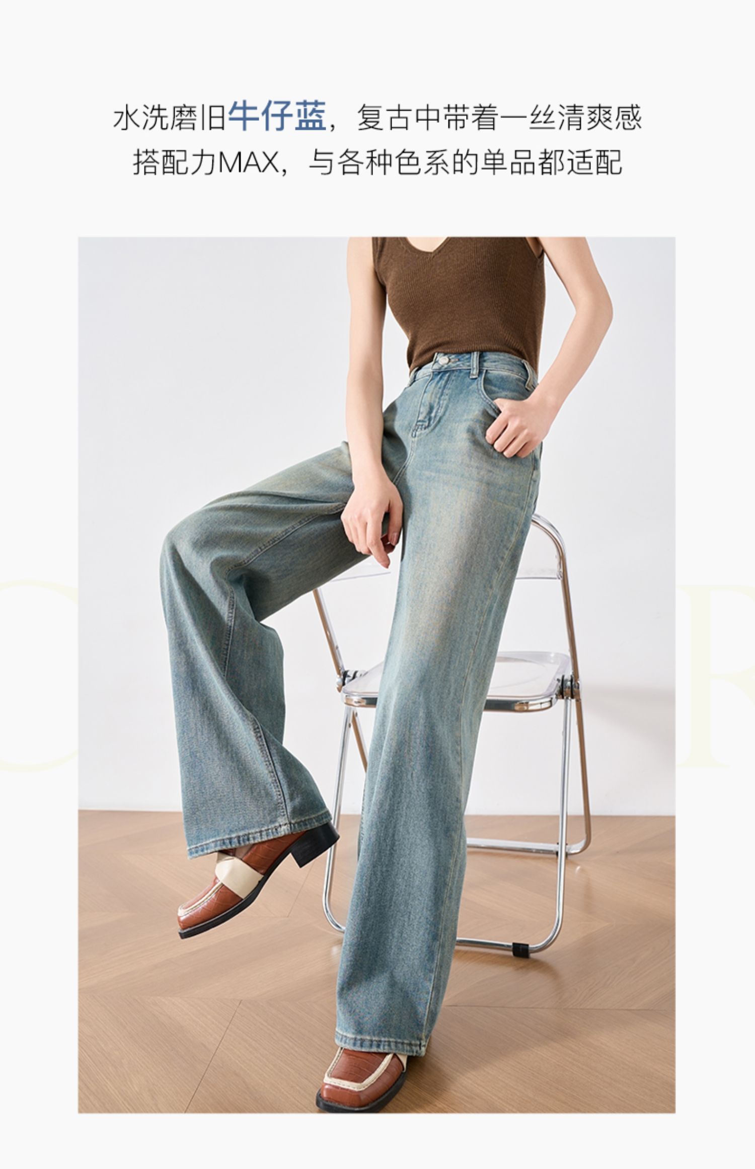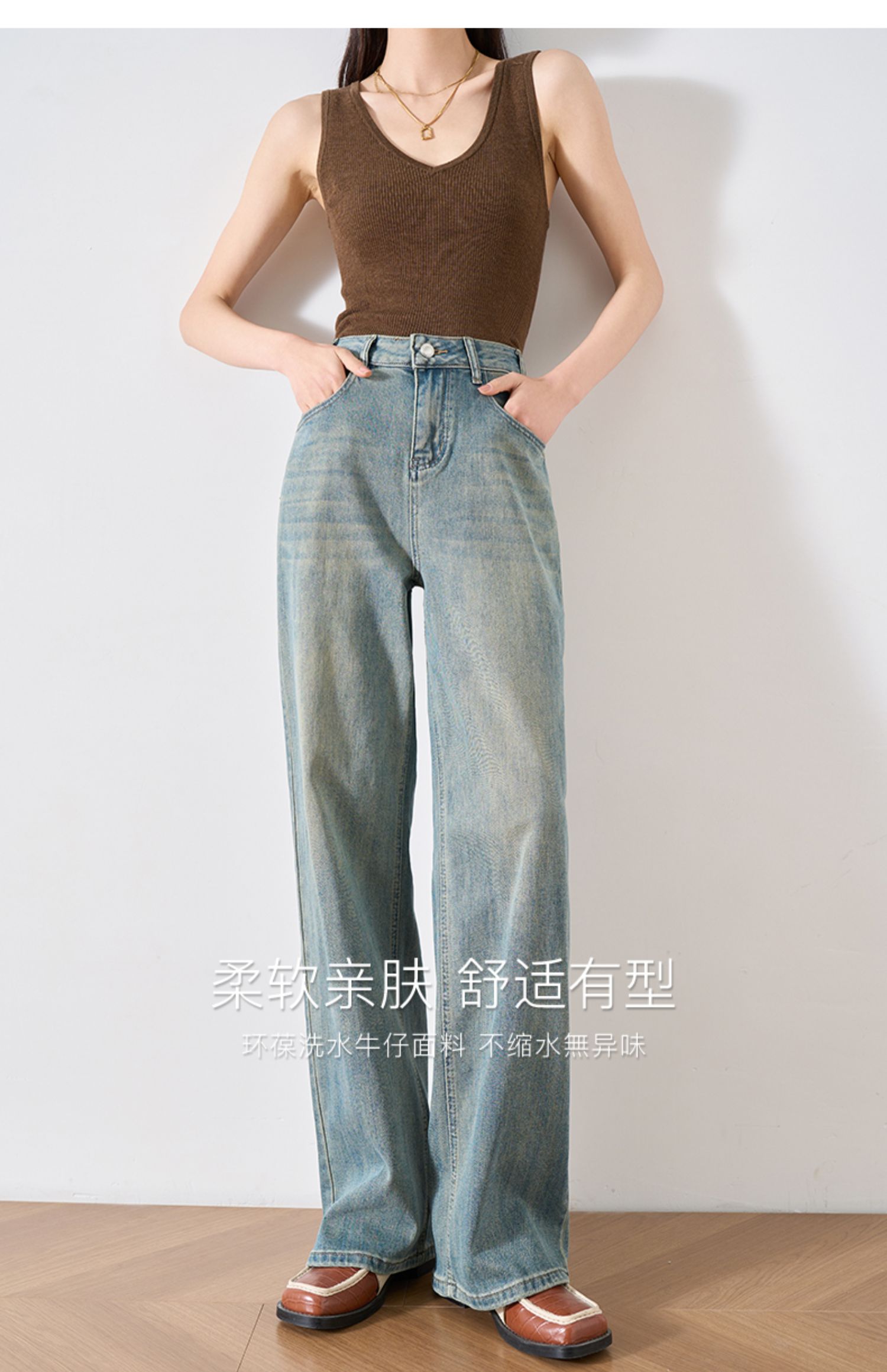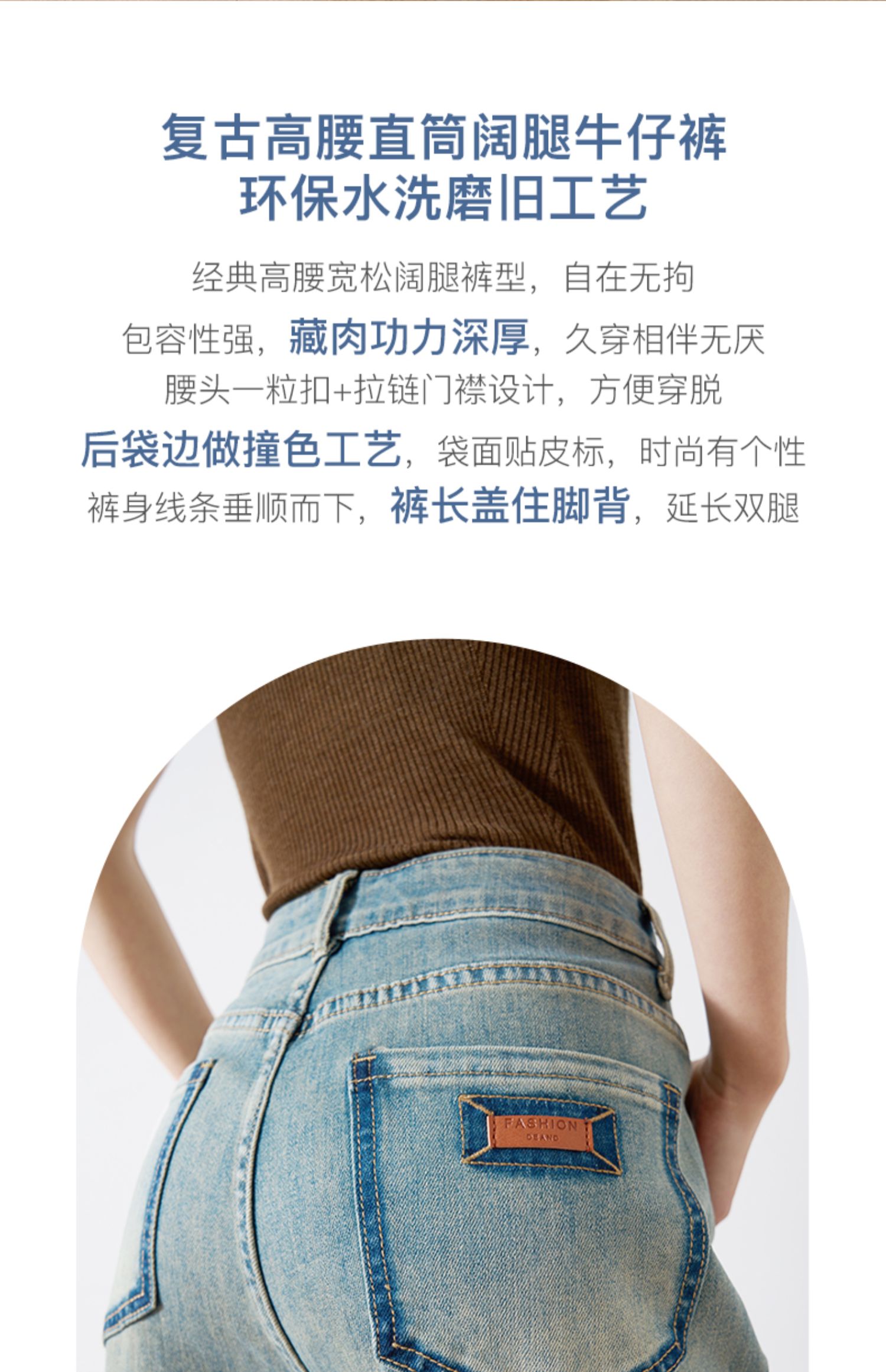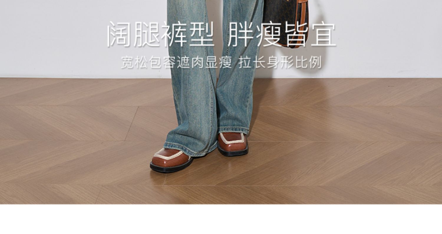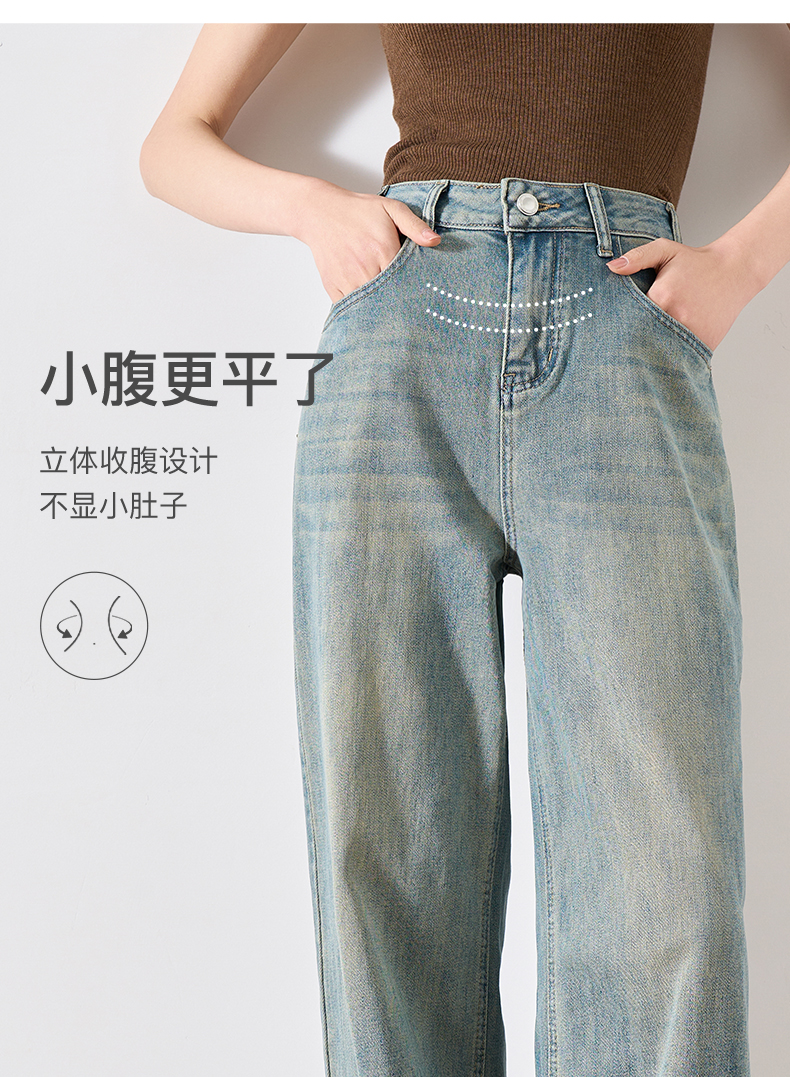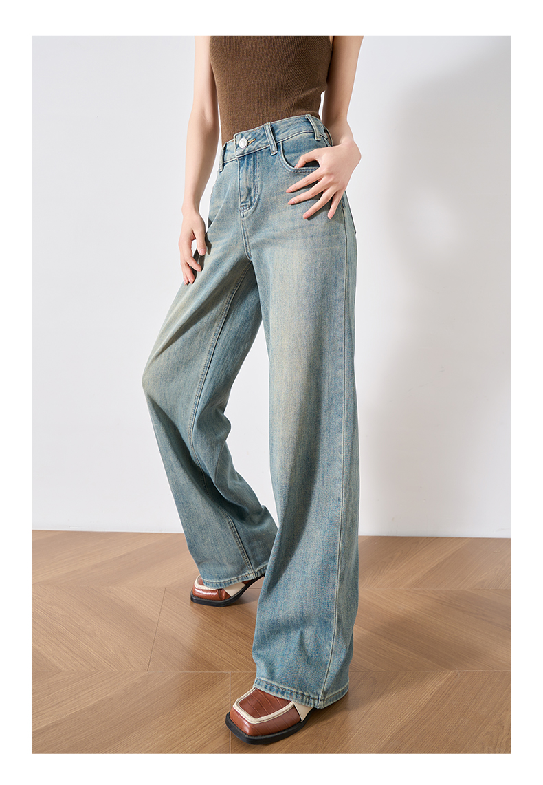 OLrain欧芮儿复古蓝牛仔裤女春季2024年新款高腰百搭直筒阔腿裤