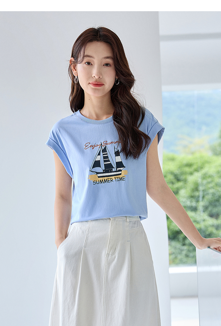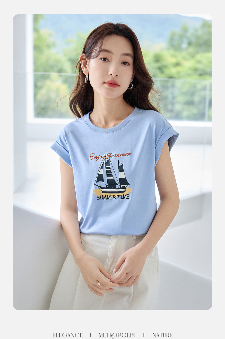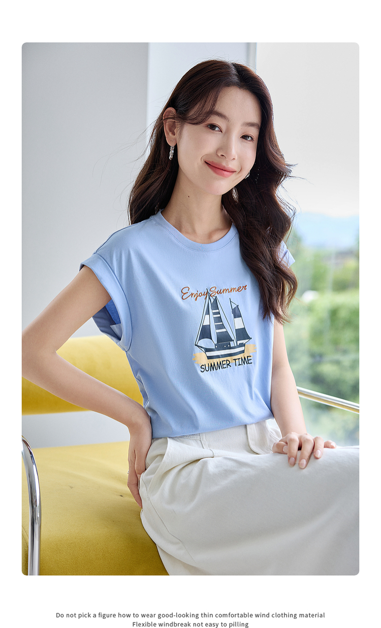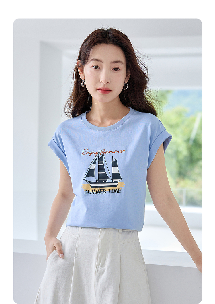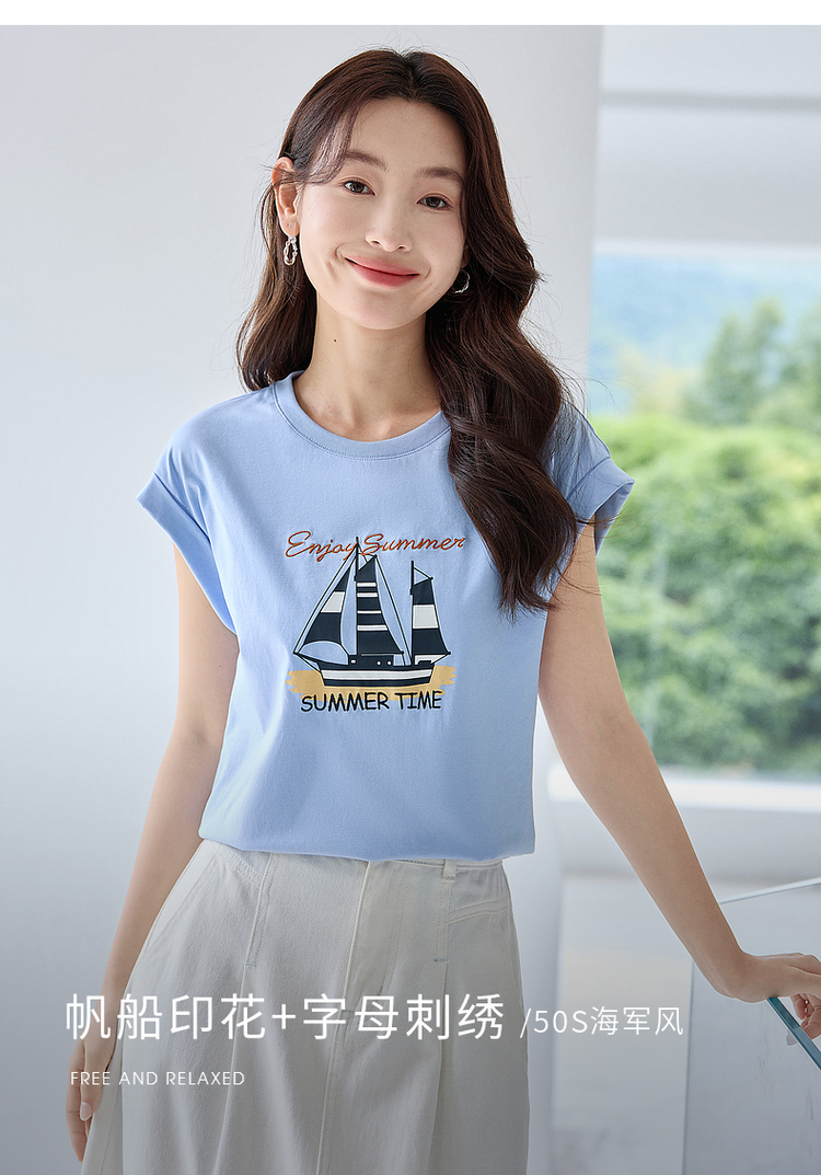 【专属特价】熙世界海军风帆船印花T恤2025夏季新款宽松显瘦圆领设计感上衣