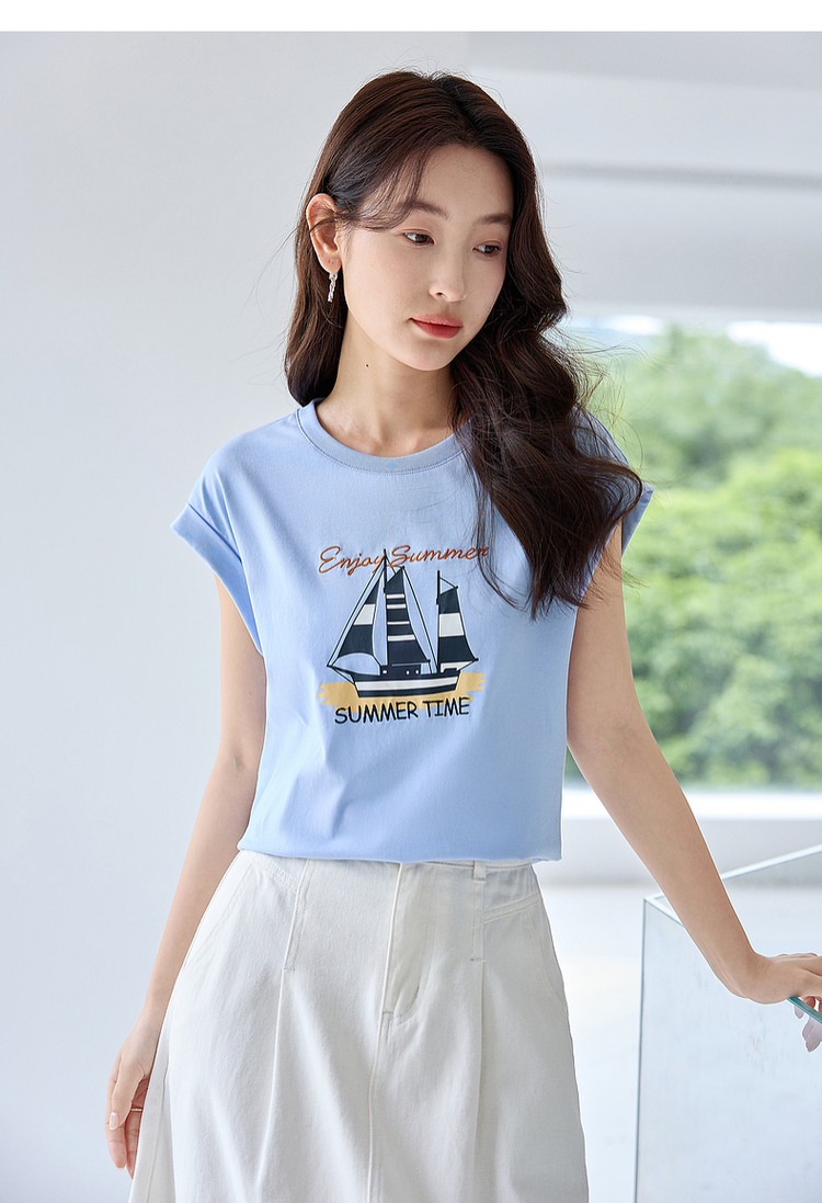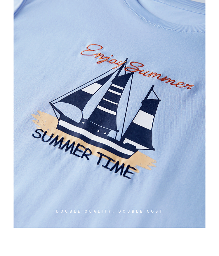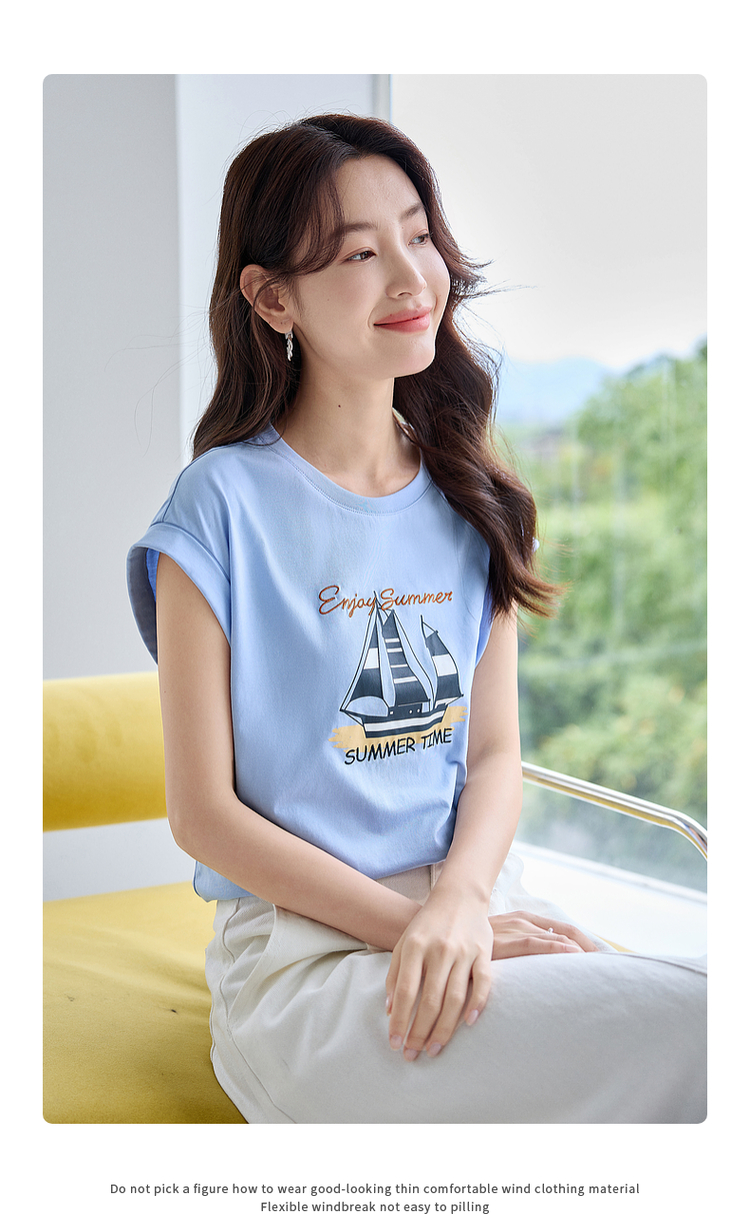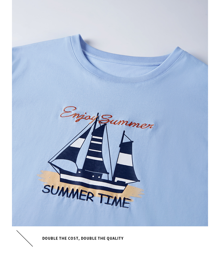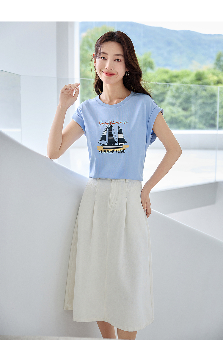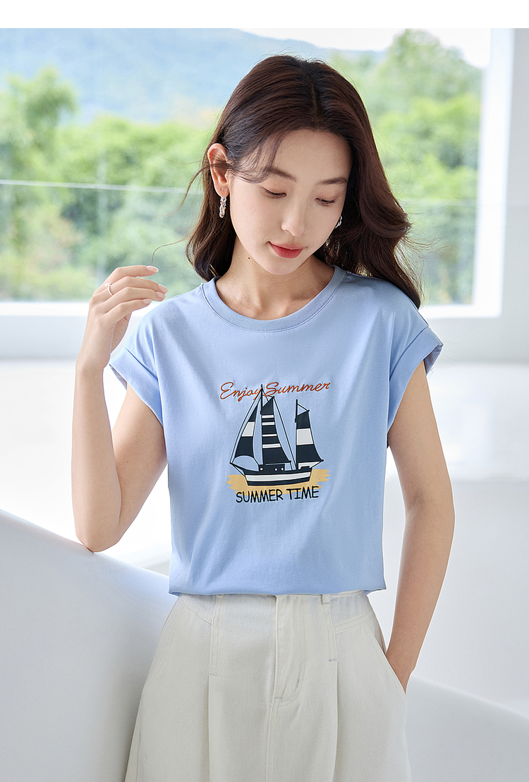 【专属特价】熙世界海军风帆船印花T恤2025夏季新款宽松显瘦圆领设计感上衣