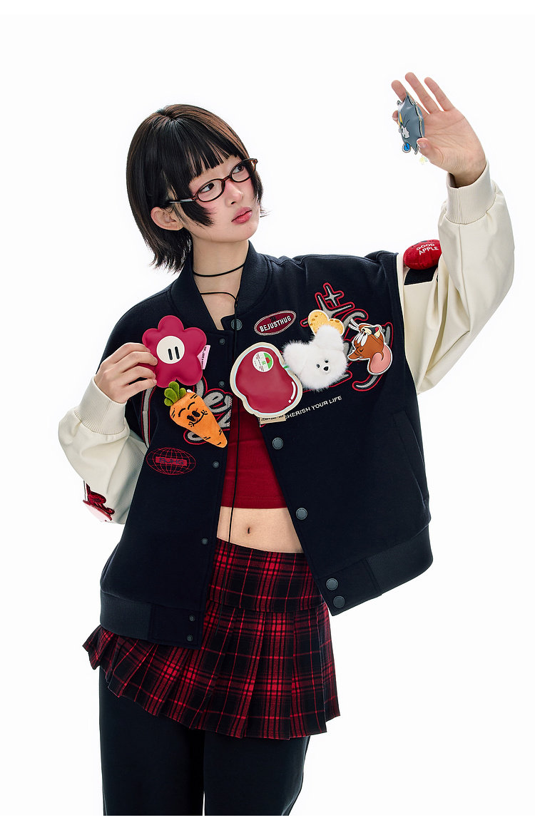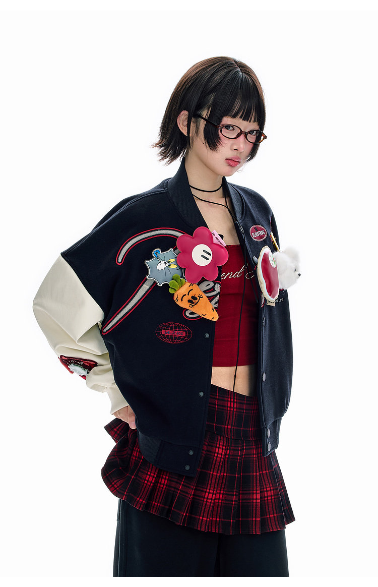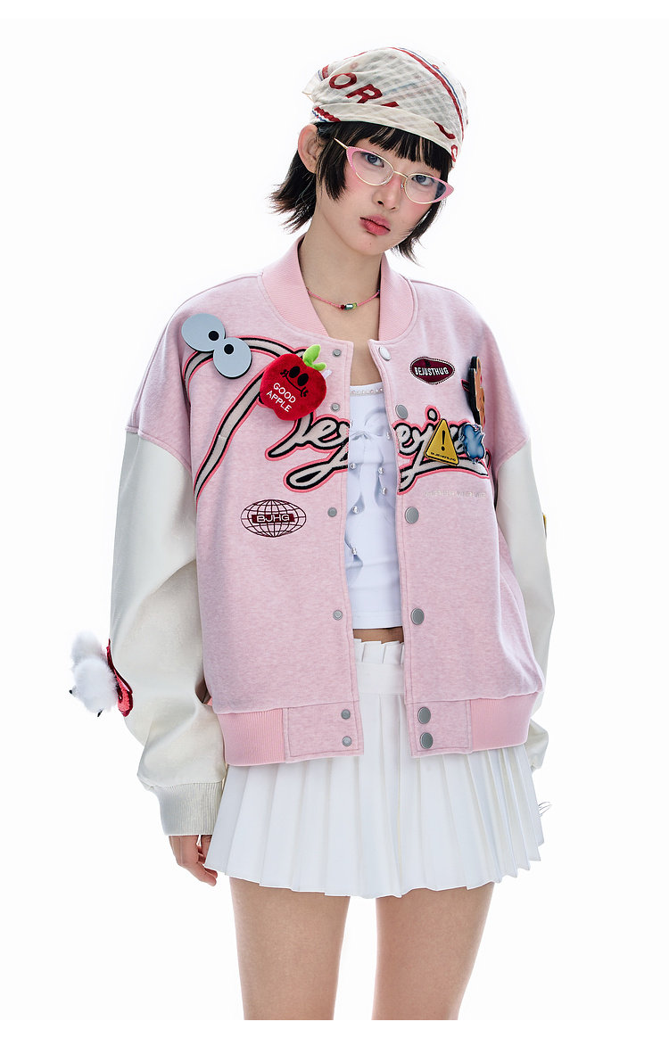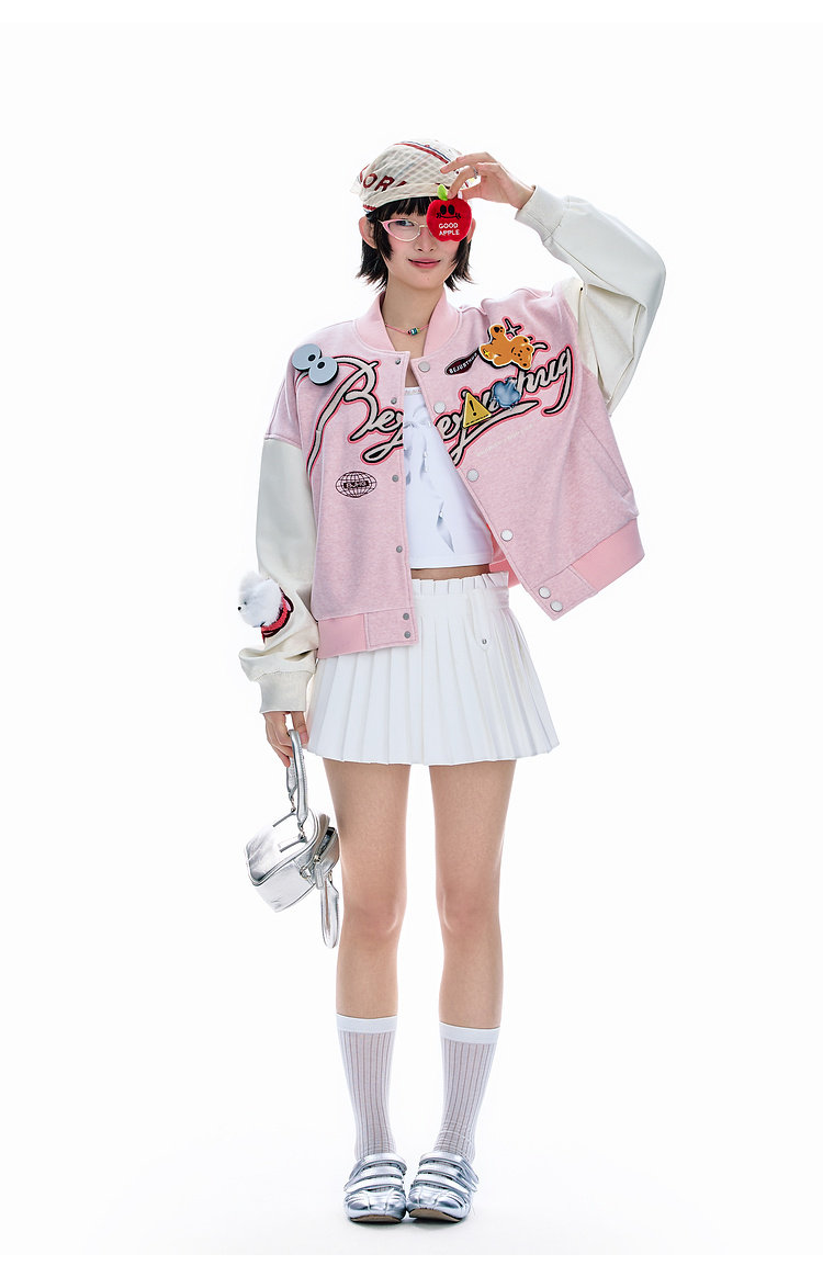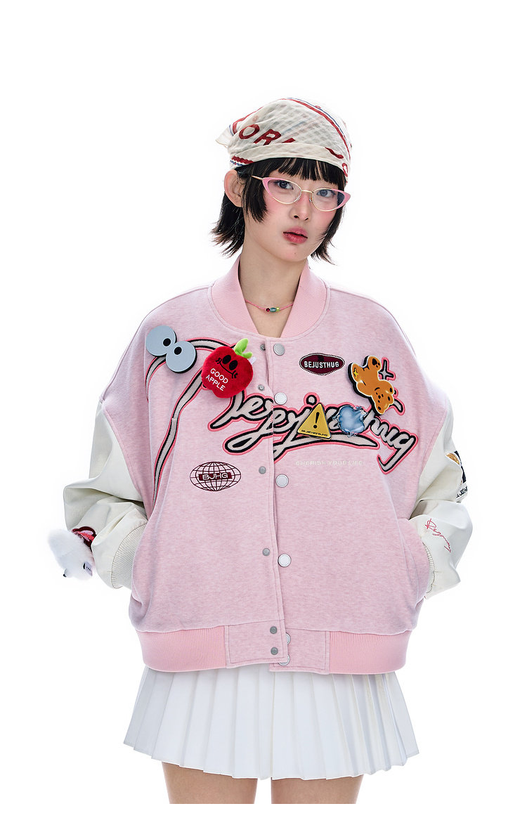 BJHG不计后果贴贴棒球服女款春季新款潮牌美式拼料蛋白皮夹克外套