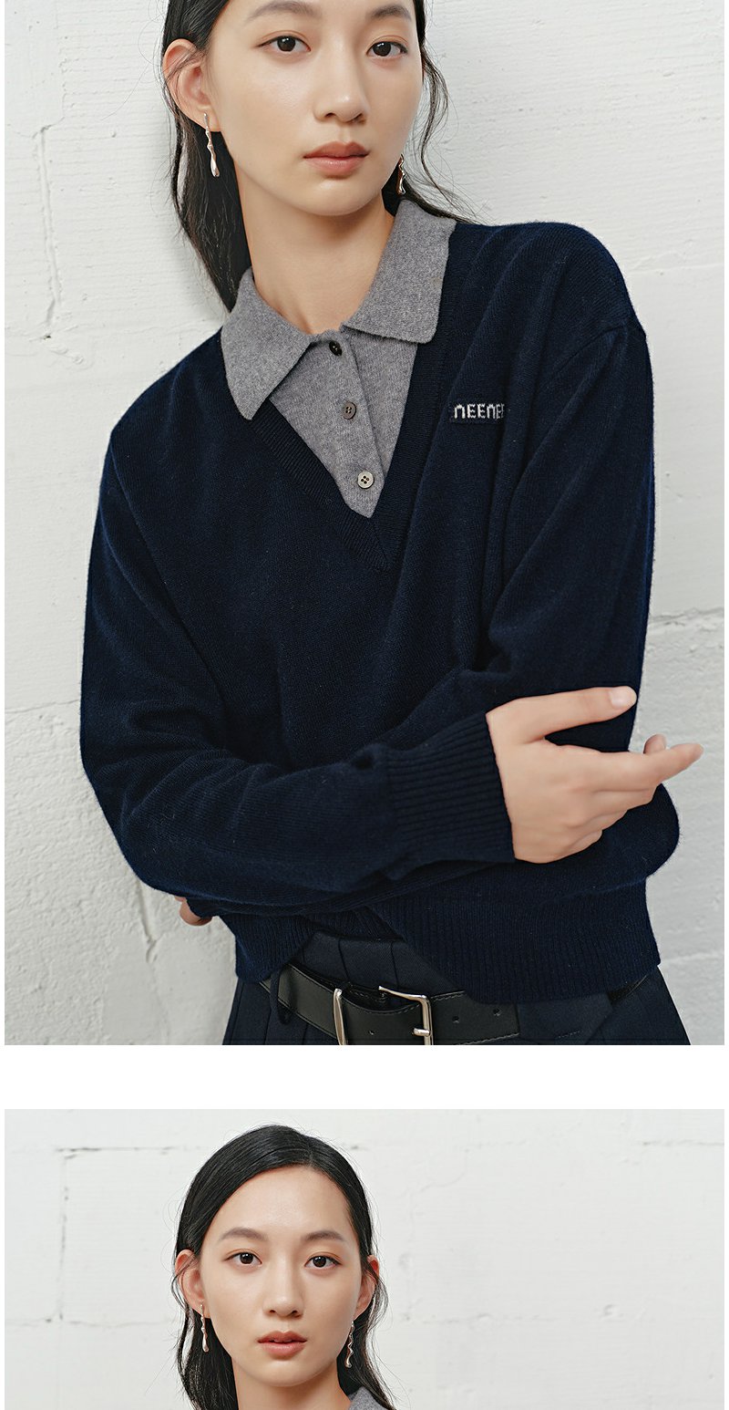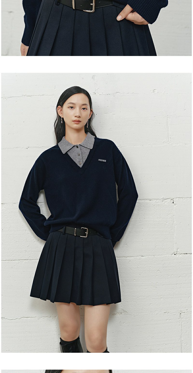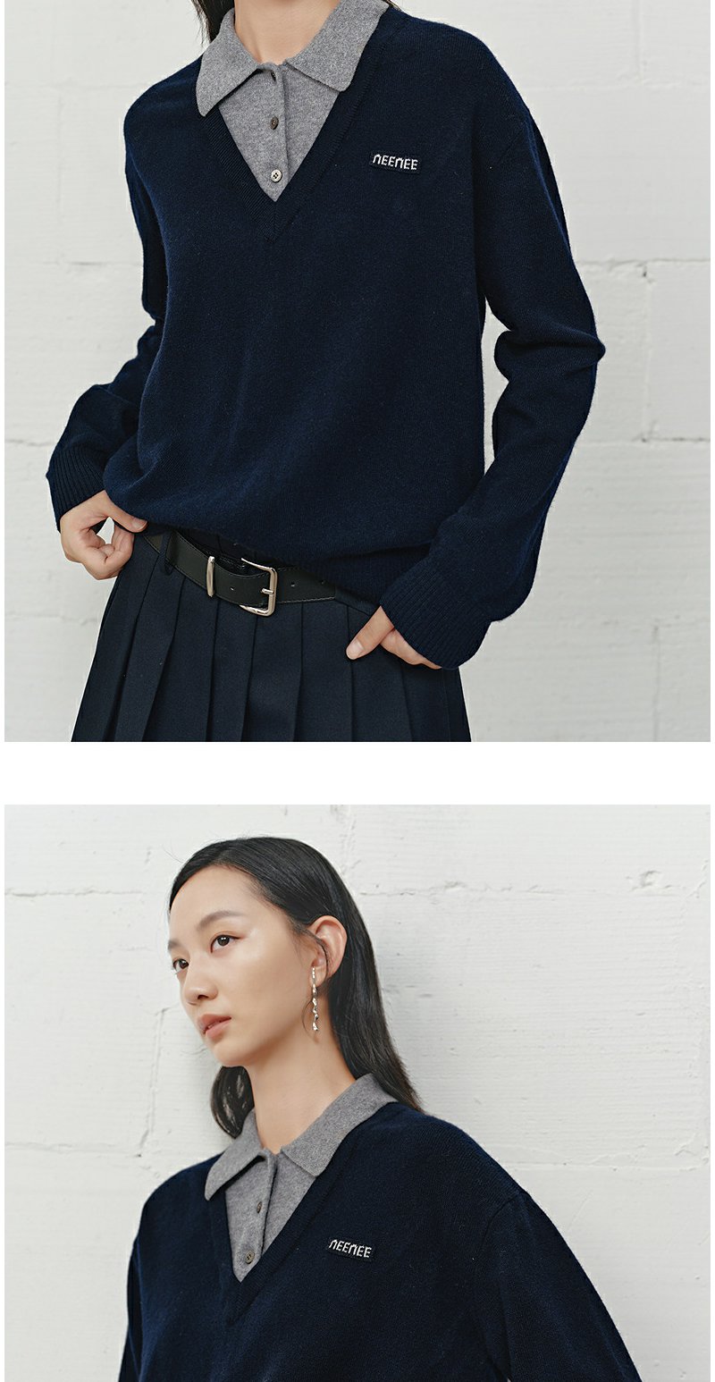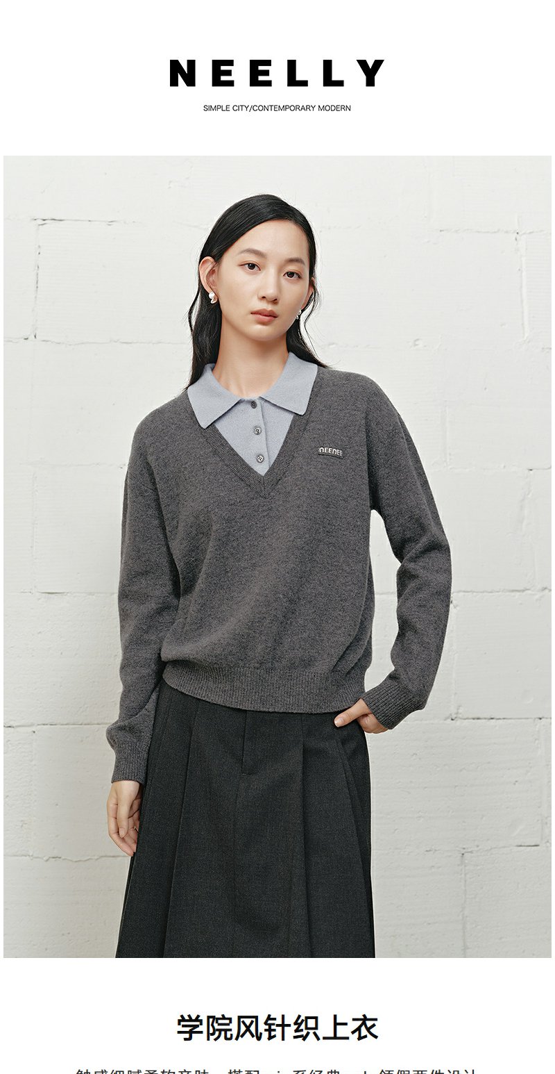 NEELLY纳俪商场同款冬季新款学院风显白宽松针织女撞色慵懒风上衣N25101A01001