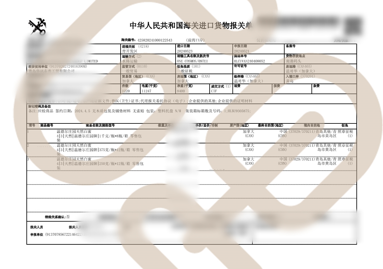 下图为百里家枫糖报关单和检疫证
