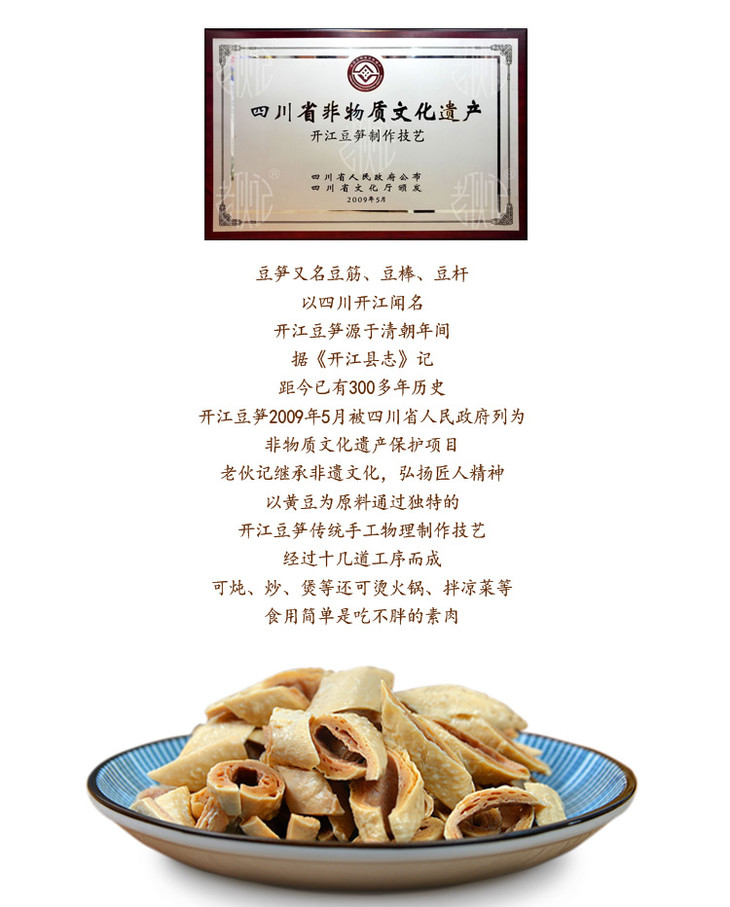 继承非遗文化,发扬匠人精神。以黄豆和黑豆为原料通过独特的开江豆笋传统手工物理制作技艺,经过十几到工序而成。可炖、炒、煲等,还可以烫火锅、拌凉菜等,食用简单是吃不胖的素肉。