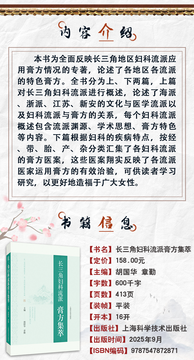 本书为全面反映长三角地区妇科流派应用膏方情况的专著,论述了各地区各流派的特色膏方。全书分为上、下两篇,上篇对长三角妇科流派进行概述,论述了海派、浙派、江苏、新安的文化与医学流派以及妇科流派与膏方的关系,每个妇科流派概述包含流派渊源、学术思想、膏方特色等内容。下篇根据妇科的疾病特点,按经、带、胎、产、杂分类汇集了各妇科流派的膏方医案,这些医案翔实反映了各流派医家运用膏方的有效治验,可供读者学习研究,以更好地造福于广大女性。