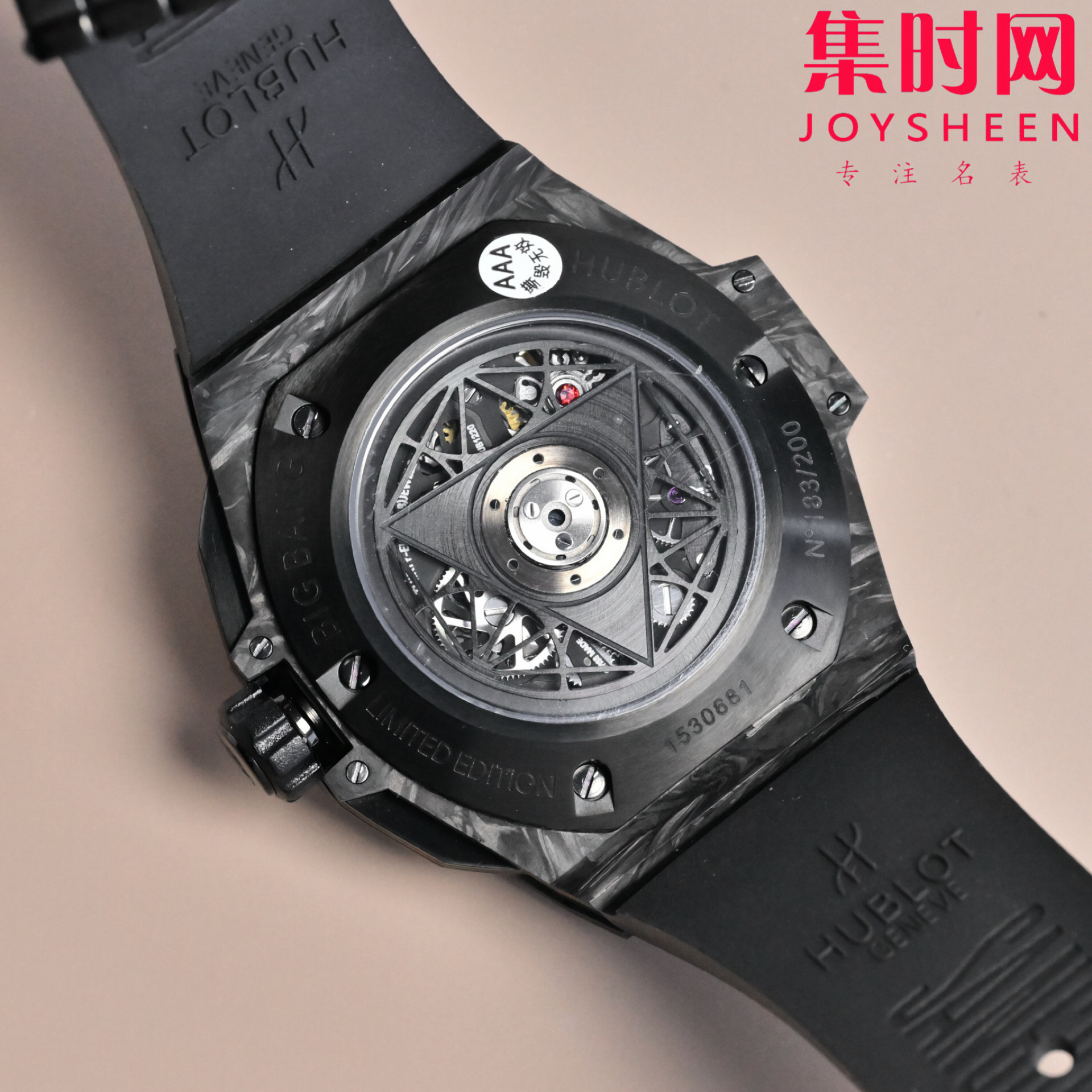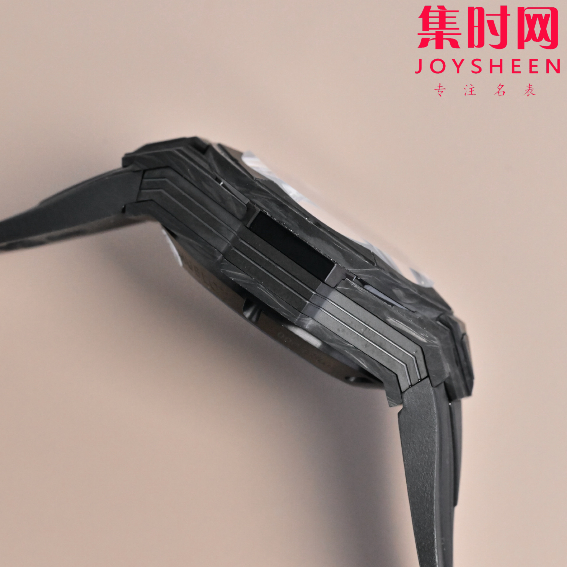 1️⃣全『碳』纤维45mm表壳直径,独特的材质,呈现哑光质感与立体纹理的完mei融合,上图形元素贯穿表壳,通过切割和雕刻融入到六边形表圈之中。6颗H型钛金螺钉牢固定表圈。表耳处带有很强的设计感,角度陡峭,线条硬朗。