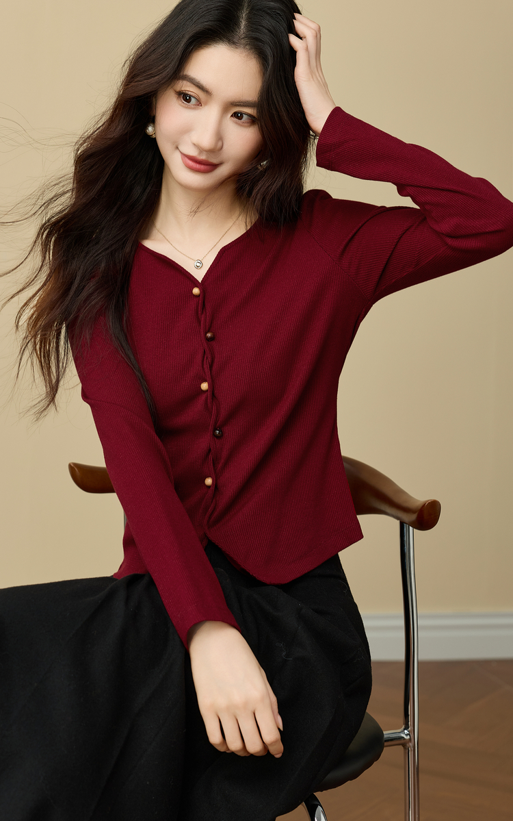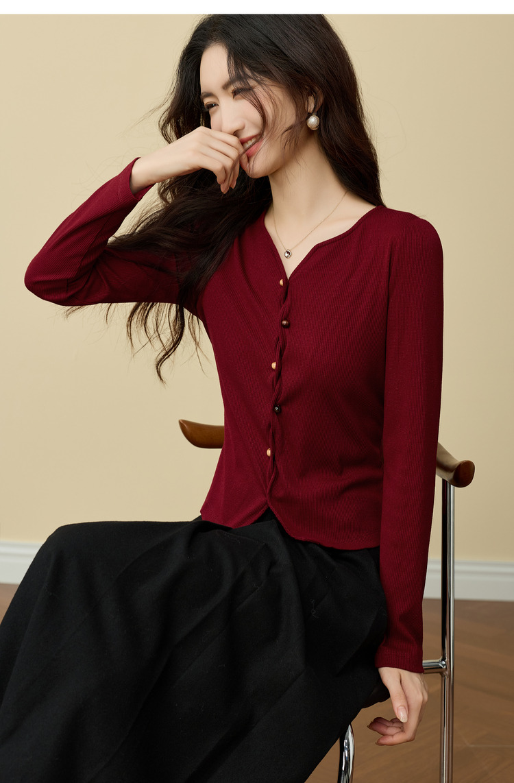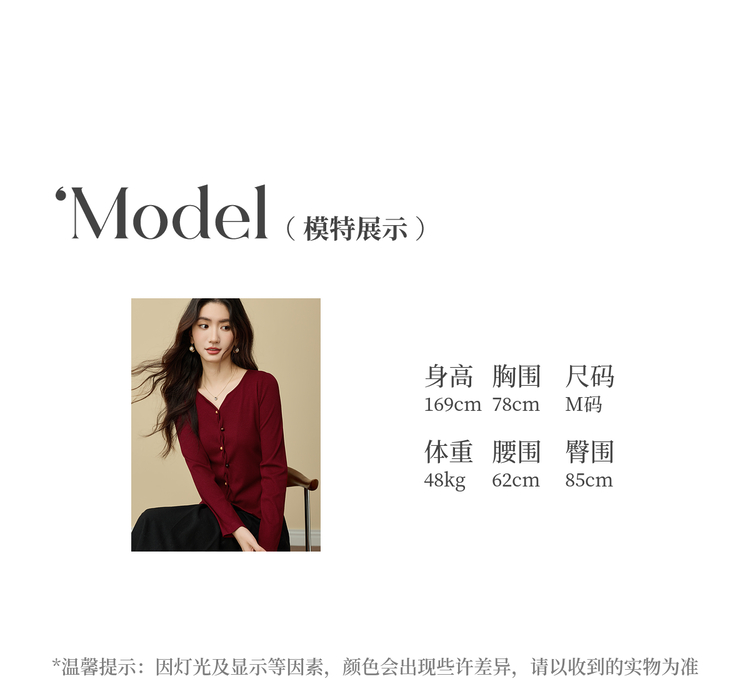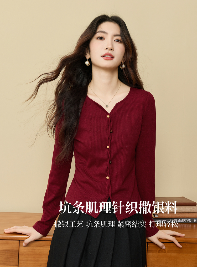 【11/19新品】熙世界【海棠红毛衣】撒银肌理套头针织衫女25年秋冬长袖V领上衣