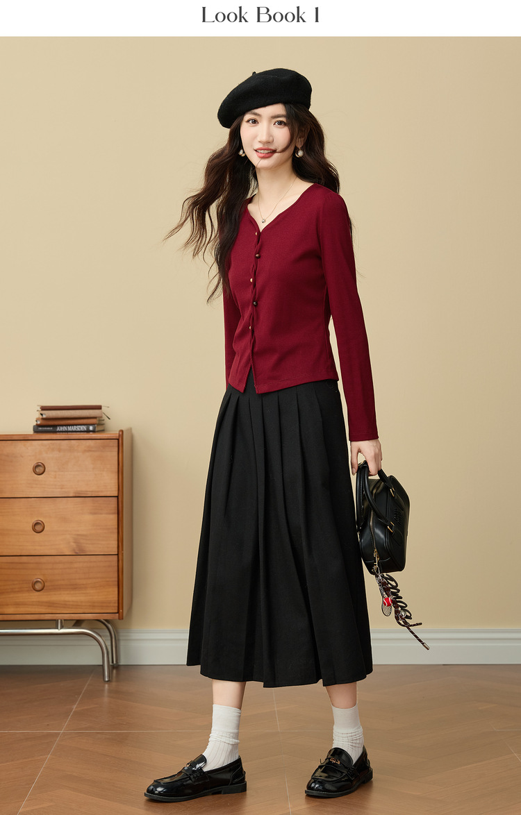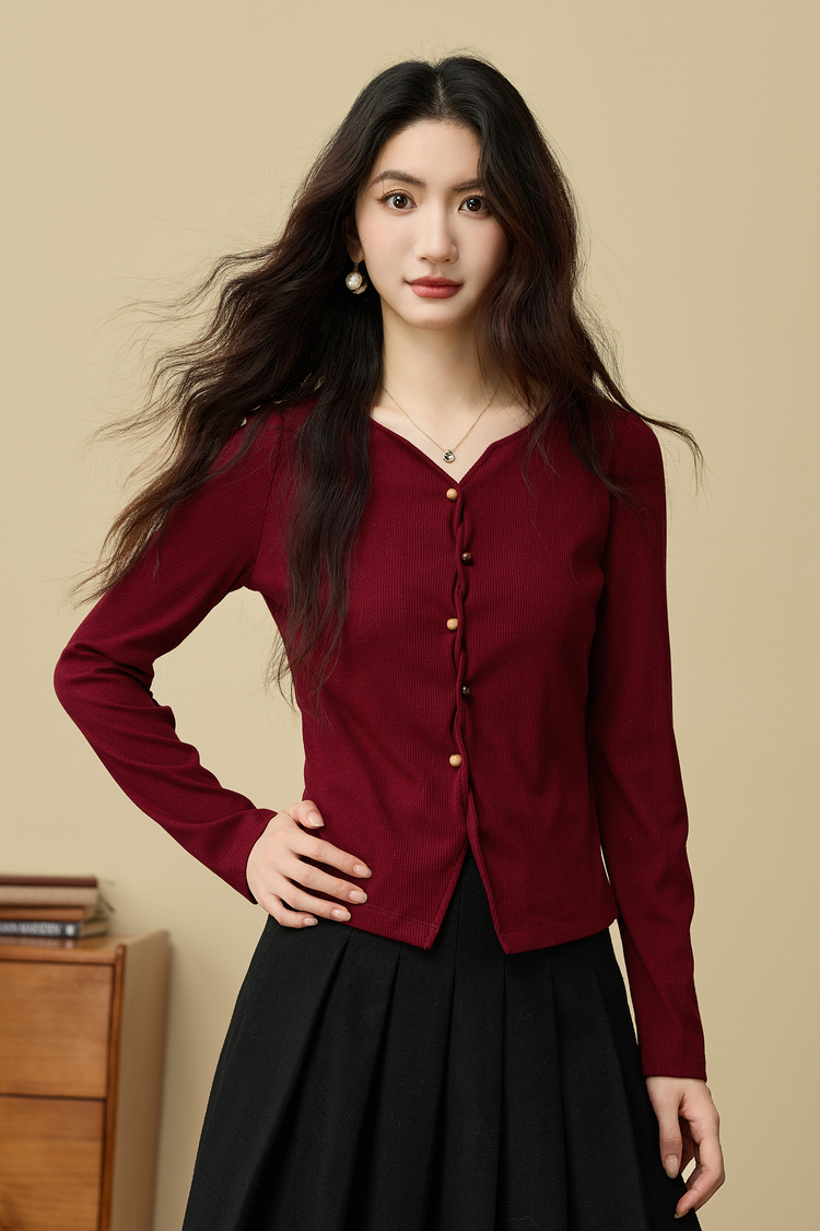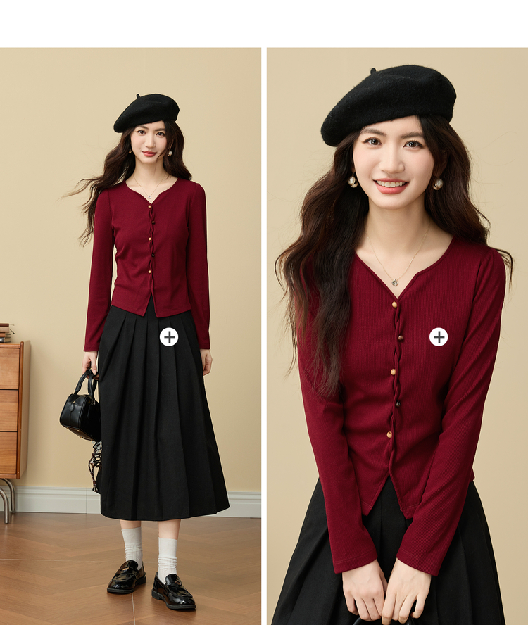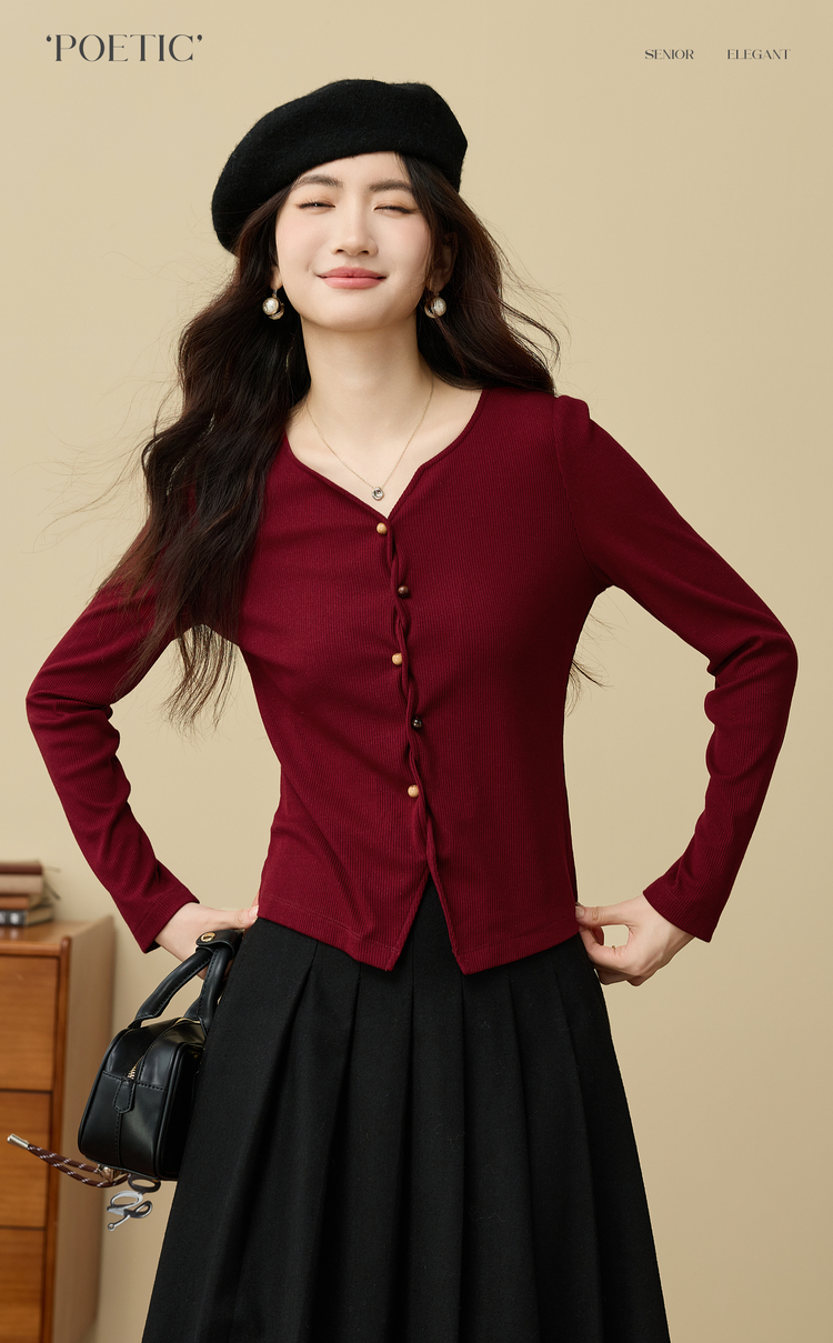 【11/19新品】熙世界【海棠红毛衣】撒银肌理套头针织衫女25年秋冬长袖V领上衣