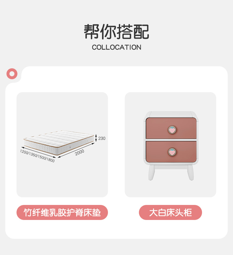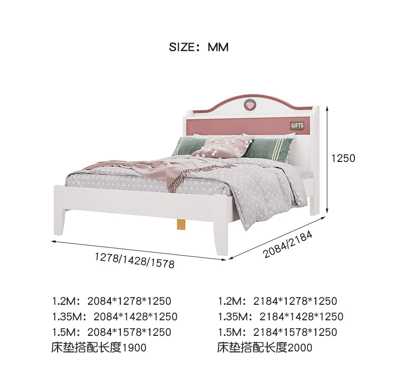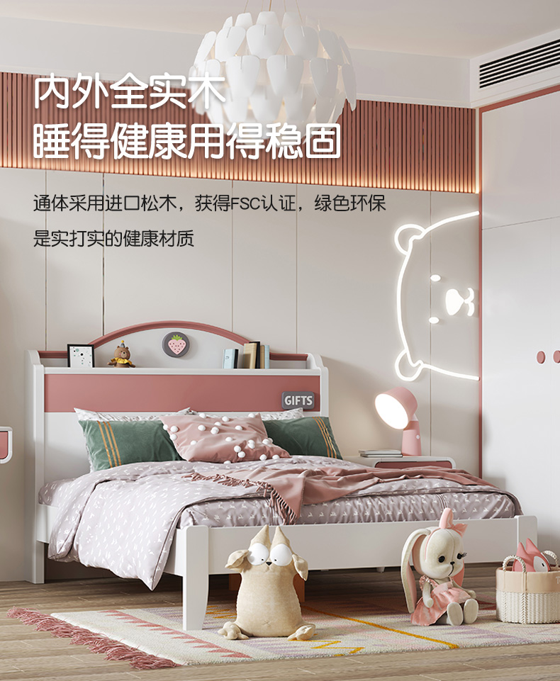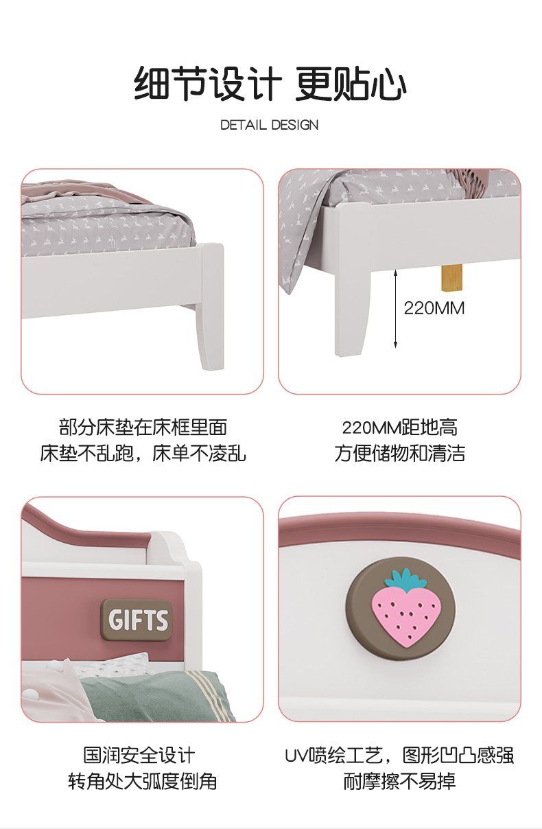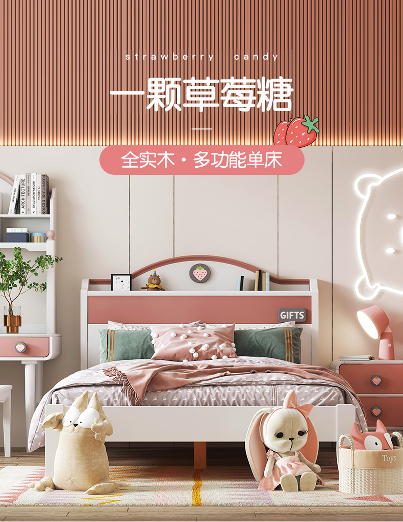 喜梦宝全实木成人床儿童床女孩公主床现代简约型接拼床粉色实木床 草莓糖
