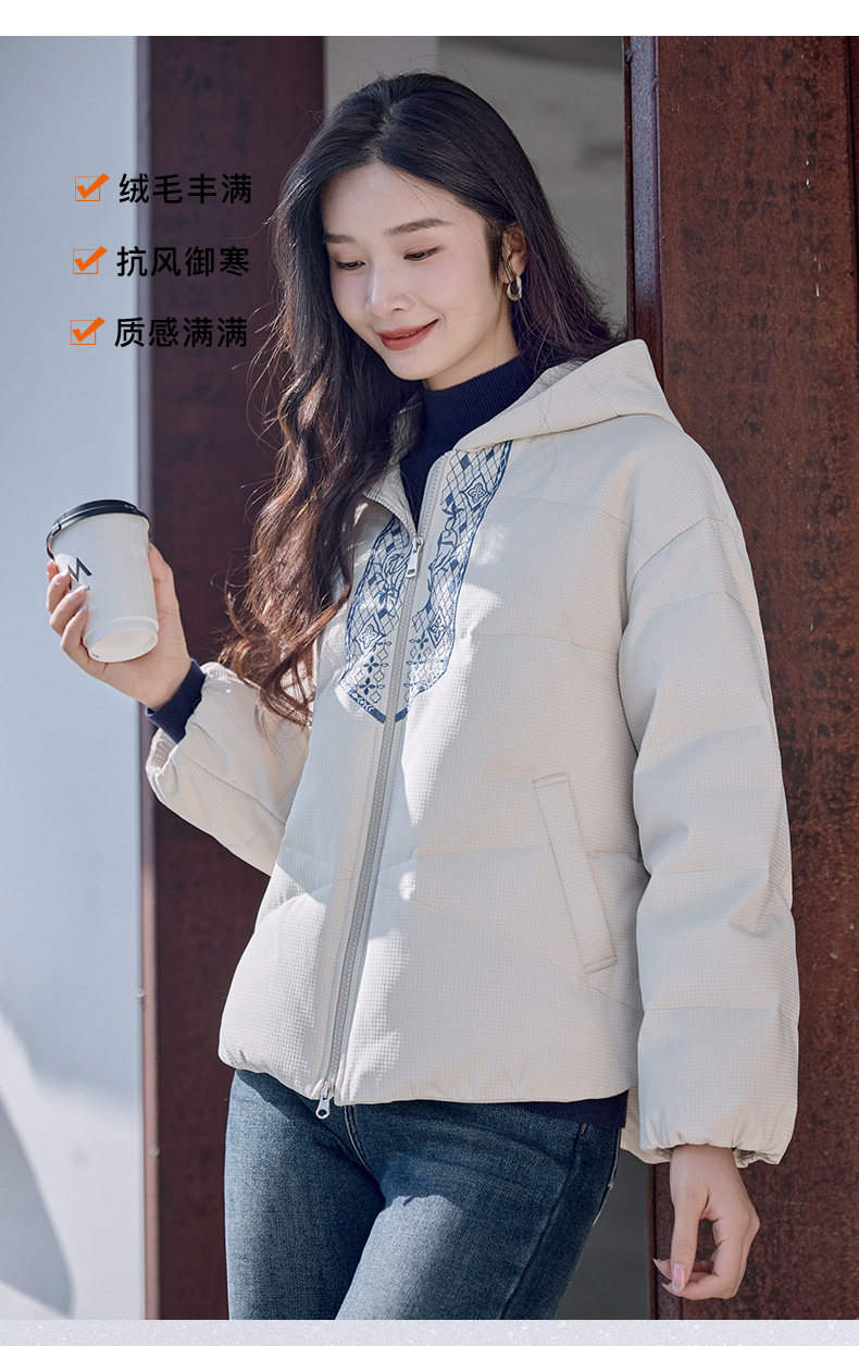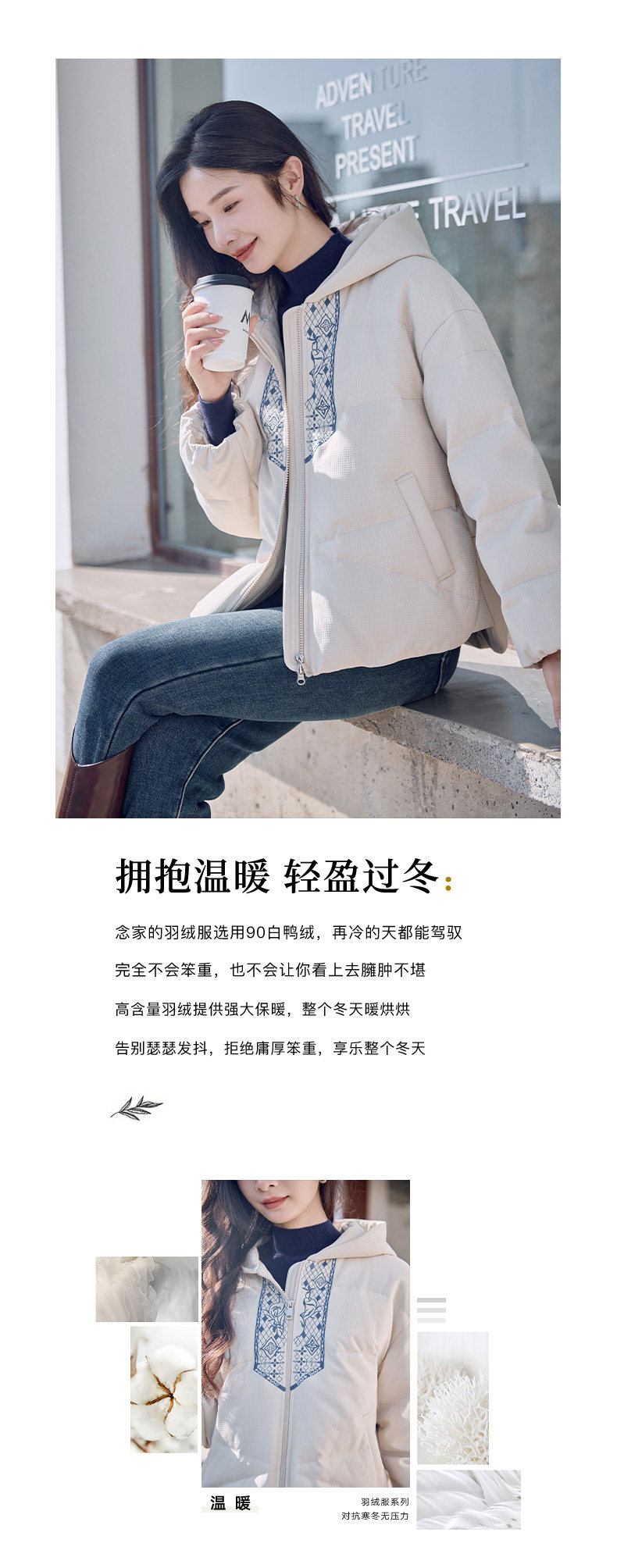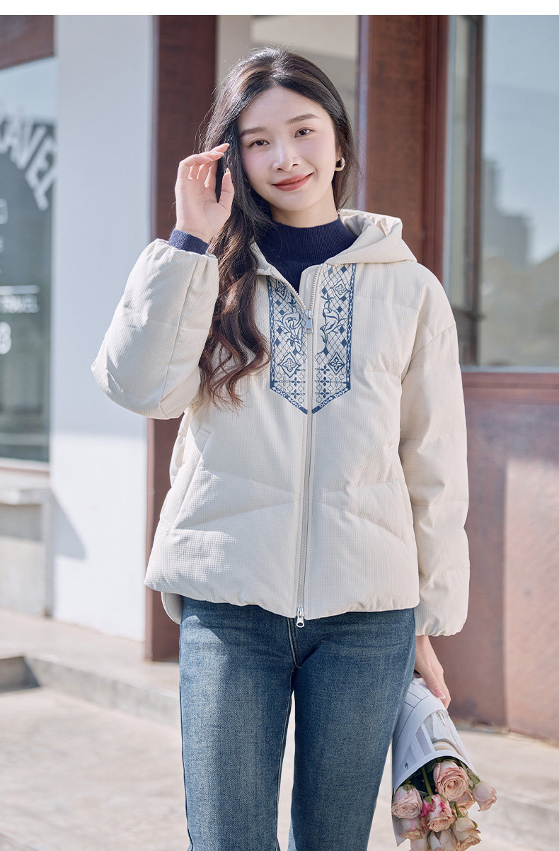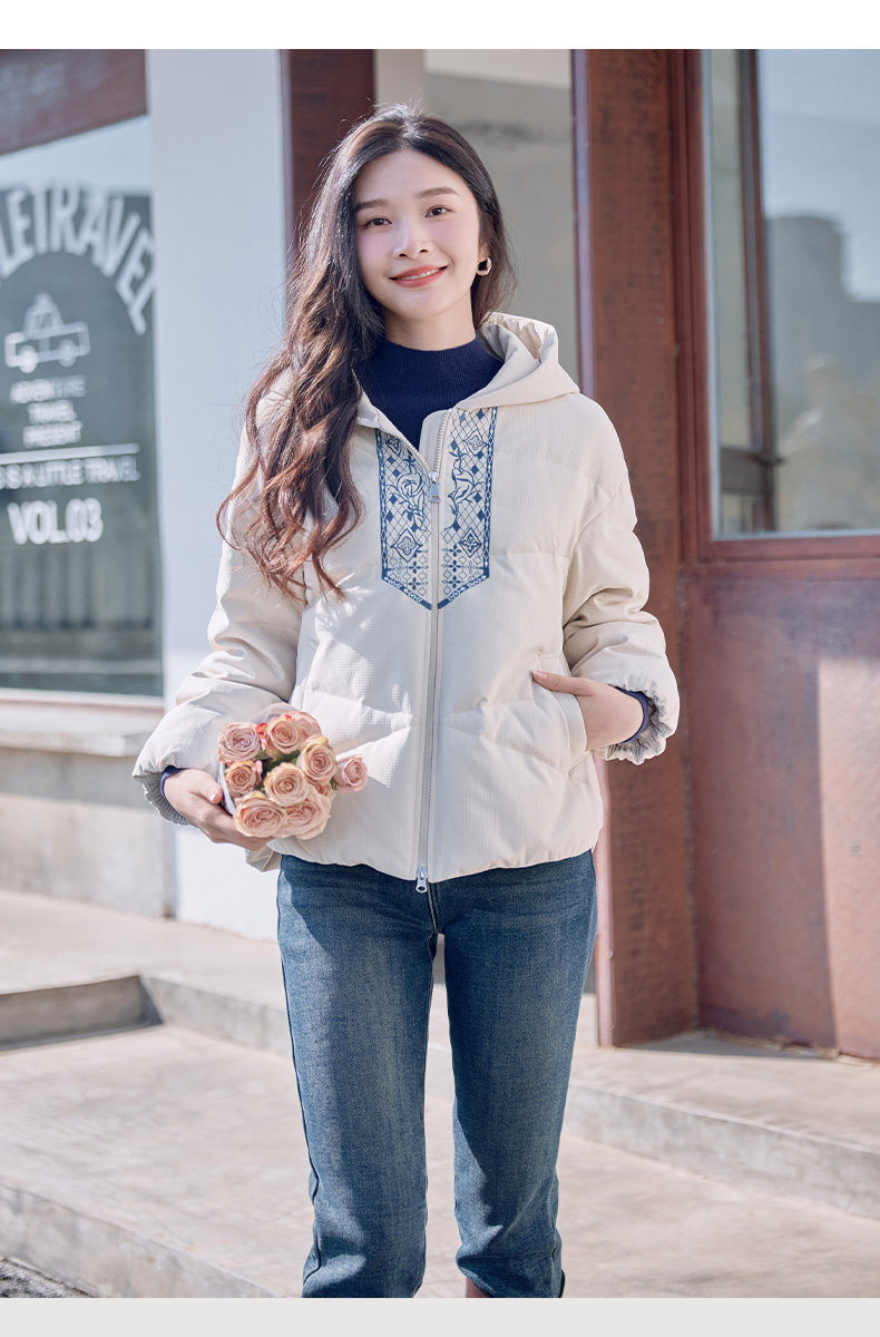 红念米杏色连帽刺绣羽绒服女短款设计感冬季2025新款冬装外套上衣