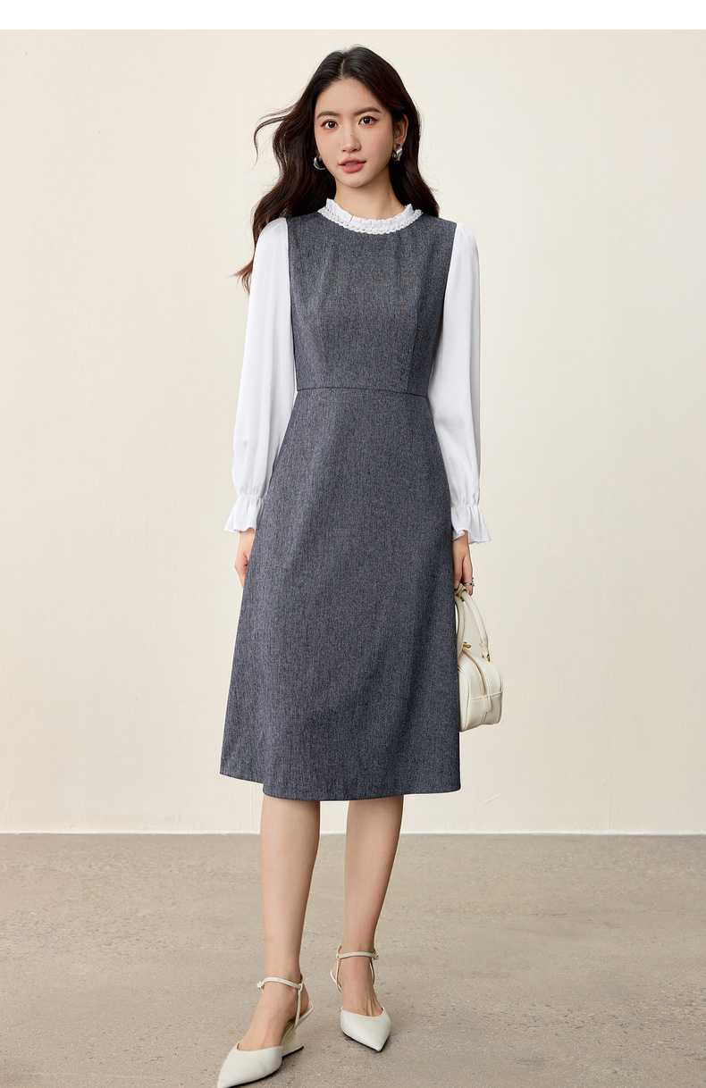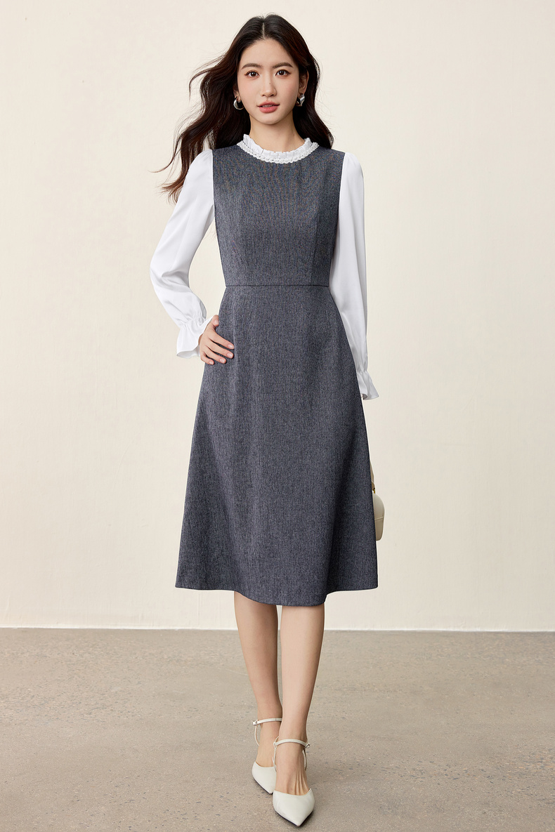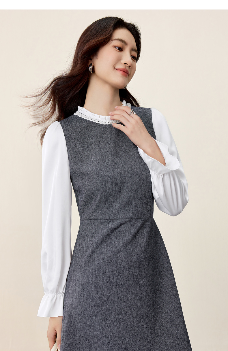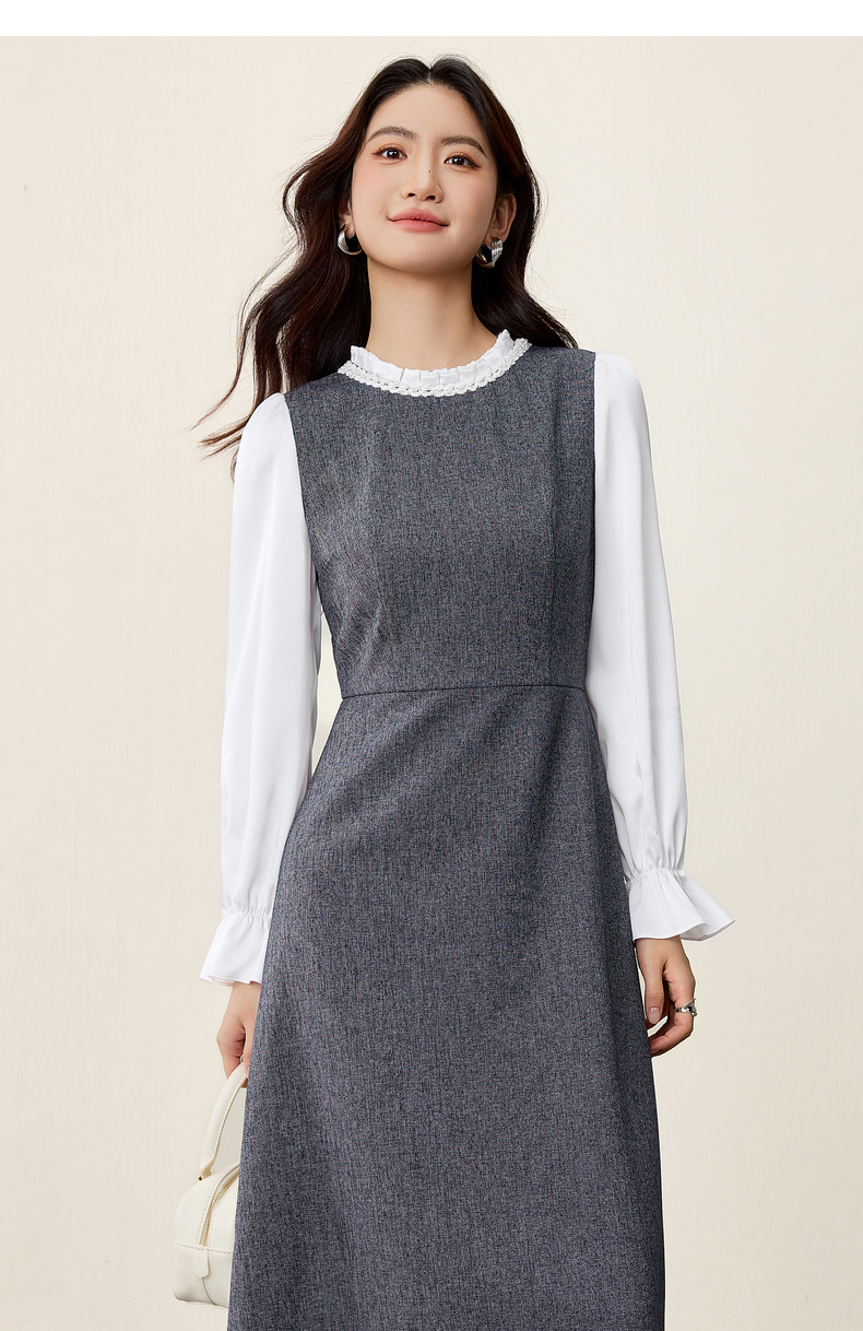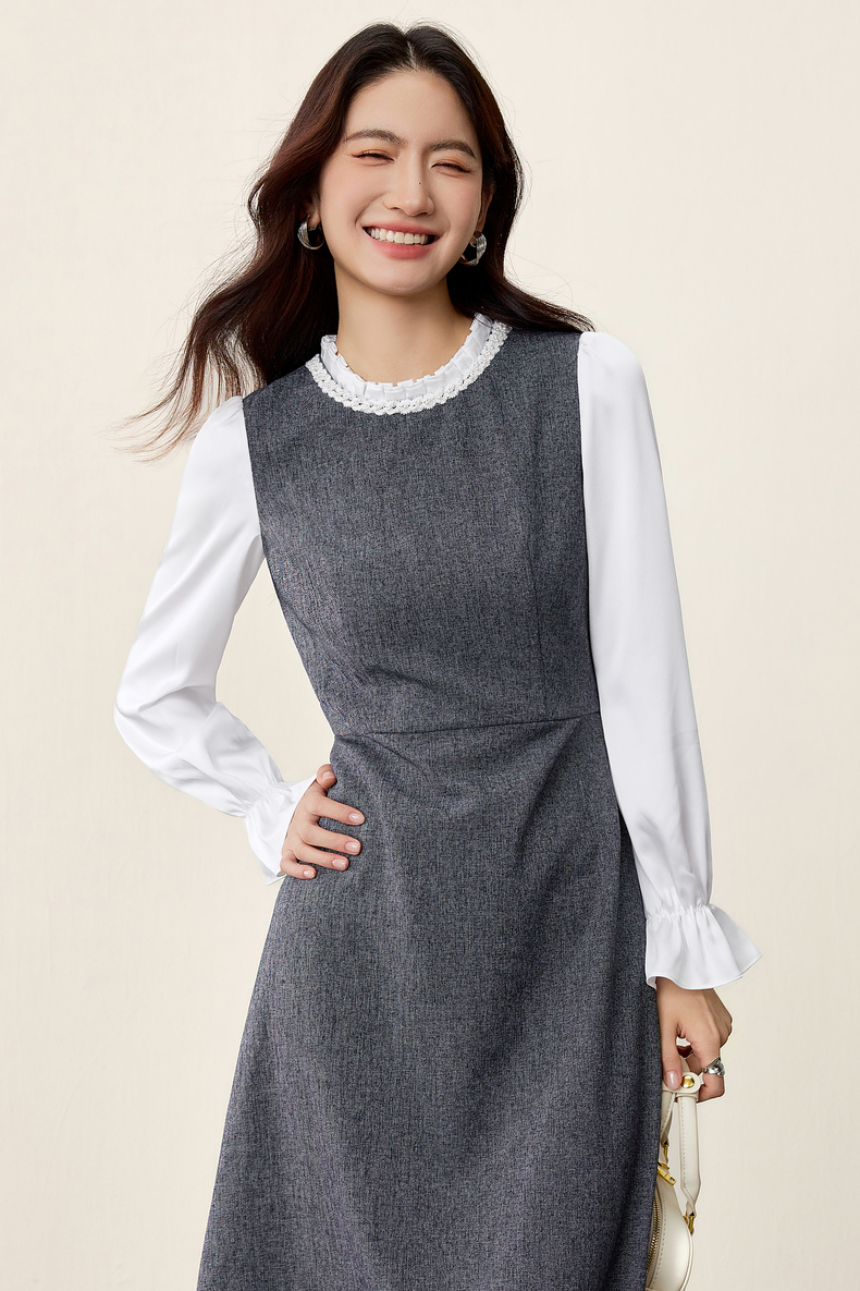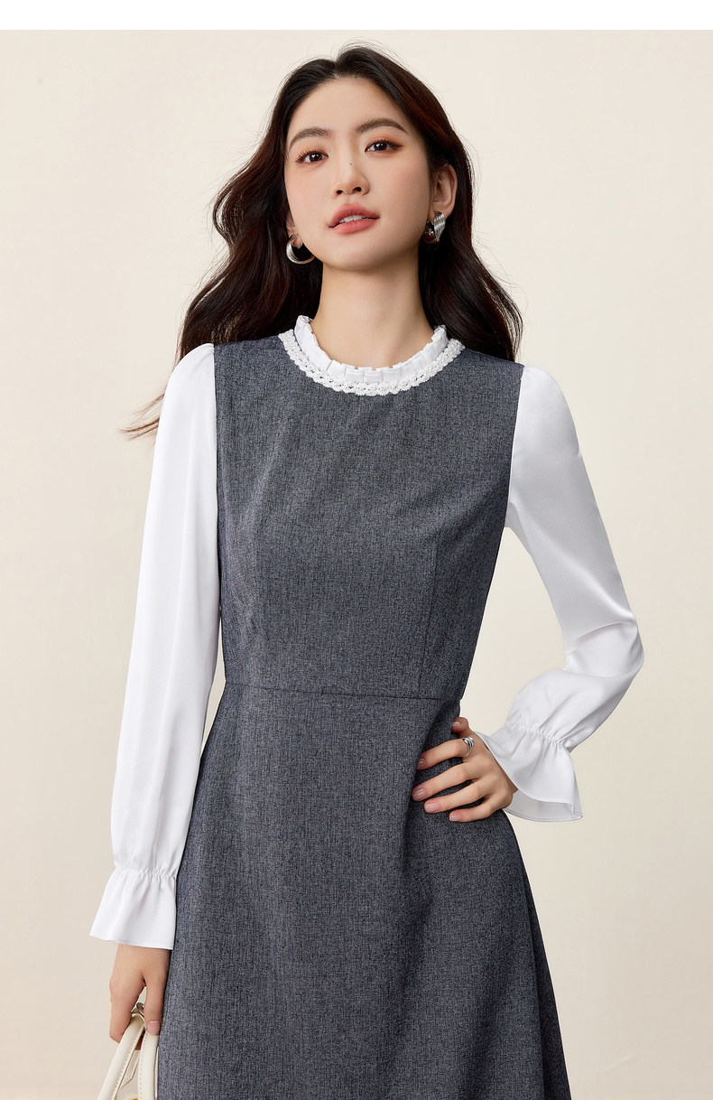 【内购】【假两件】优雅通勤撞色拼接木耳边珍珠花边圆领荷叶袖收腰连衣裙-153LI2646