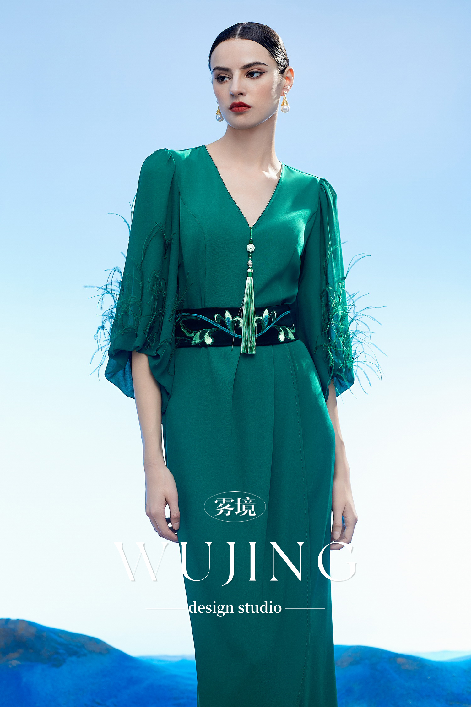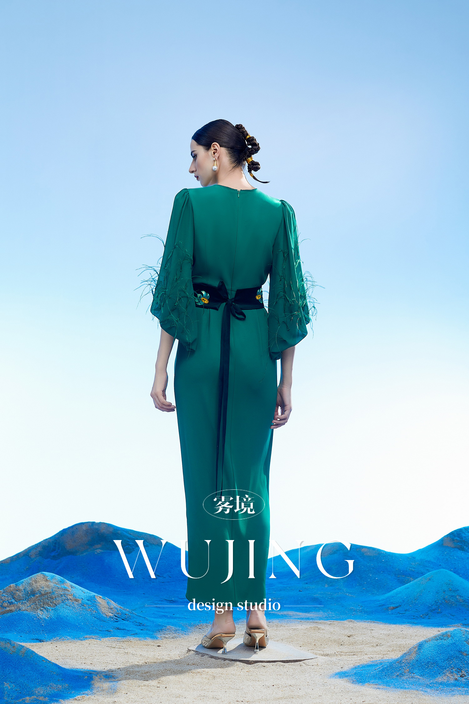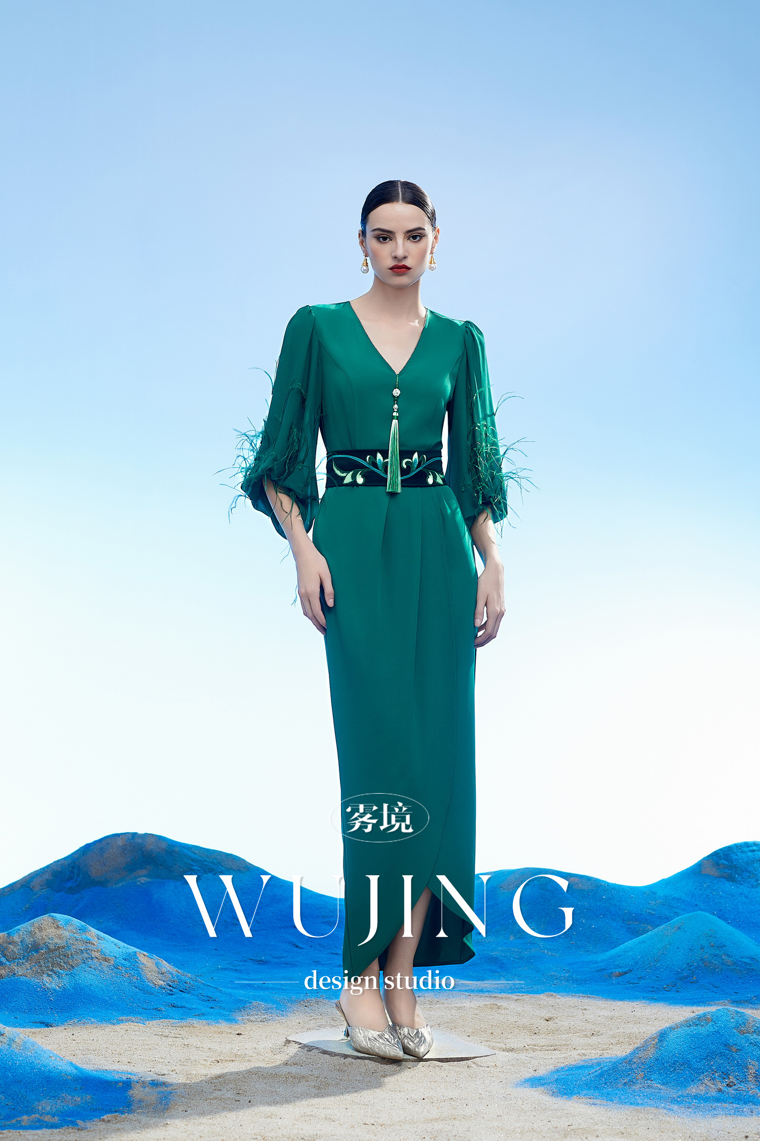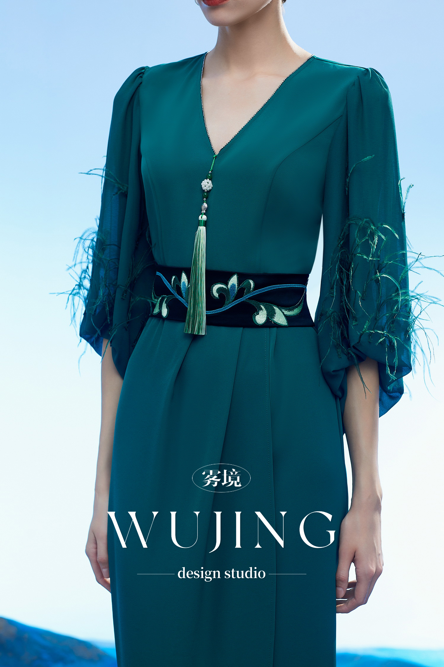 3204035 只此青绿 韩国进口水晶乔其纱进口纹理蜂窝缎连衣裙 雾境