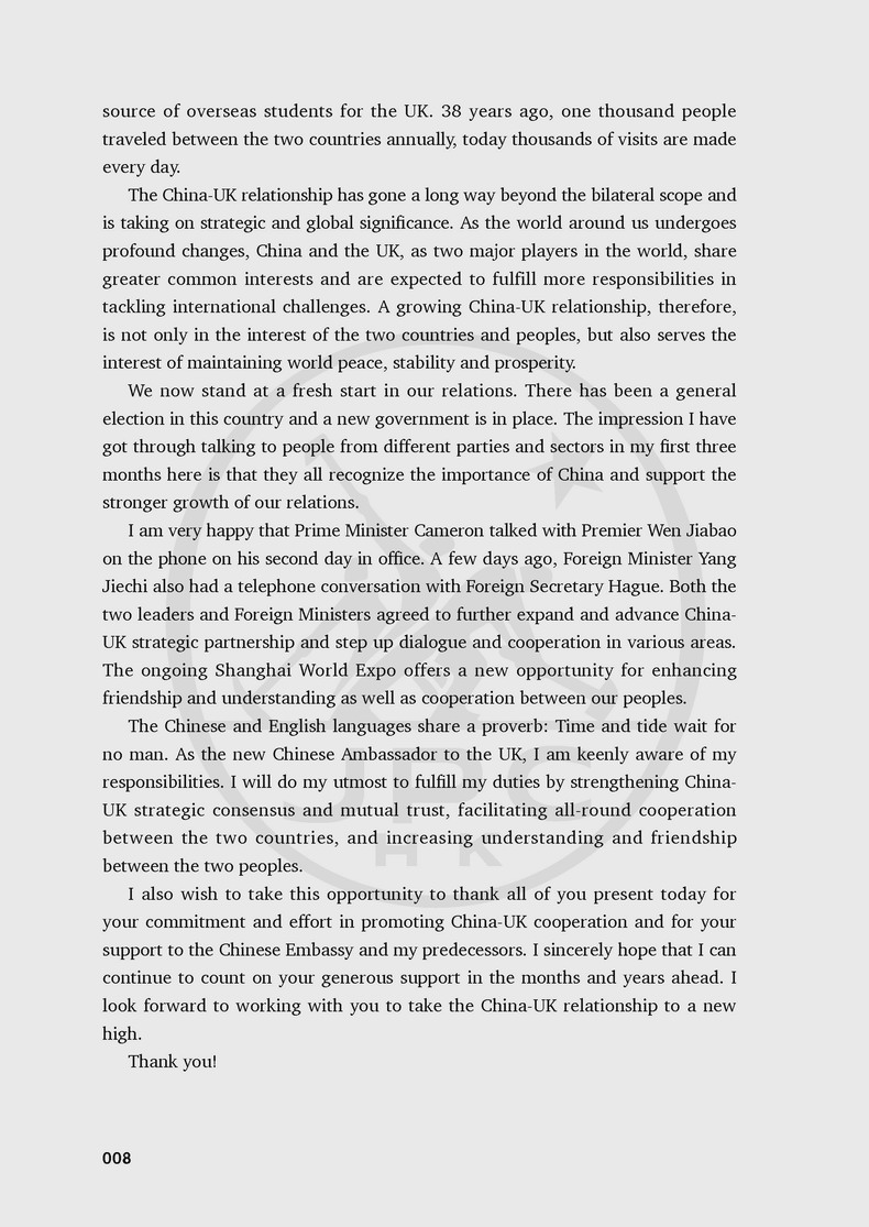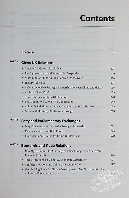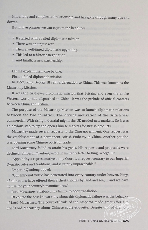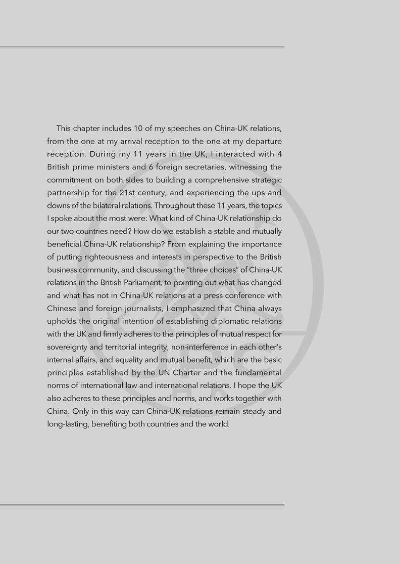 On China-UK Relations has selected 117 speeches from over 700 Liu Xiaoming, Former Chinese Ambassador to UK, had delivered during his 11-year tenure in the UK. The contents spans multiple dimensions: China-UK relations, party and parliamentary exchanges, economic and trade relations, financial cooperation, science and technology coopera tion, ecological and environmental protection, subnational exchanges, cultural exchanges, spring festival celebrations, educational exchange, Confucius institutes, military exchanges, Chinese community, British friends, and understanding between China and the UK.