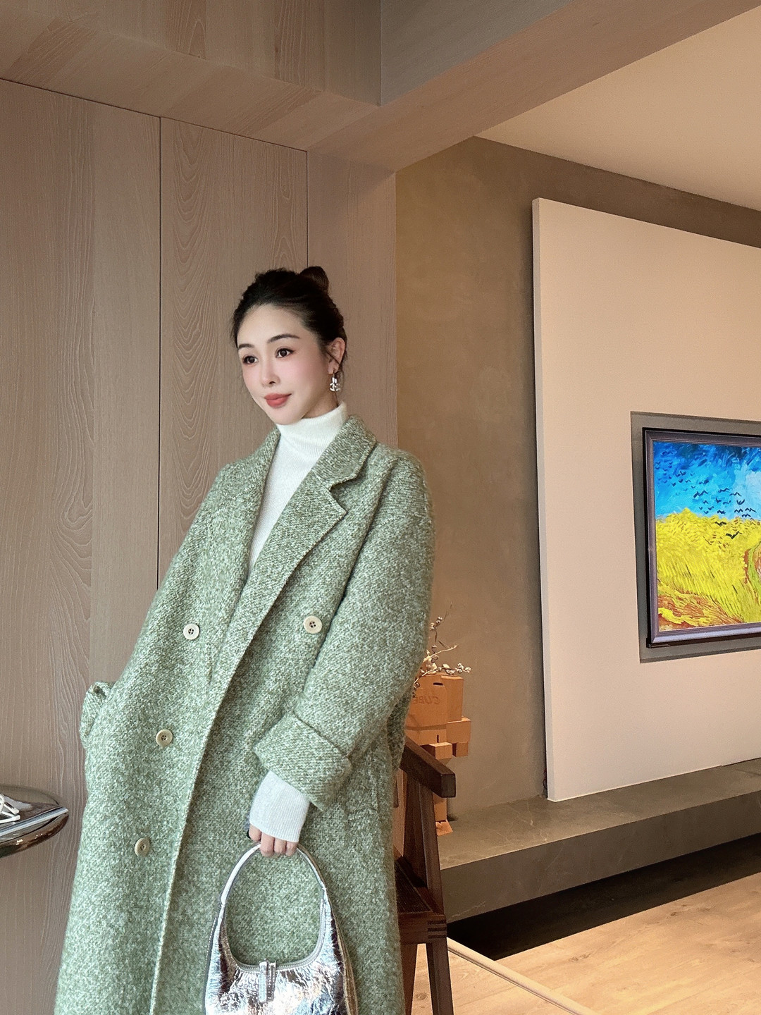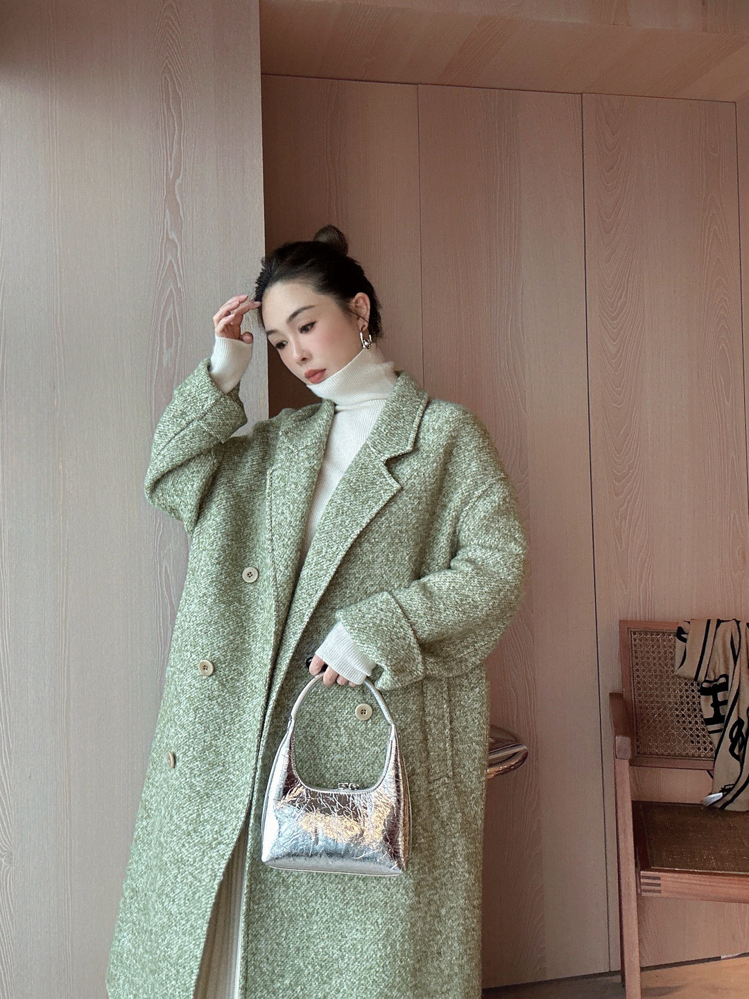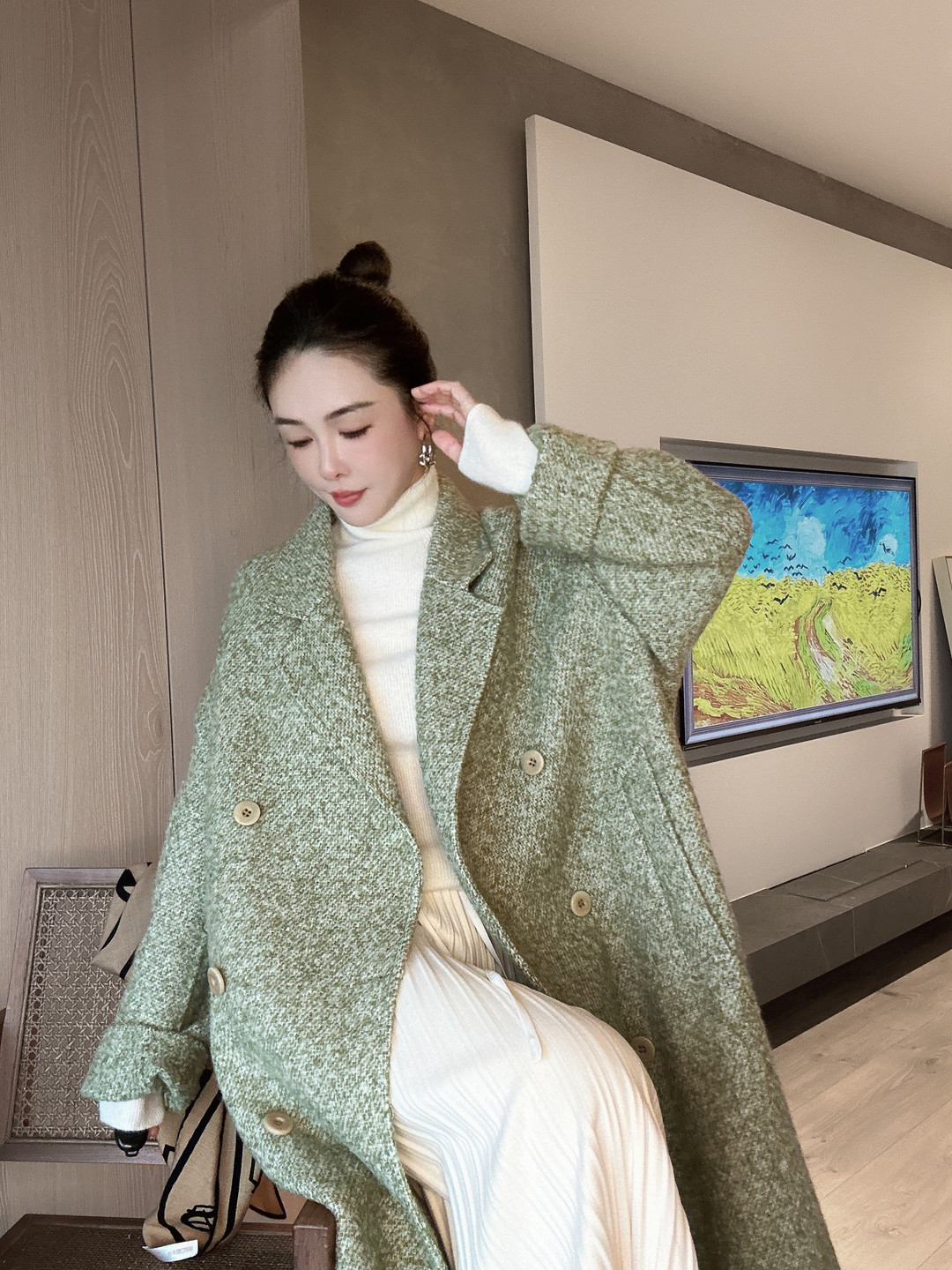 PIANAI冷小姐# 圈圈绒绿色羊驼毛长款六粒扣大衣