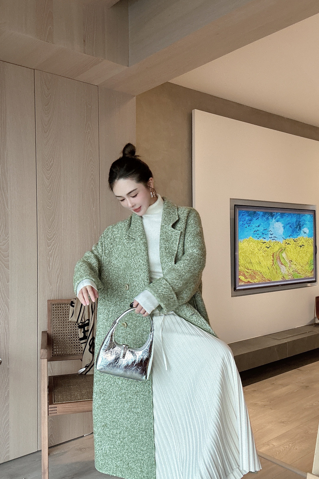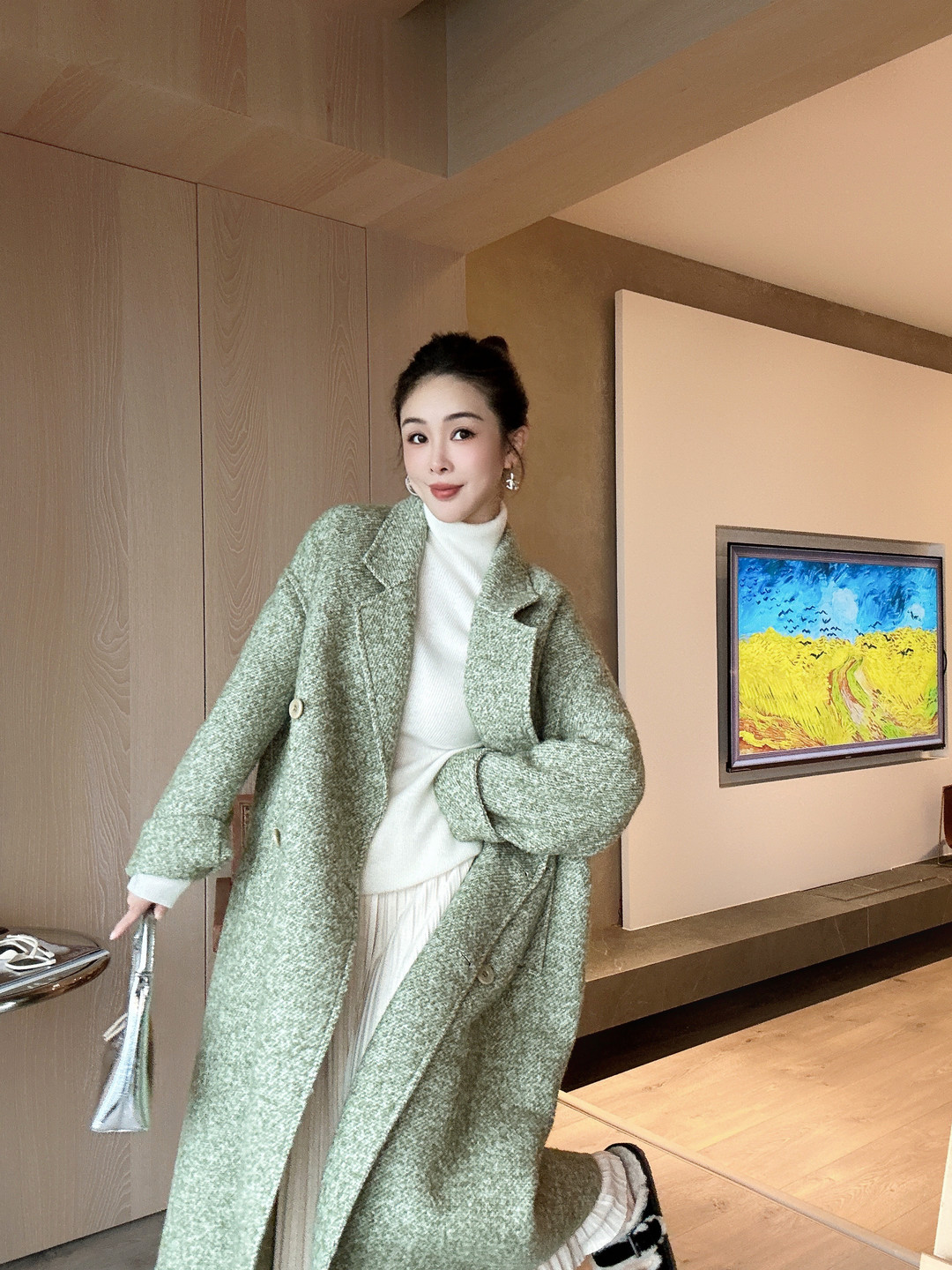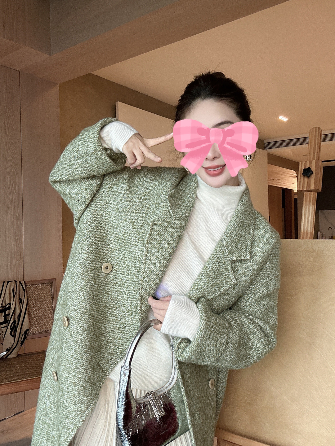 PIANAI冷小姐# 圈圈绒绿色羊驼毛长款六粒扣大衣