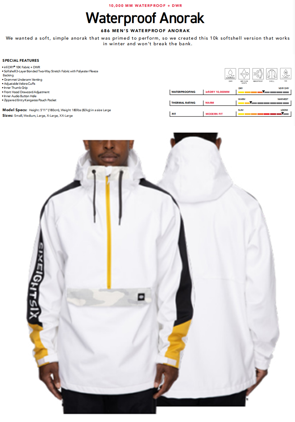 686 21-22 新款 Waterproof Anorak男款防套头雪服 白色