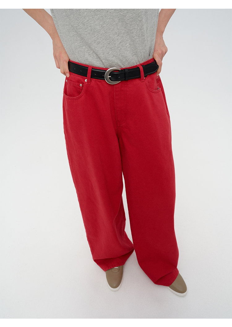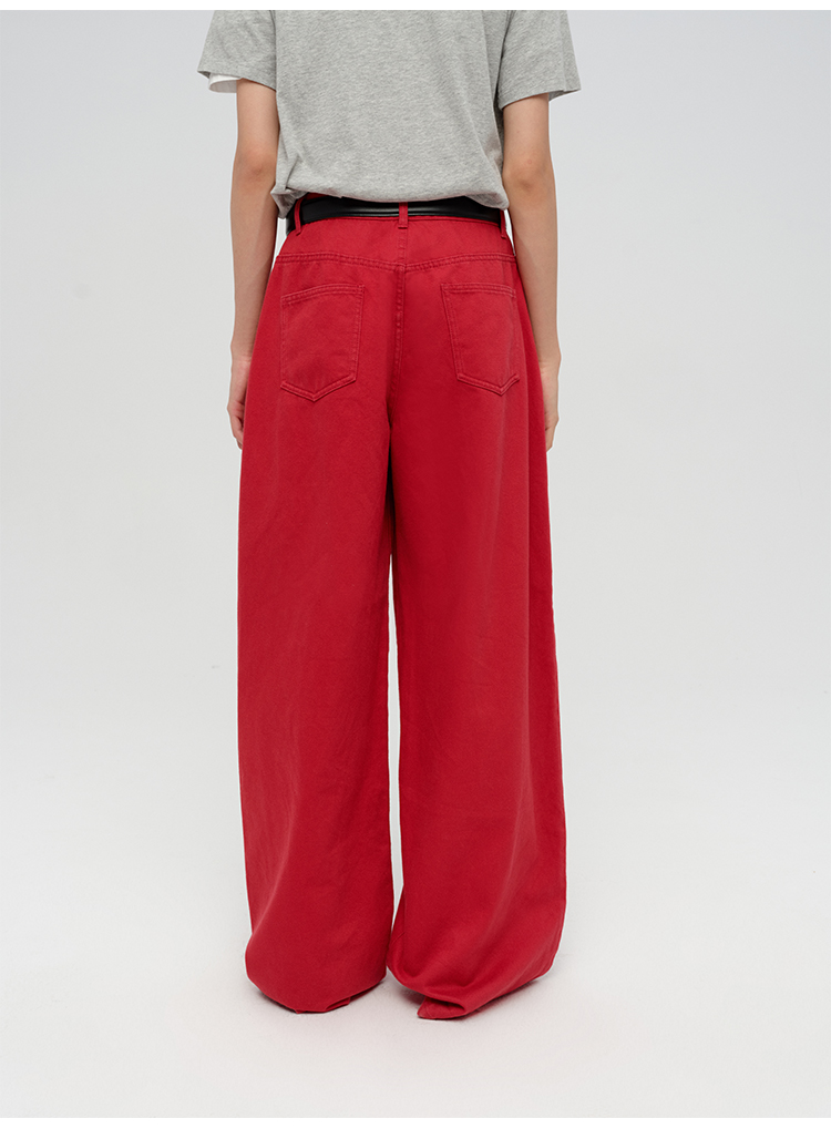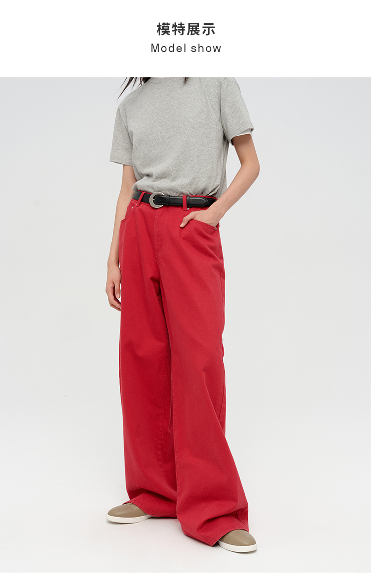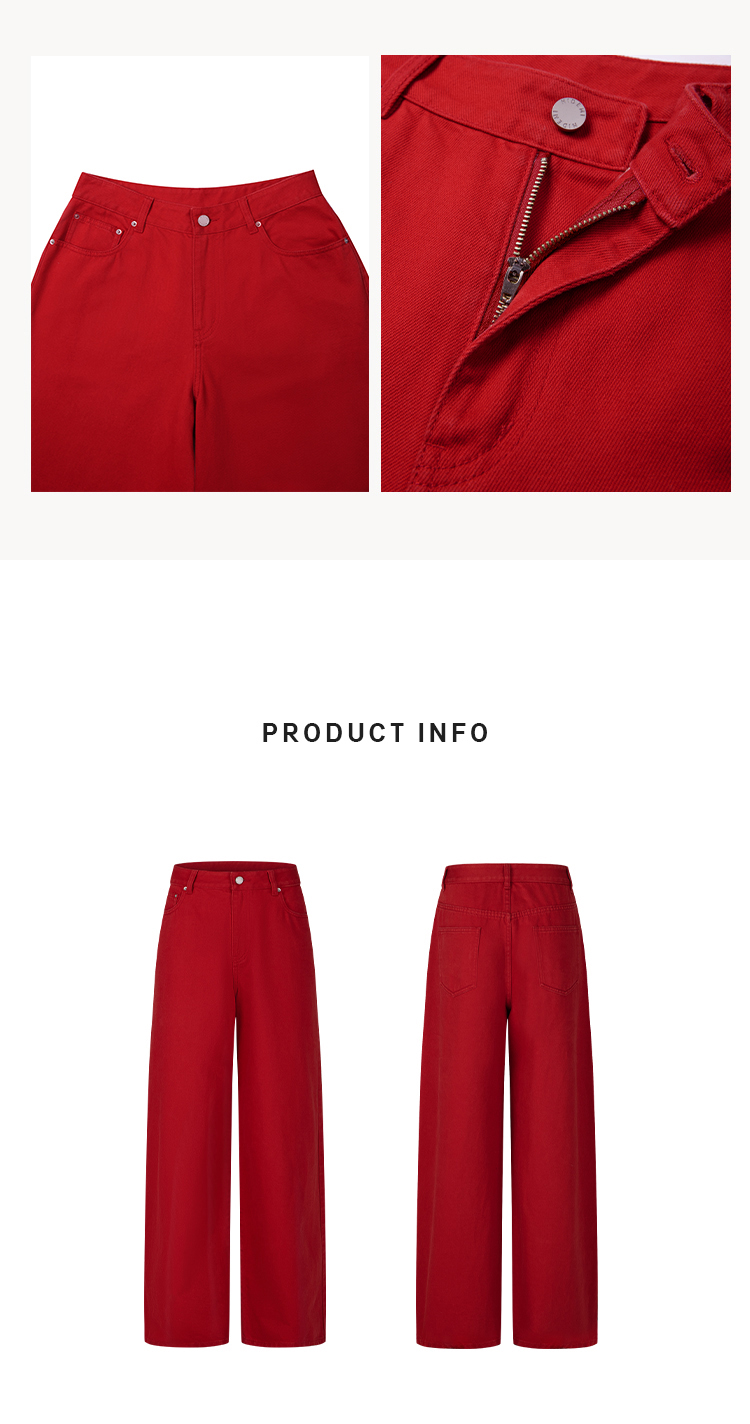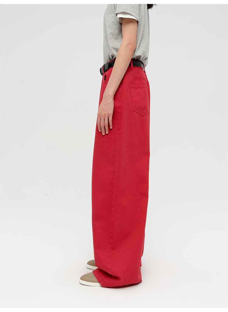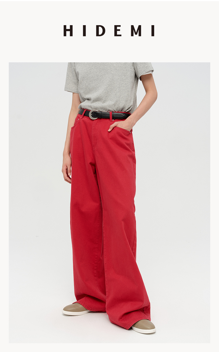 HIDEMI 复古红阔腿宽松中腰牛仔裤长裤