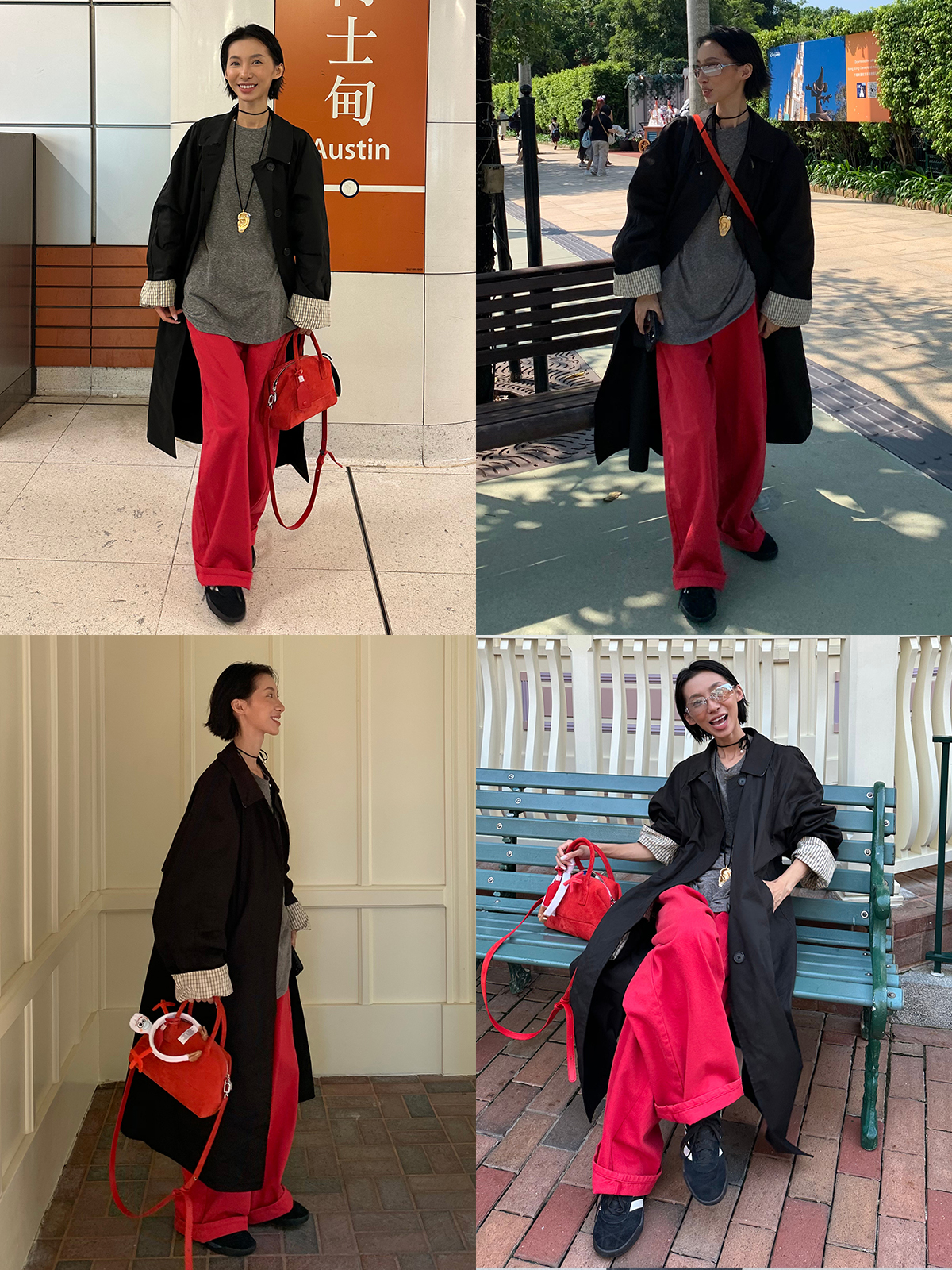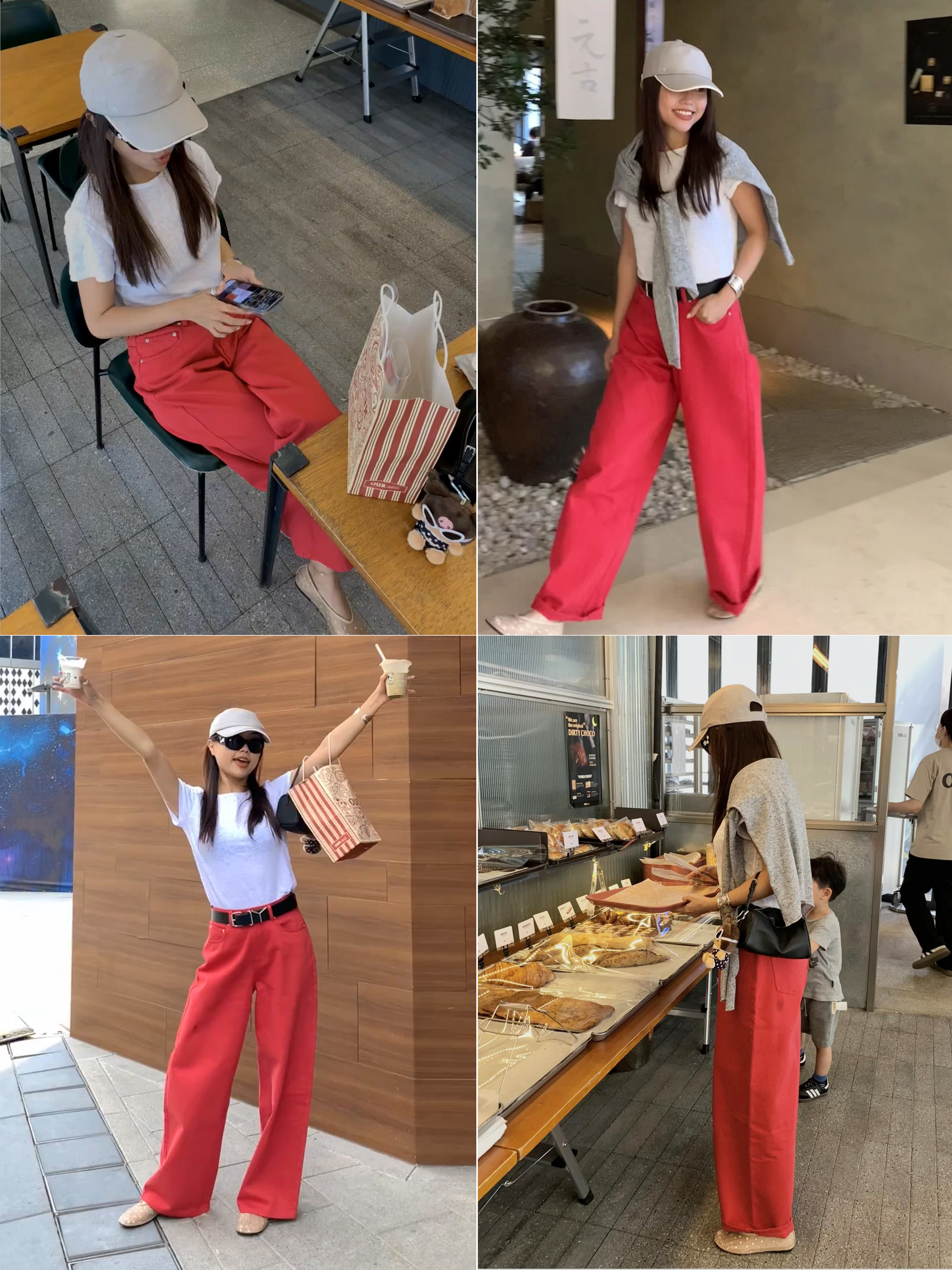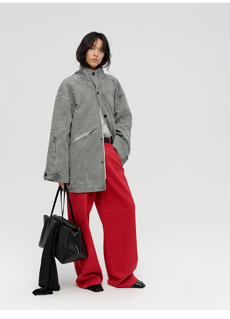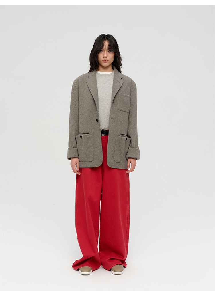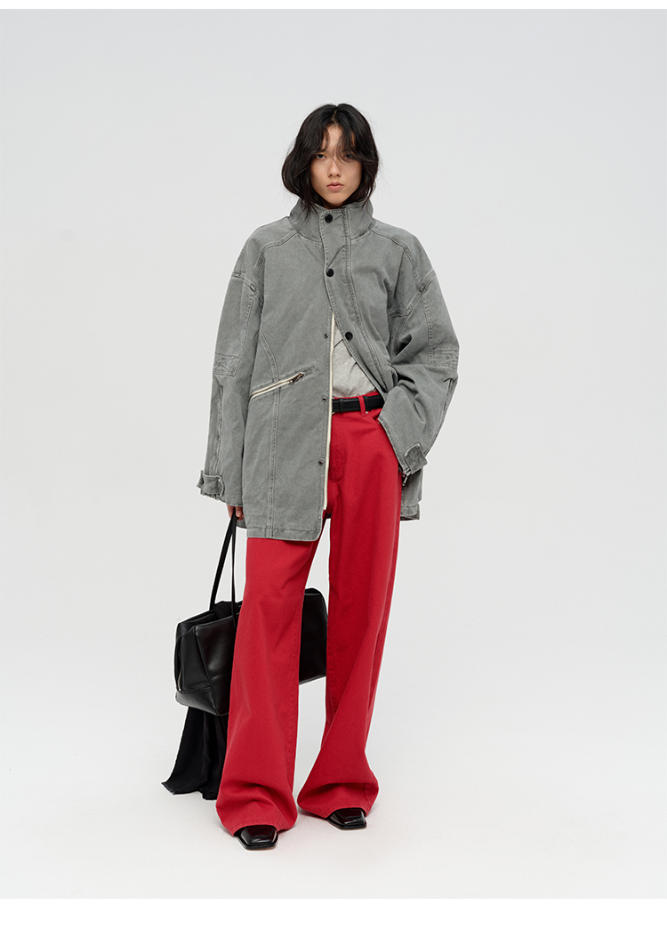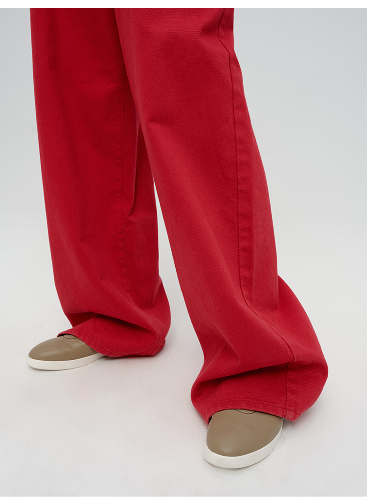 HIDEMI 复古红阔腿宽松中腰牛仔裤长裤