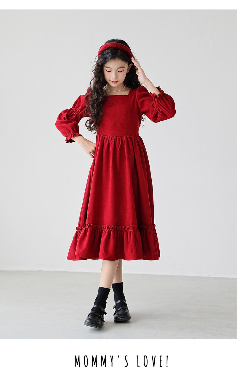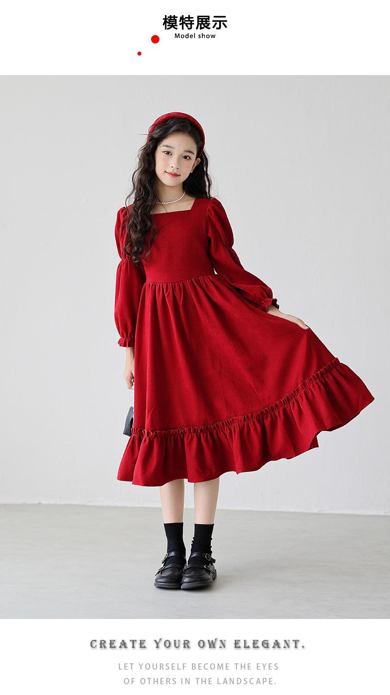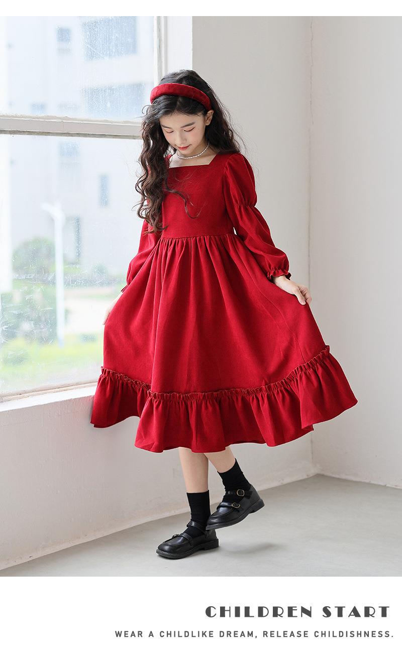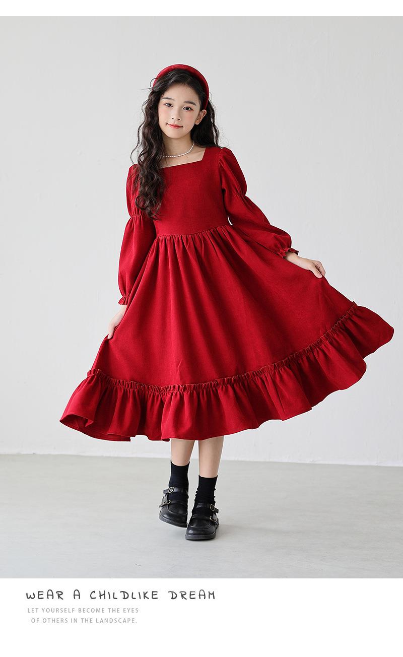 女童长袖连衣裙秋装春秋季新款儿童装公主裙女孩方领红色洋气裙子