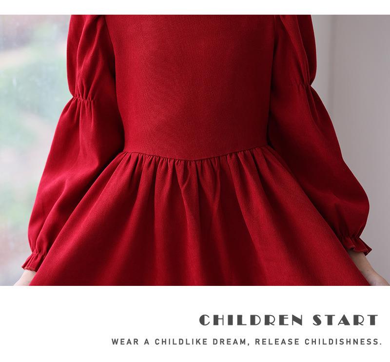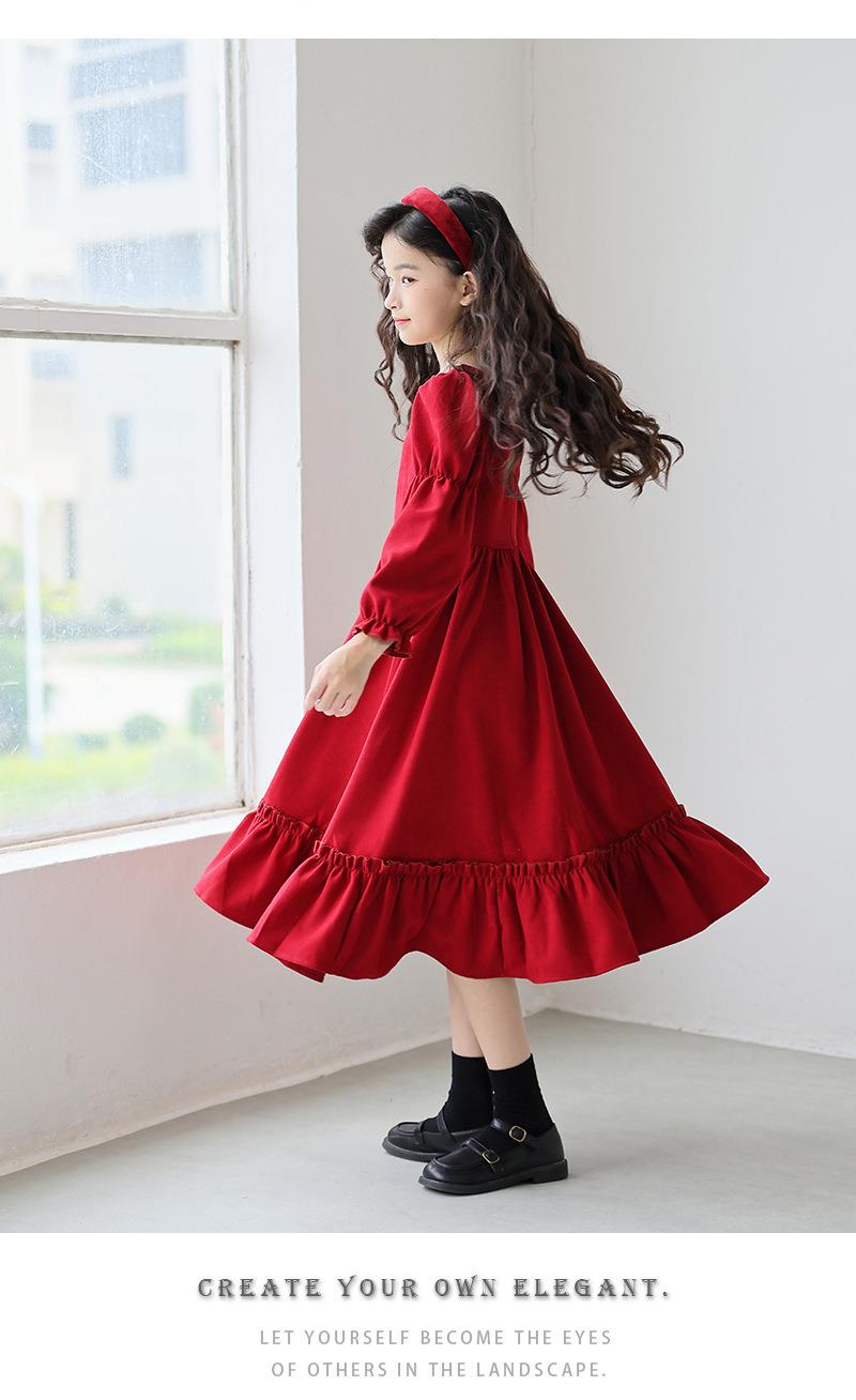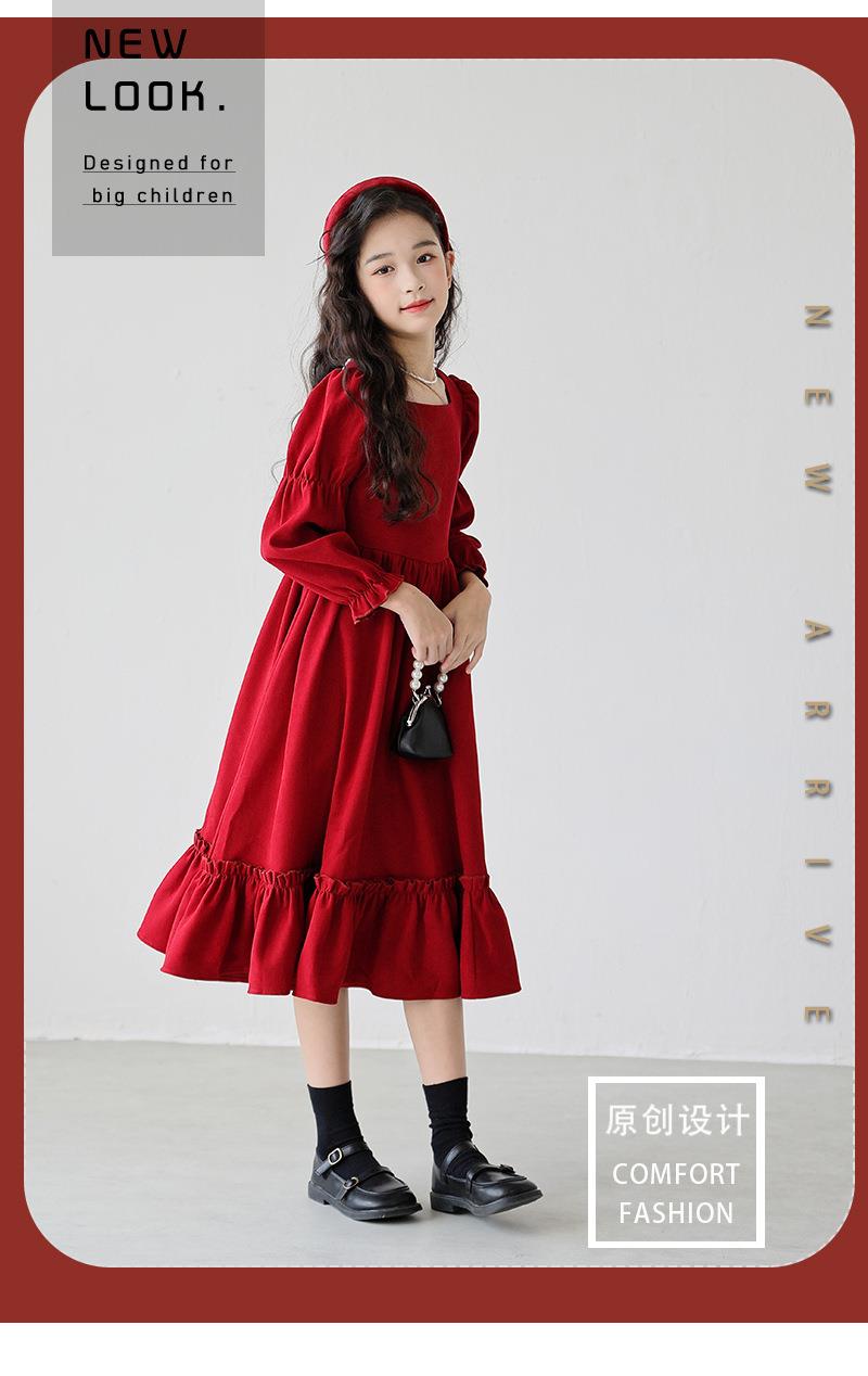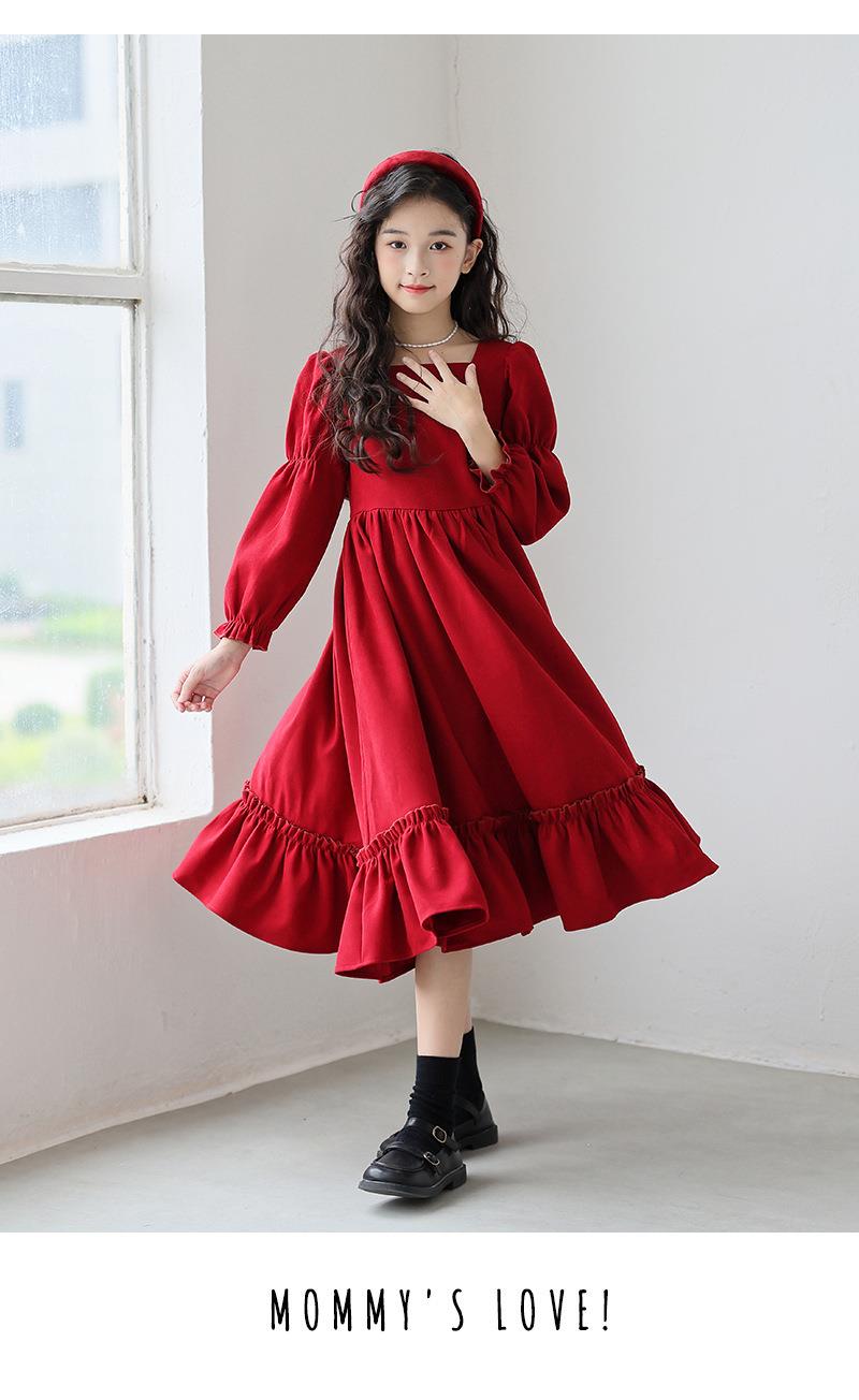女童长袖连衣裙秋装春秋季新款儿童装公主裙女孩方领红色洋气裙子