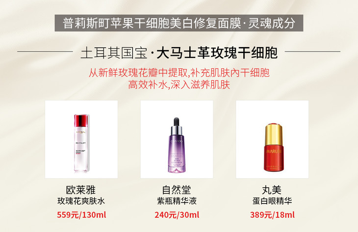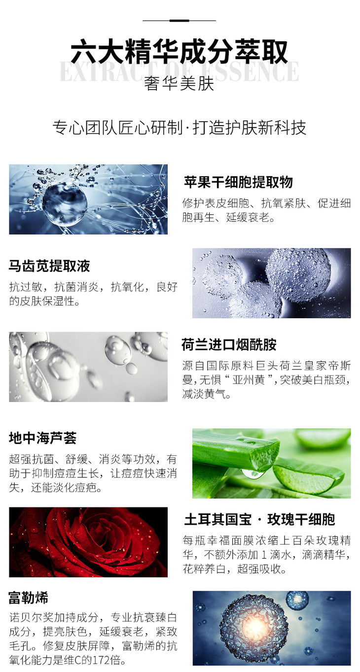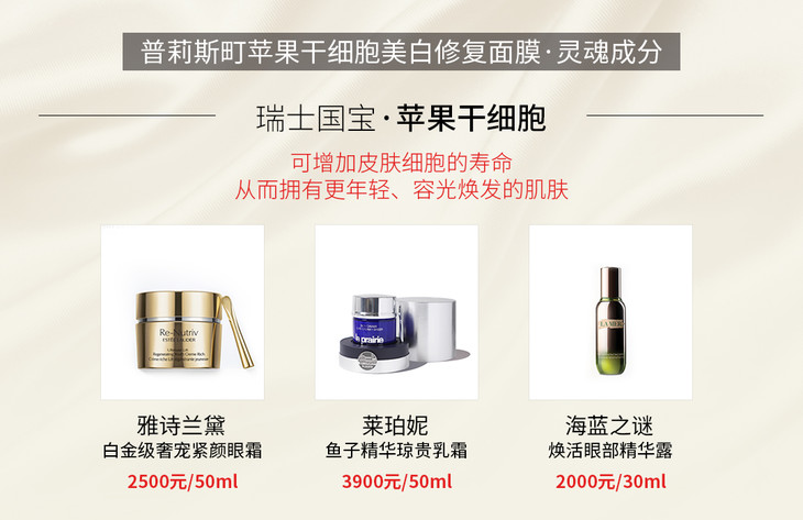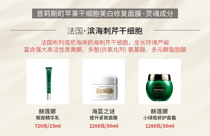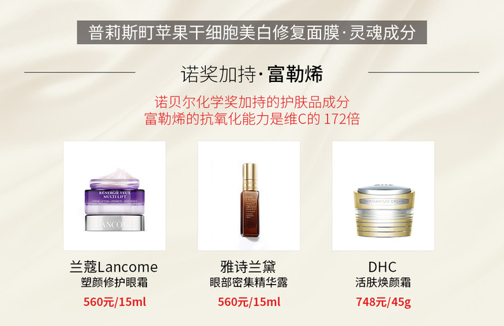 【核心成分】富勒烯、苹果干细胞提取物、海茴香干细胞、滨海刺芹干细胞、玫瑰干细胞、尿囊素、虾青素、白藜芦醇、视黄醇、芦荟;其中富勒烯大牌同成分兰蔻,雅诗兰黛小棕瓶也含有此成分;
