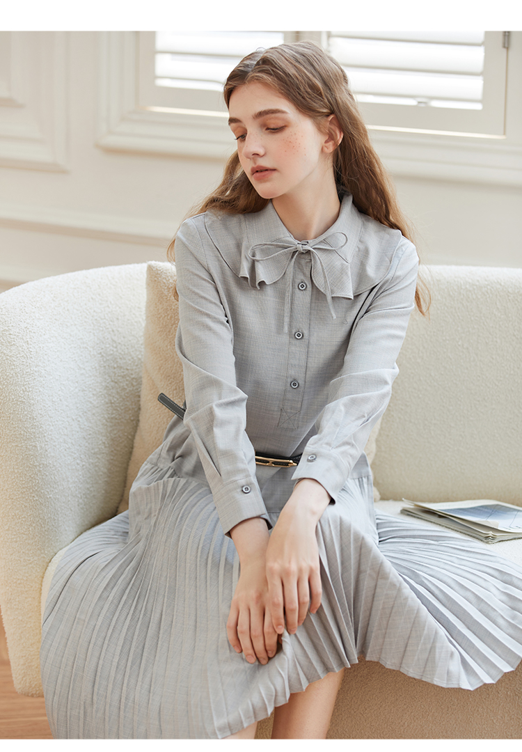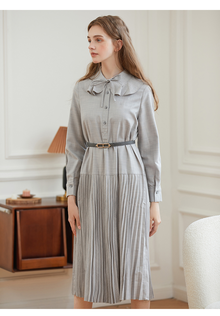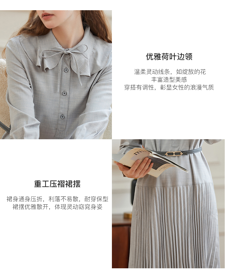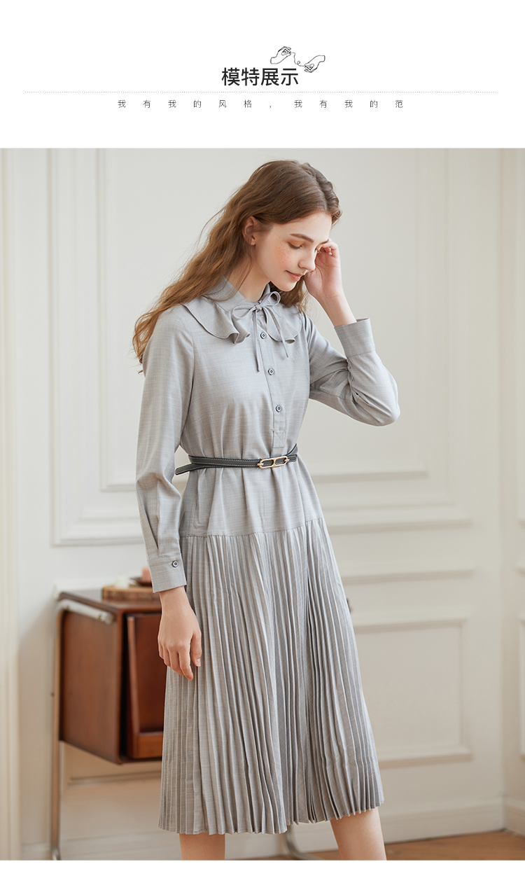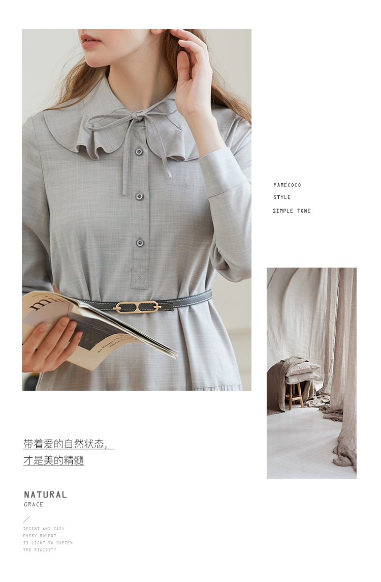 Famecoco范可儿荷叶领系带长裙气质收腰百褶连衣裙DAB6FA008