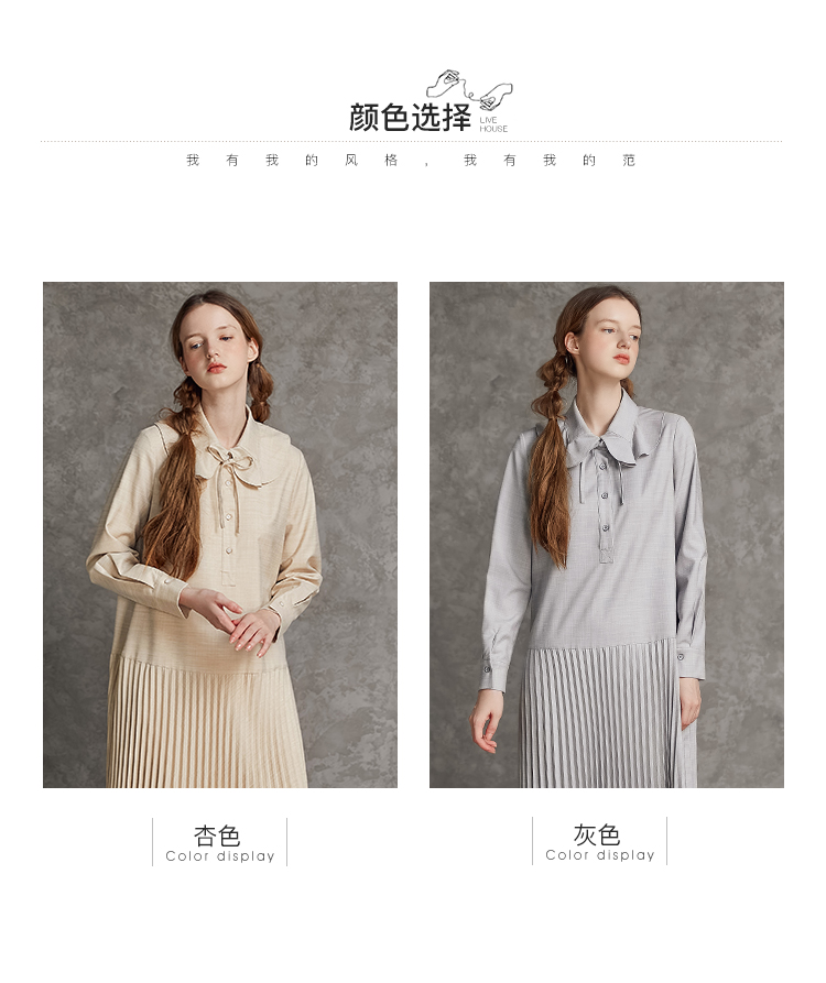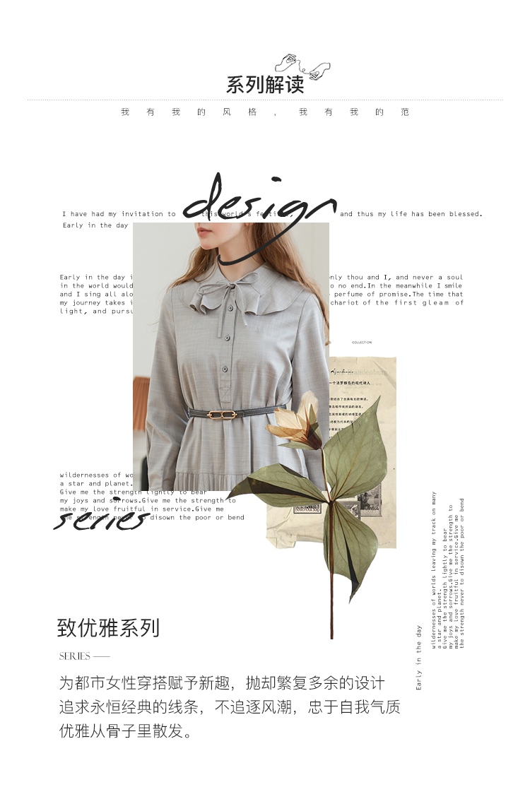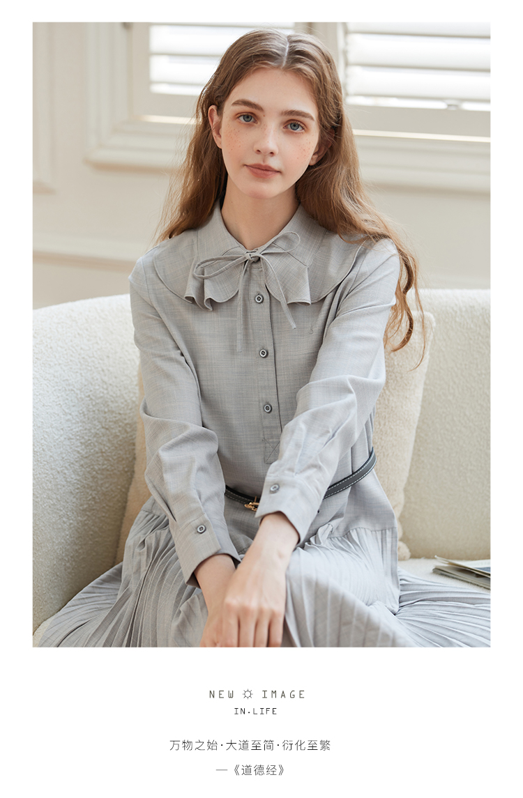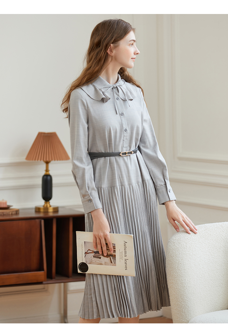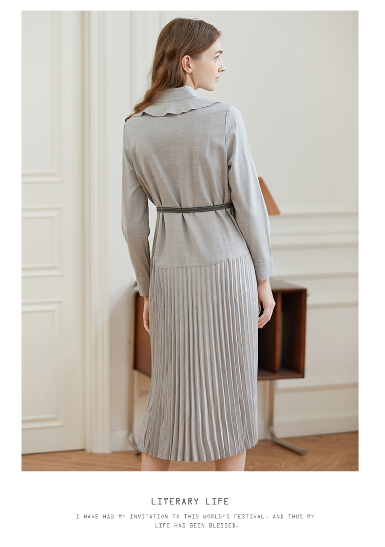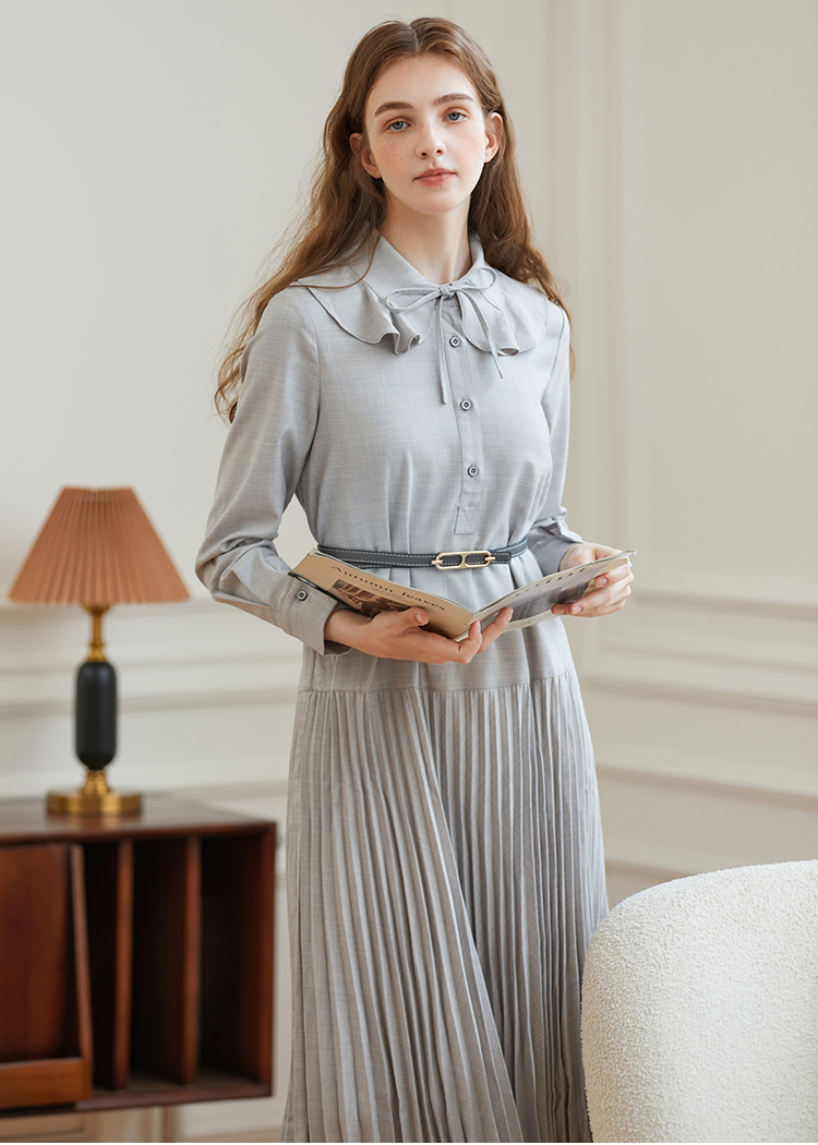 Famecoco范可儿荷叶领系带长裙气质收腰百褶连衣裙DAB6FA008