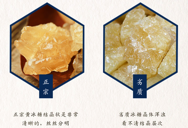 3,拒绝使用白砂糖冒充,拒绝染色冰糖冒充黄冰糖。