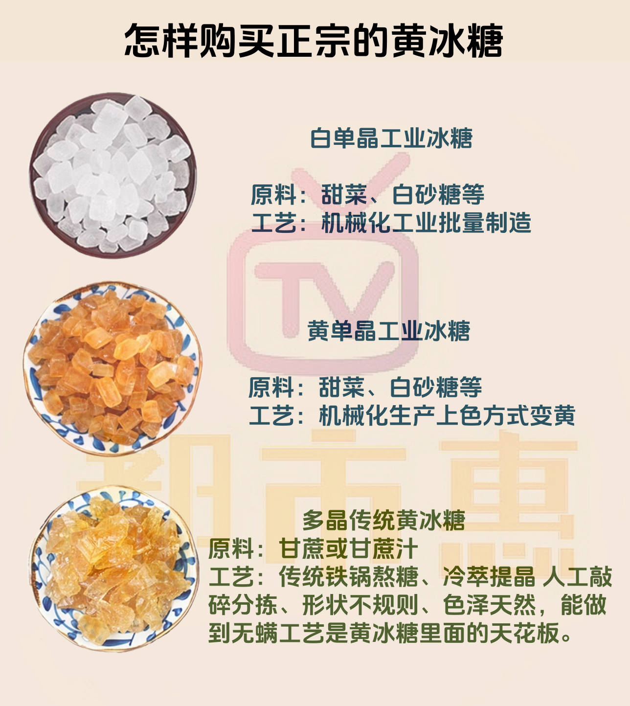 写在前面:我们很多观众印象中的冰糖都是白冰糖,黄冰糖比较正宗的市场上很少见。两款冰糖的制作工艺完全是两个概念。白冰糖说白了就是在白糖的基础上做提炼和结晶而成,属于单晶冰糖,市面上很常见。黄冰糖是纯甘蔗汁熬制自然结晶而成,保留了大量甘蔗原有的营养成分,正宗的黄冰糖才是我们说的老冰糖。