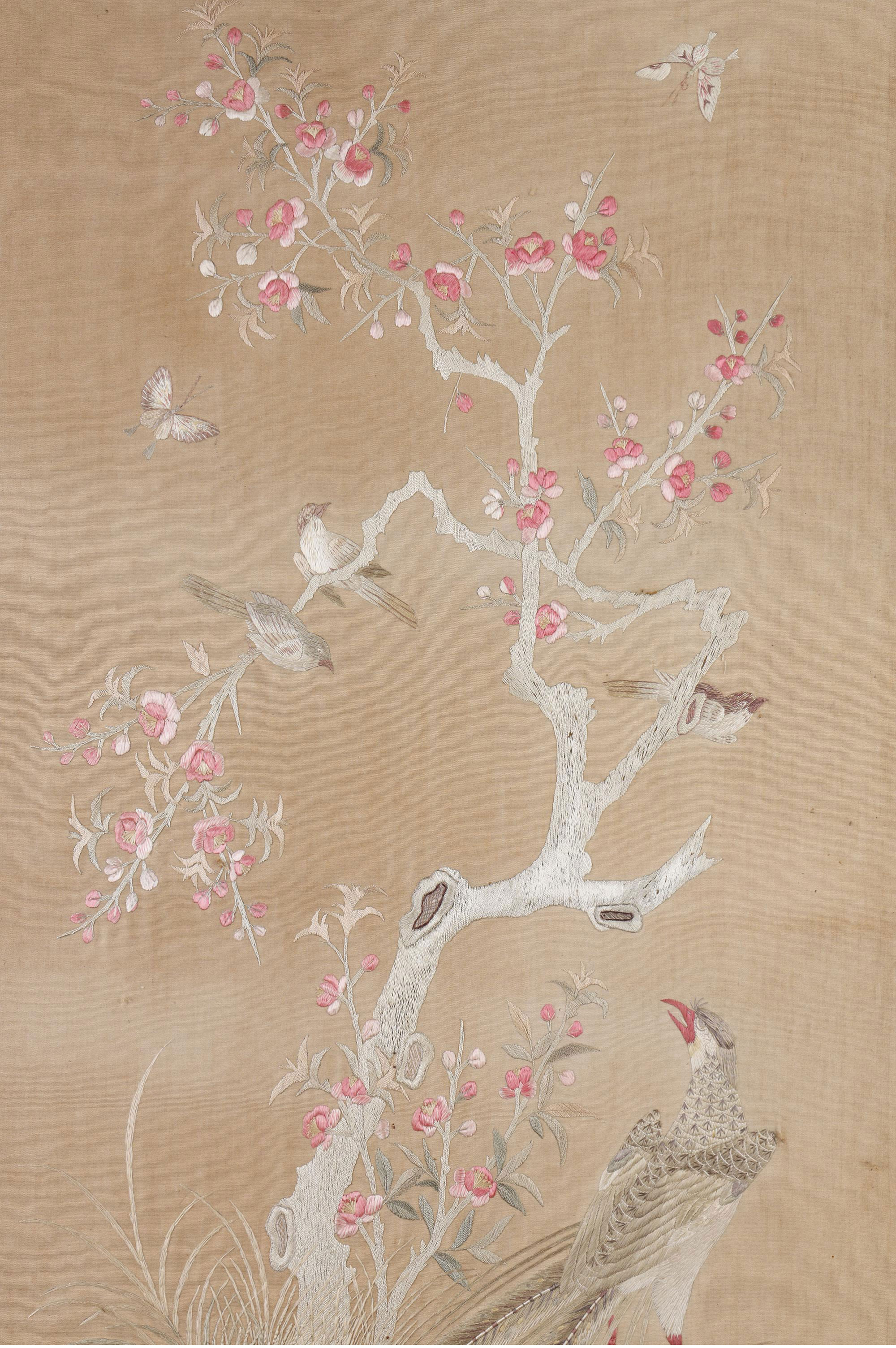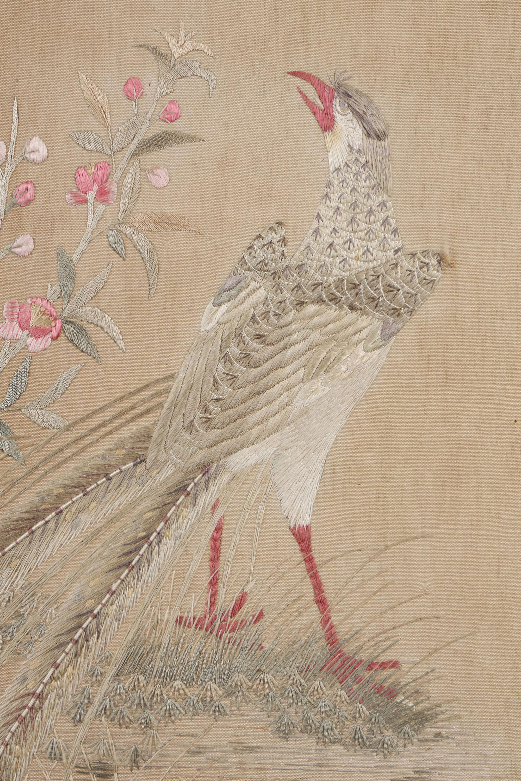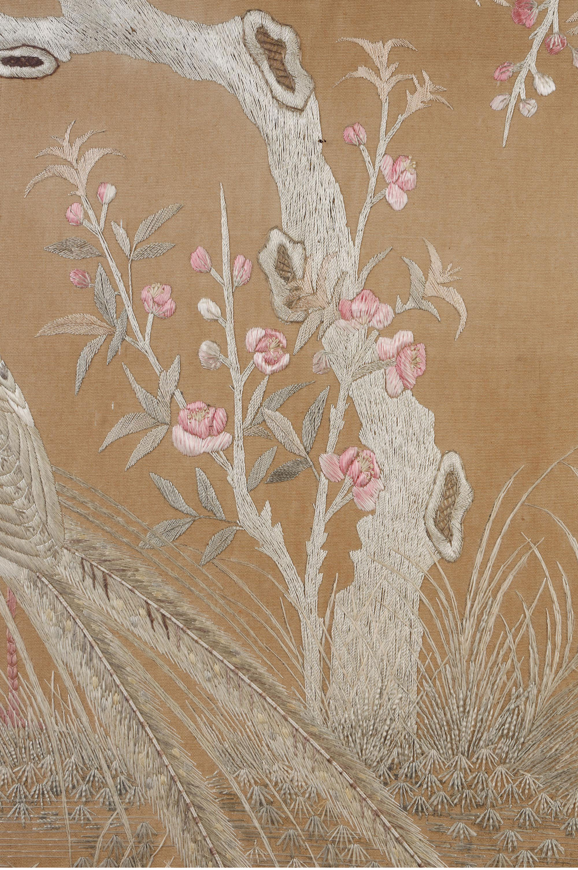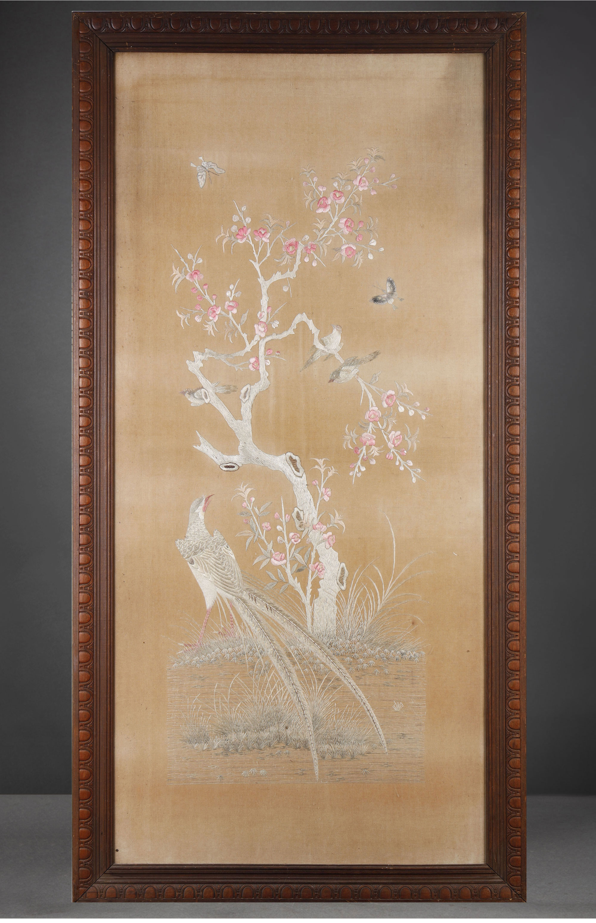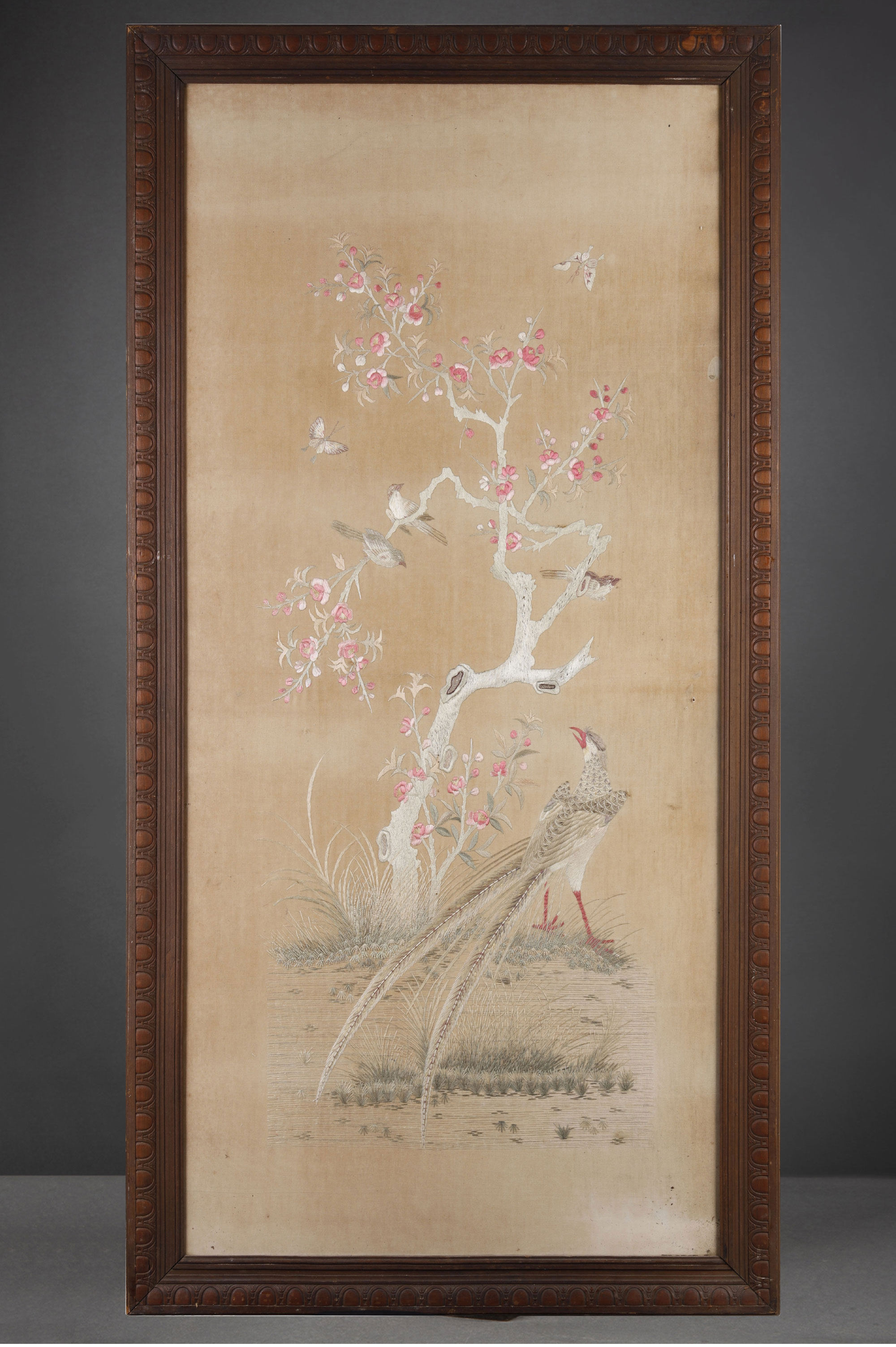 19世纪中国出品「桃花双绶」主题苏绣挂屏一对