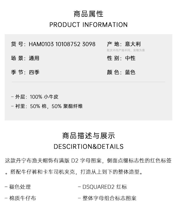 DSQUARED2 中性字母徽标标签牛仔渔夫帽 蓝色 HAM0103 10108752 3098