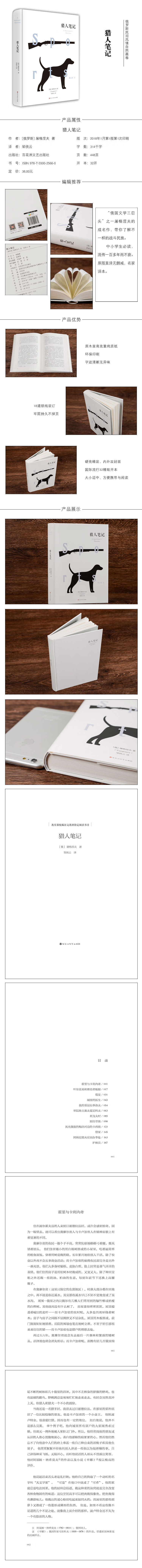 《猎人笔记》是俄国作家屠格涅夫的代表性作品。全书共25个短篇故事,主要通过猎人的狩猎活动,讲述了19世纪中叶俄国农村生活的状况。故事均以美丽的自然风景为衬托,展示了地主阶级对农民的奴役以及农民的智慧、朴实和善良,画面真实可感,色彩斑斓,感情真挚深沉,撩人心弦。