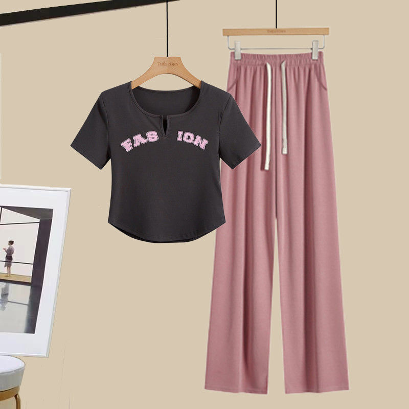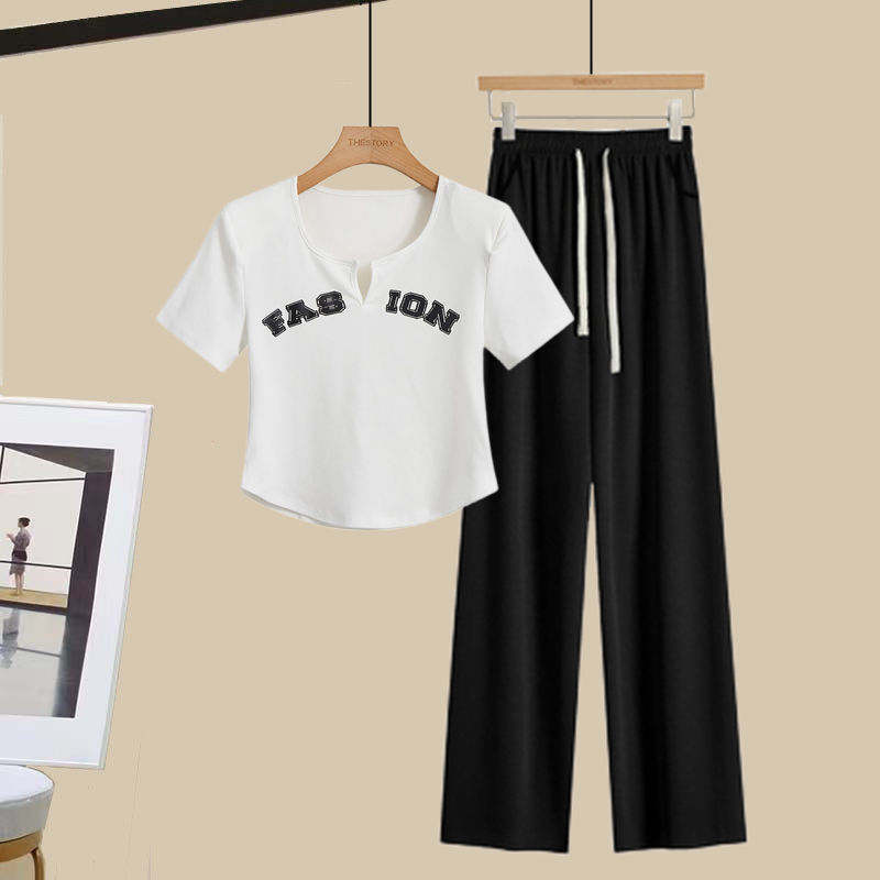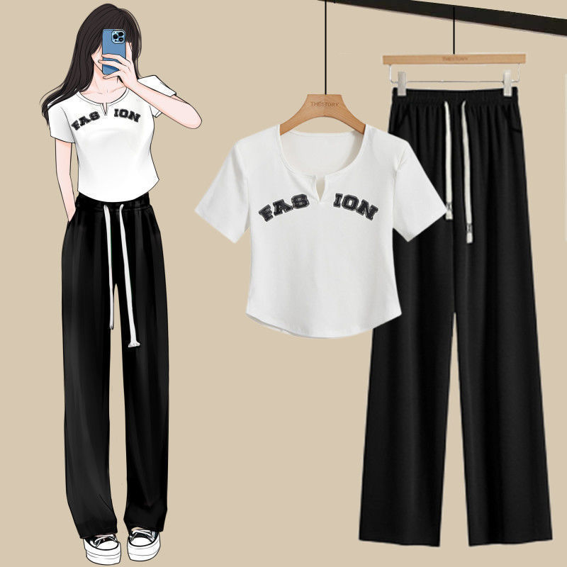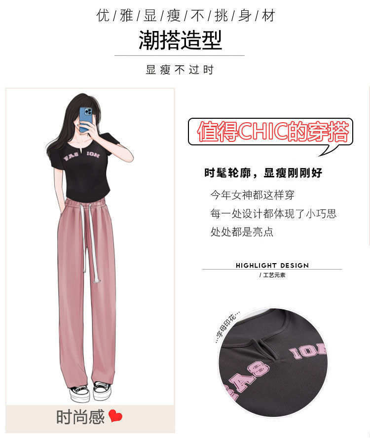 【潮搭造型,显瘦不过时】黛唯梵网红爆款时尚冰丝套装女,夏季短袖T恤,设计感小众ins甜辣显瘦阔腿裤两件套热卖